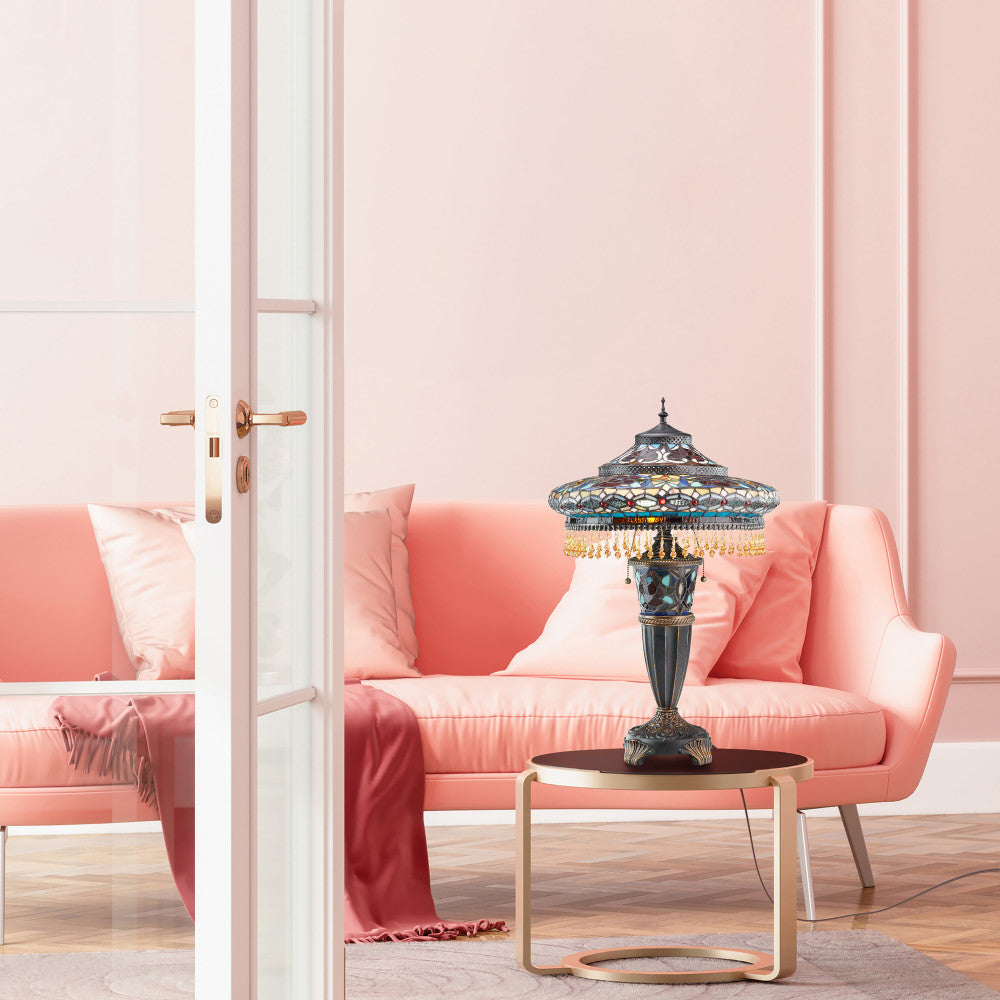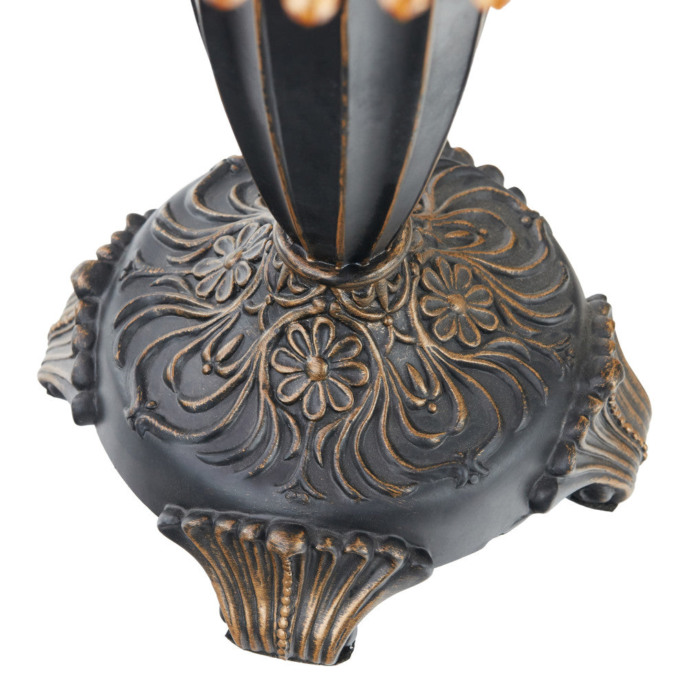 Features a cylinder-shaped polyresin base with a bell-shaped stained glass shade