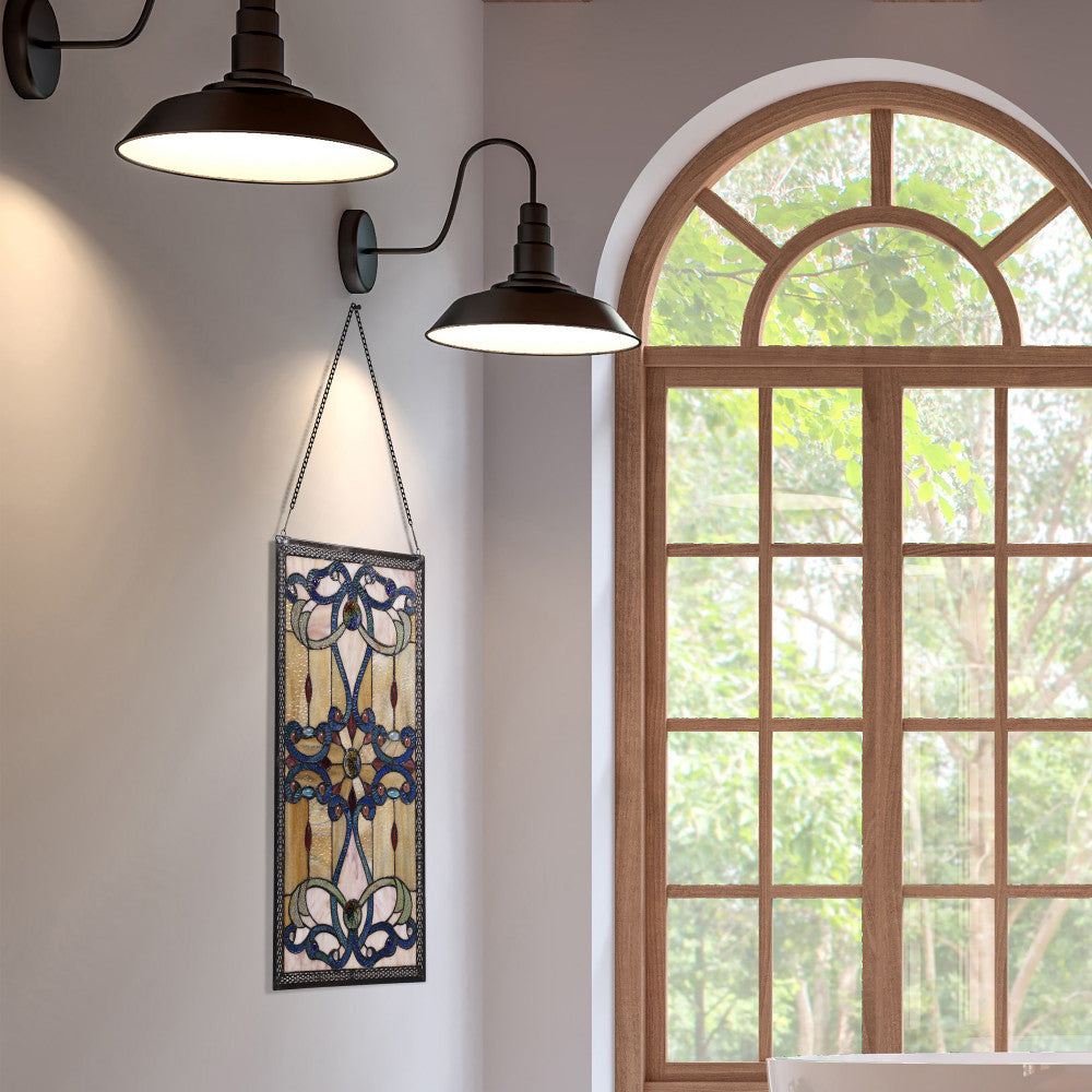 Lavishing swirls! This panel is the perfect compliment to your Brandi Lamps or Ceiling Fan. The Brandi collection features delicate real stained glass ribbons, glass Rosettes and marquee cabochons. When placed in a window these panels come to light!