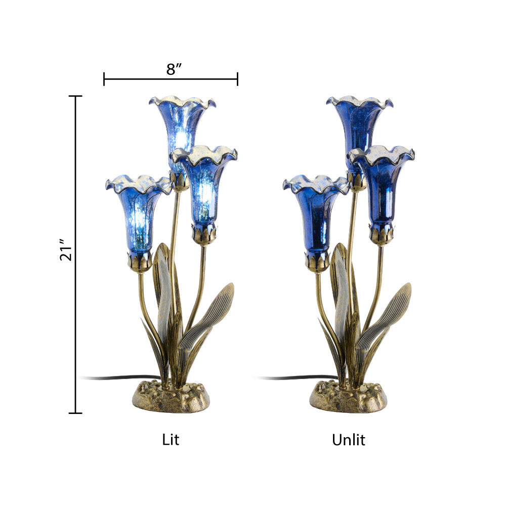 Bold beauty! This 3 lily uplight accent lamp is handcrafted with gorgeous, blue mercury glass. The lily shades have a vibrant color that will create a breathtaking focal point to any space. The base is made with 100% hand cast metal and the overall craftsmanship is absolutely exquisite! The lily shades are interchangeable, so if you ever want a quick decor change, simply purchase additional shade colors, get creative and make your own color design! The possibilities are endless! River of Goods offers replacement lily shades in a variety of colors.