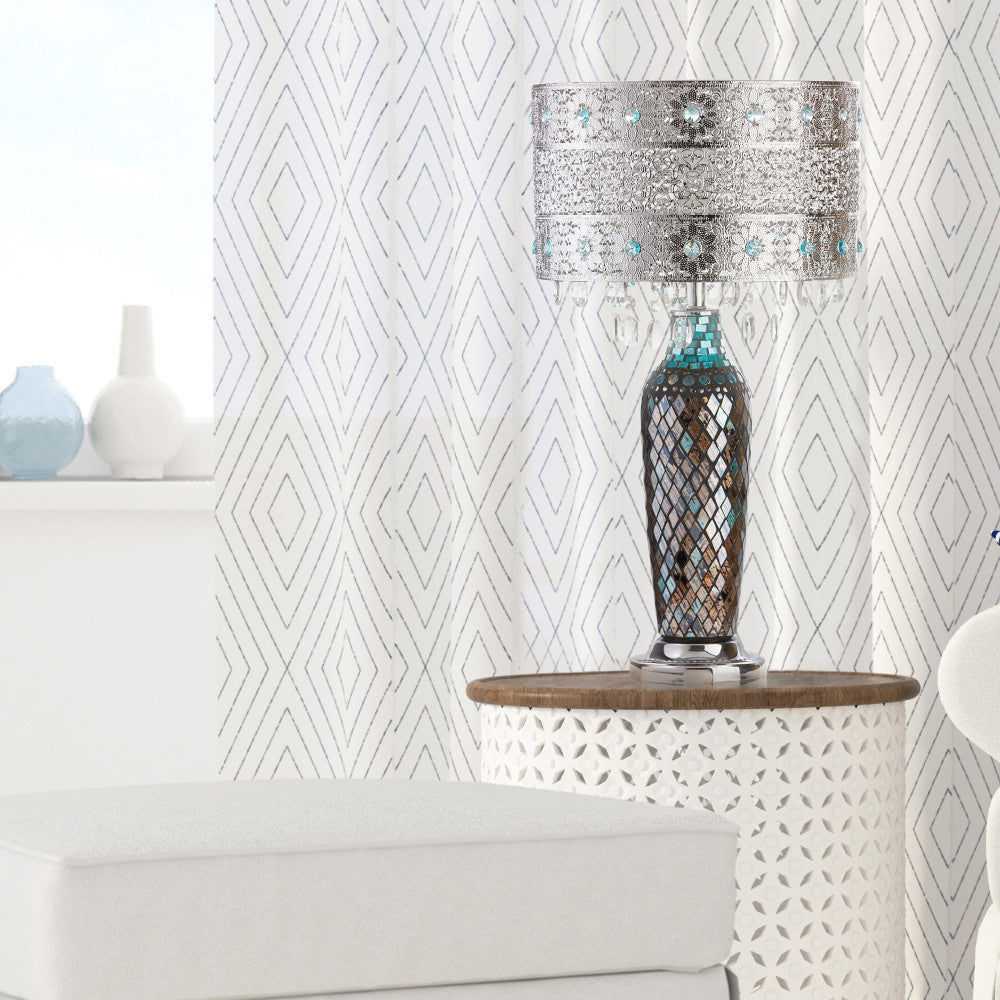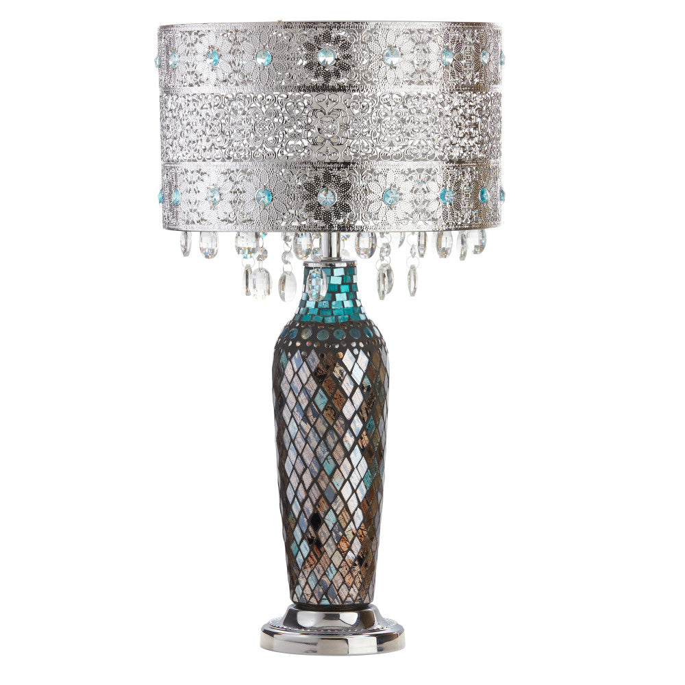 Life is fun and free! So is this beautifully crafted crystal beaded table lamp with mosaic glass base. The metal shade features a lace work pattern, turquoise gems, and clear hanging crystals. The base is a mosaic glass design with silvers and blues. Each piece alone is stunning, but put them together and you have a showstopper! Great for a forgotten corner of your living room, or as a focal point in the bedroom. Bring in the light and glitter!