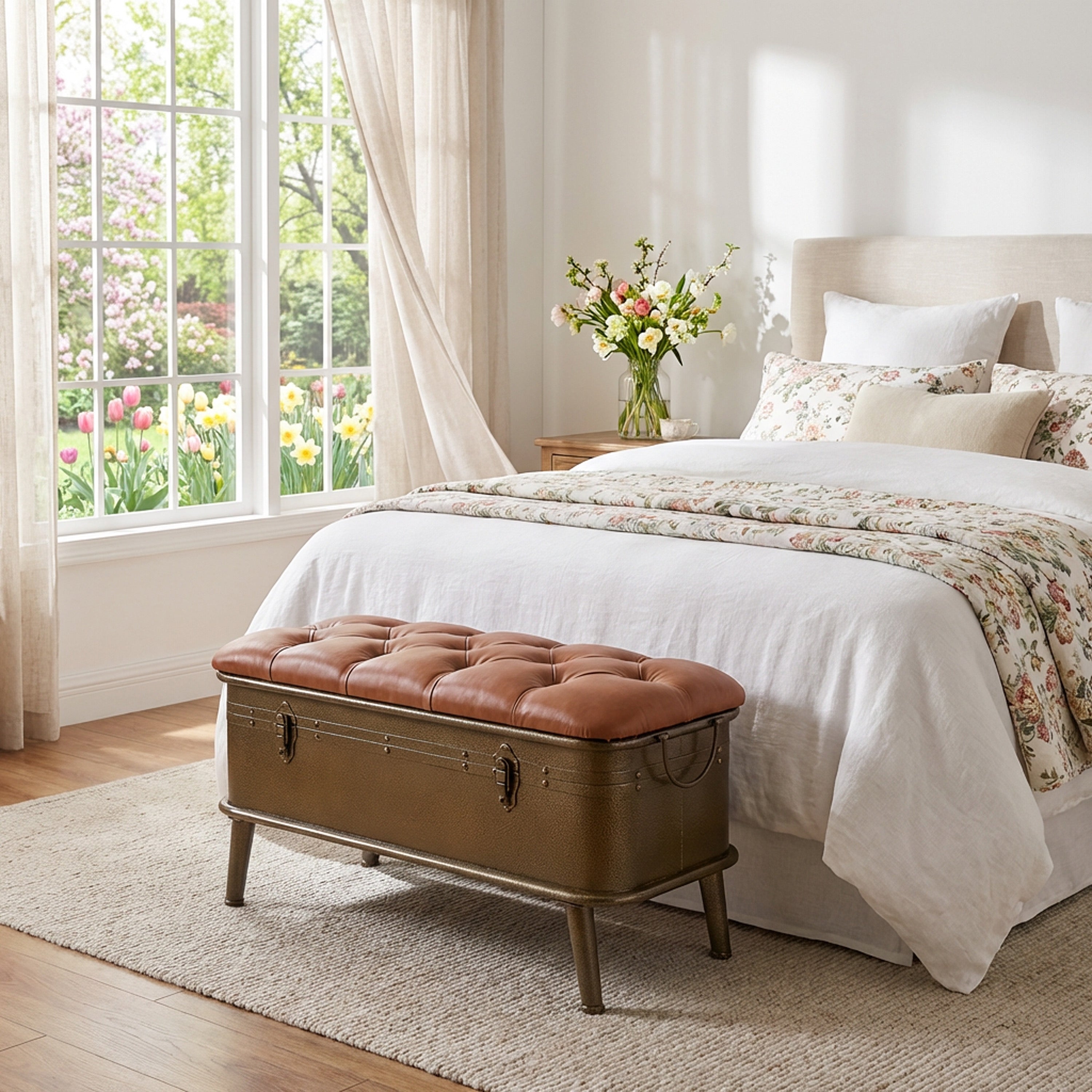 17"H Tufted Faux Leather & Distressed Metal Storage Bench