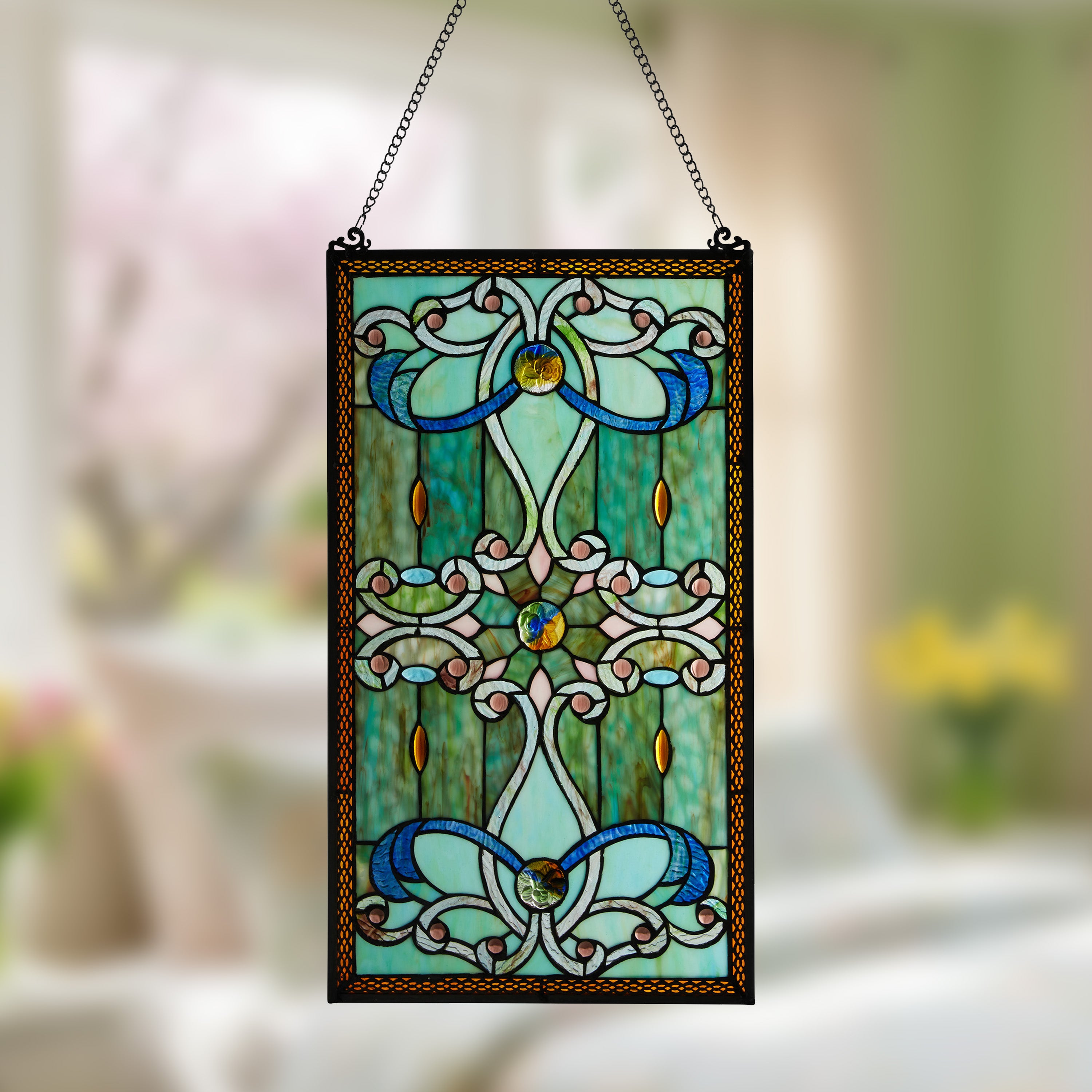 Lavishing swirls! Inspired by one of our best-selling designs, this 26"H window panel features the same delicate ribbons, glass rosettes and marquee cabochons. This piece is crafted with high end ripple glass. The panel, made of 206 pieces of glass, 32 cabochons, and 3 hand-poured glass rosettes, is framed with a basket weave filigree. When placed in a window these panels come to light! They can be hung on a wall as well. Use it to create privacy without blocking the natural light.