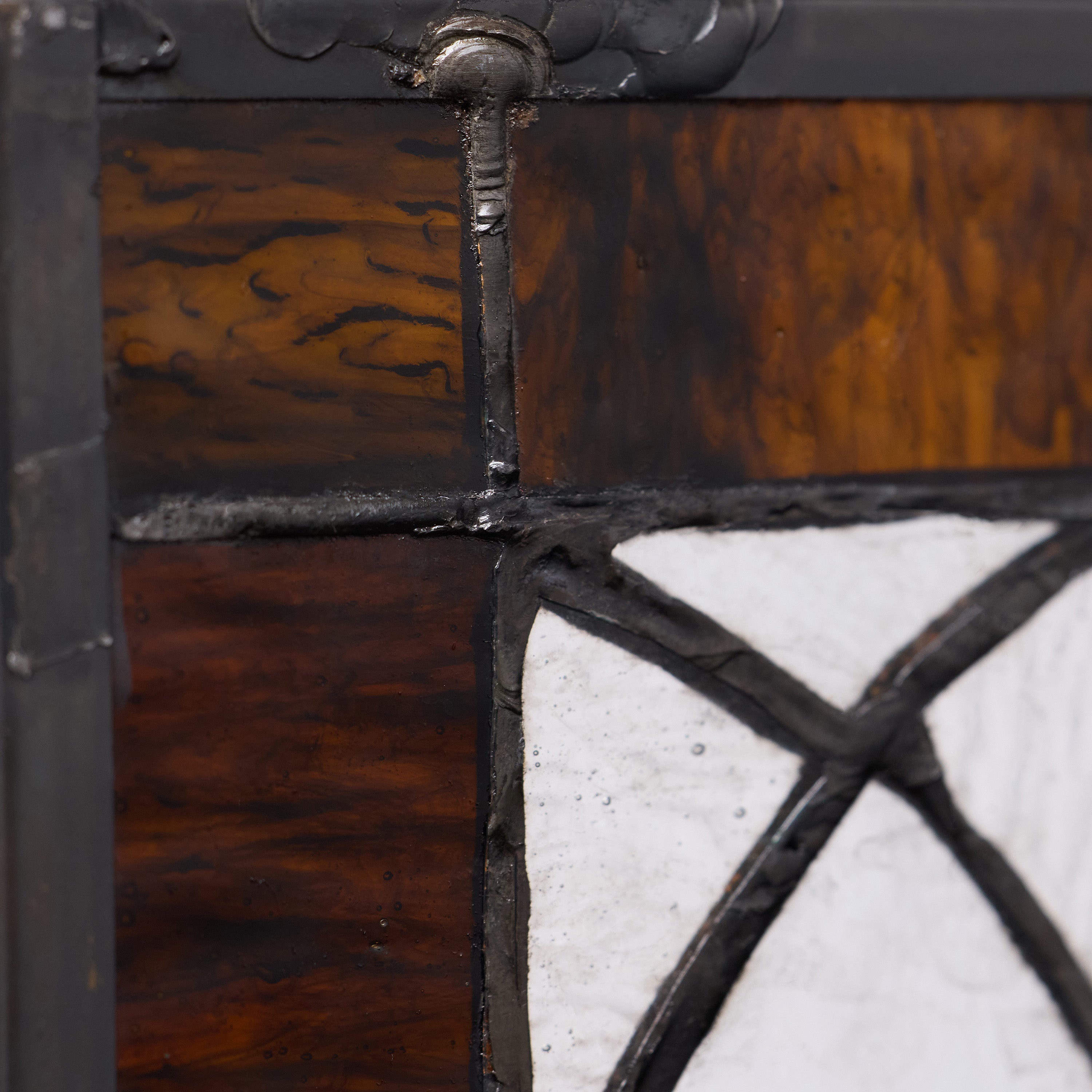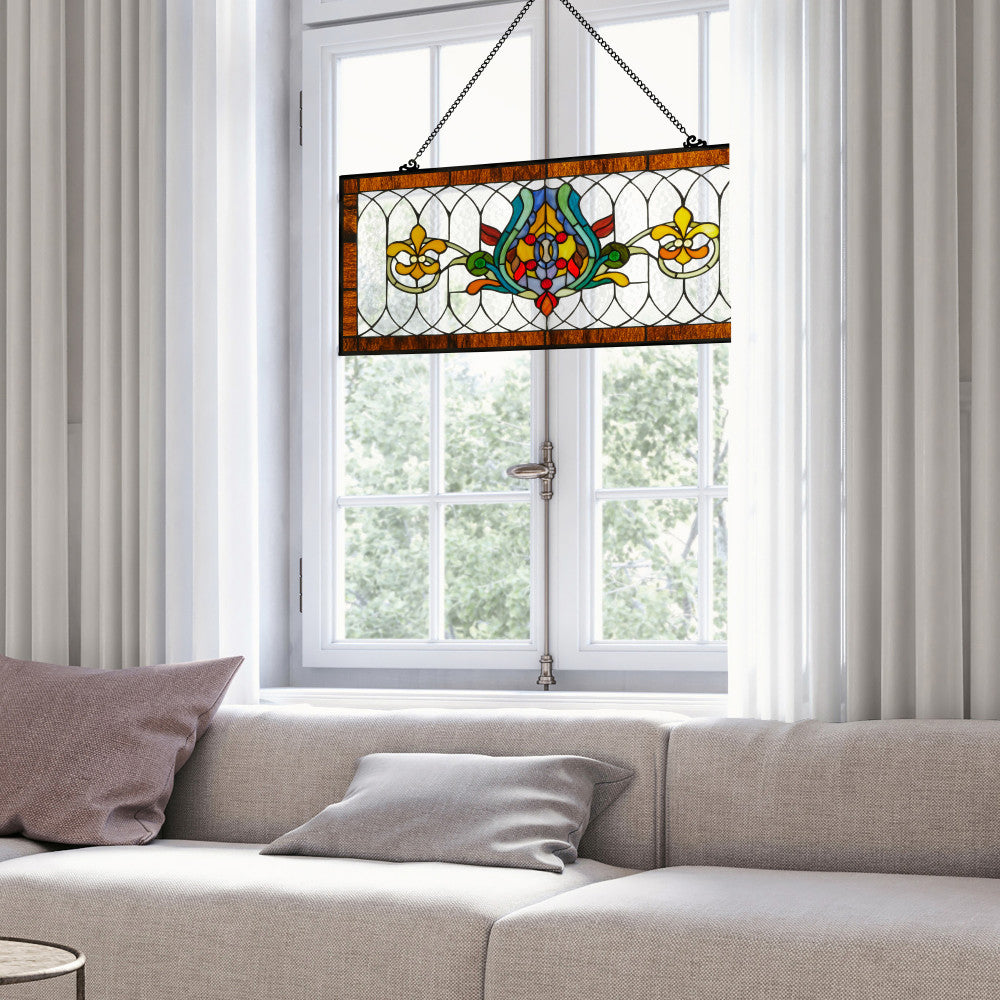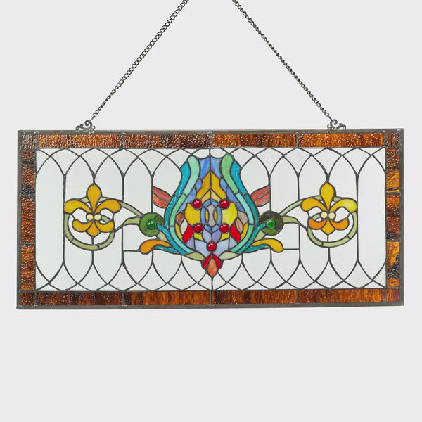 Ravishing plays of color. The traditional Fleur de Lis pattern fits well with all decors. This 30"L swirling real glass designed in rich artisan, hand cut glass. Hang it in a window for a regal array of colors or on a wall to accent a room. Bring color into your home or pub with this beautifully handcrafted window panel.
