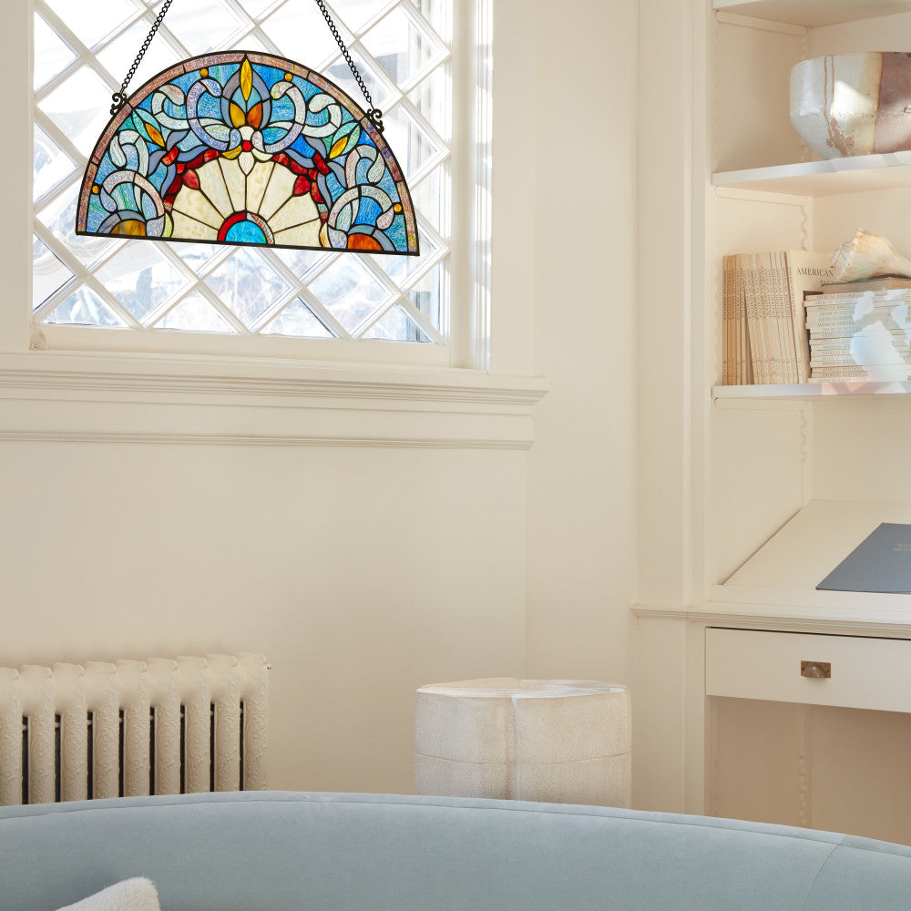 Classically Modern. Handcrafted using the same techniques that were developed by Louis Comfort Tiffany in the early 1900's, this beautiful Tiffany Style piece contains hand cut glass and real glass cabochons. This unique 22"L Victorian Style window panel features colors of sea blue and green with hints of red and plum. Ripple, striated, mottled, and slate glass and cabochons produce deep movement. Hang it in a window for a kaleidoscope of colors or on a wall to accent a room.