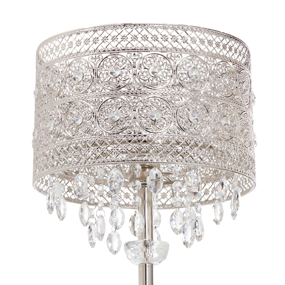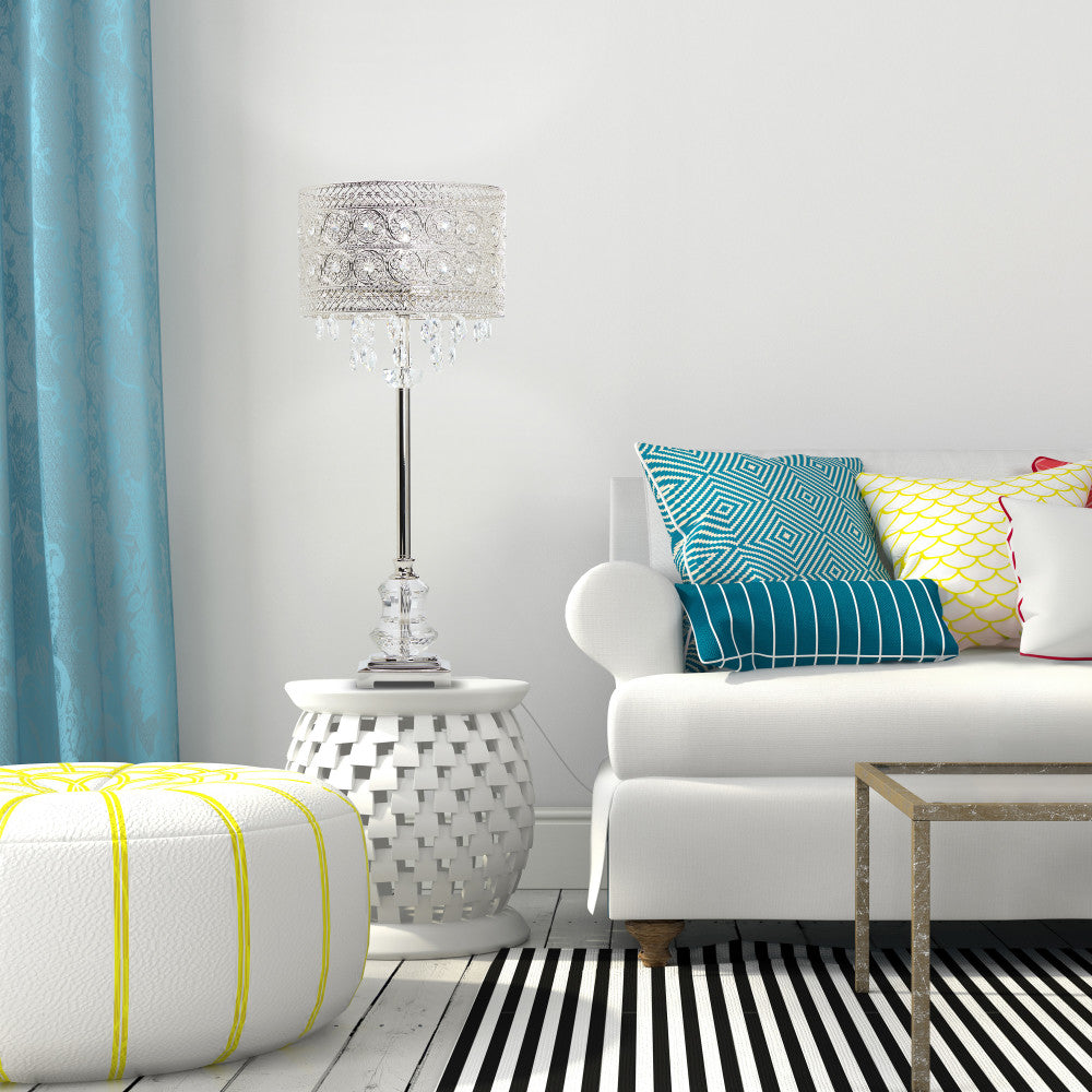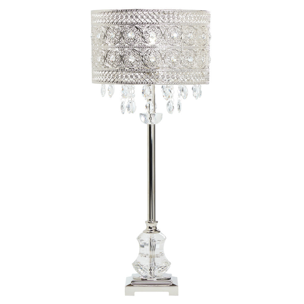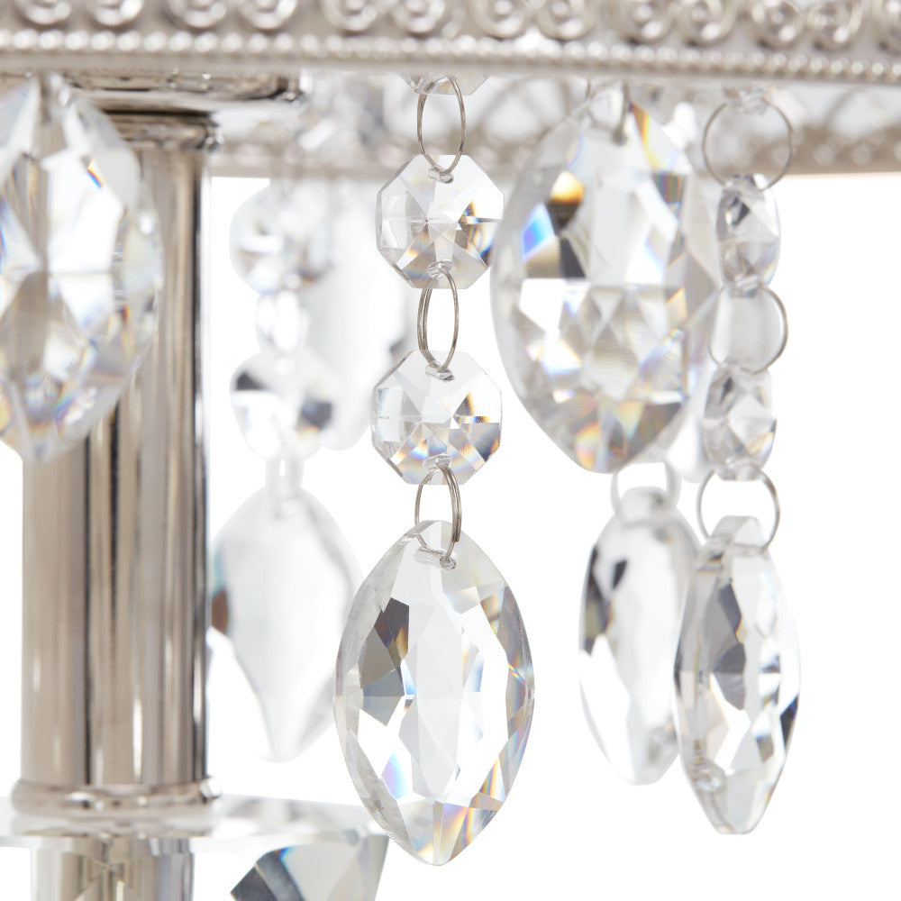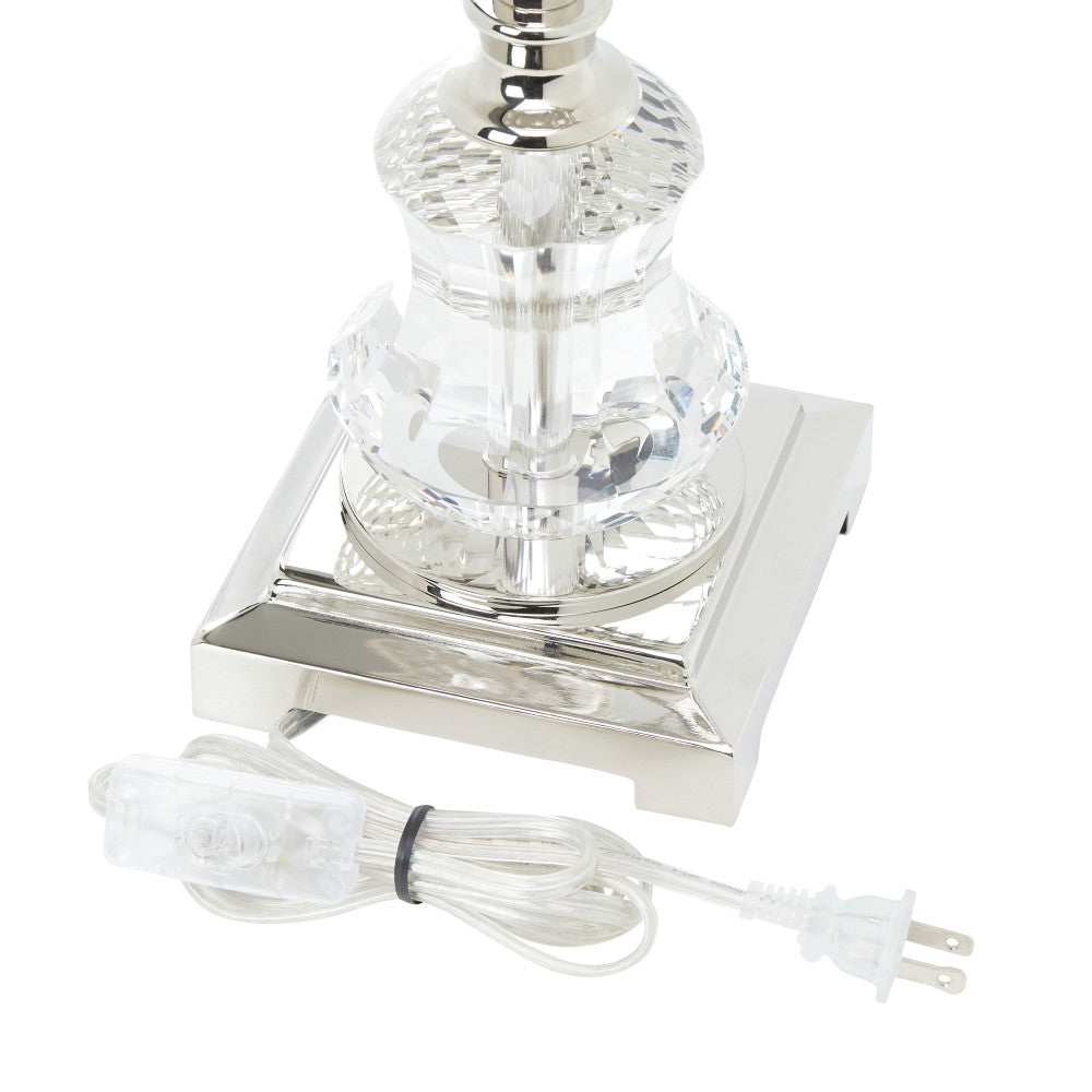 Make a statement with this polished nickel and K-9 crystal jewel 1-light buffet table lamp. Showcasing a square polished nickel base, this 28.75"H table lamp is perfect for modern or glam decor styles. The shade features a polished nickel medallion pattern, with multi-layers of more than 55 hanging faceted clear K-9 crystal jewels on the inside of the shade. A luxurious piece for your living room, bedroom or office space.