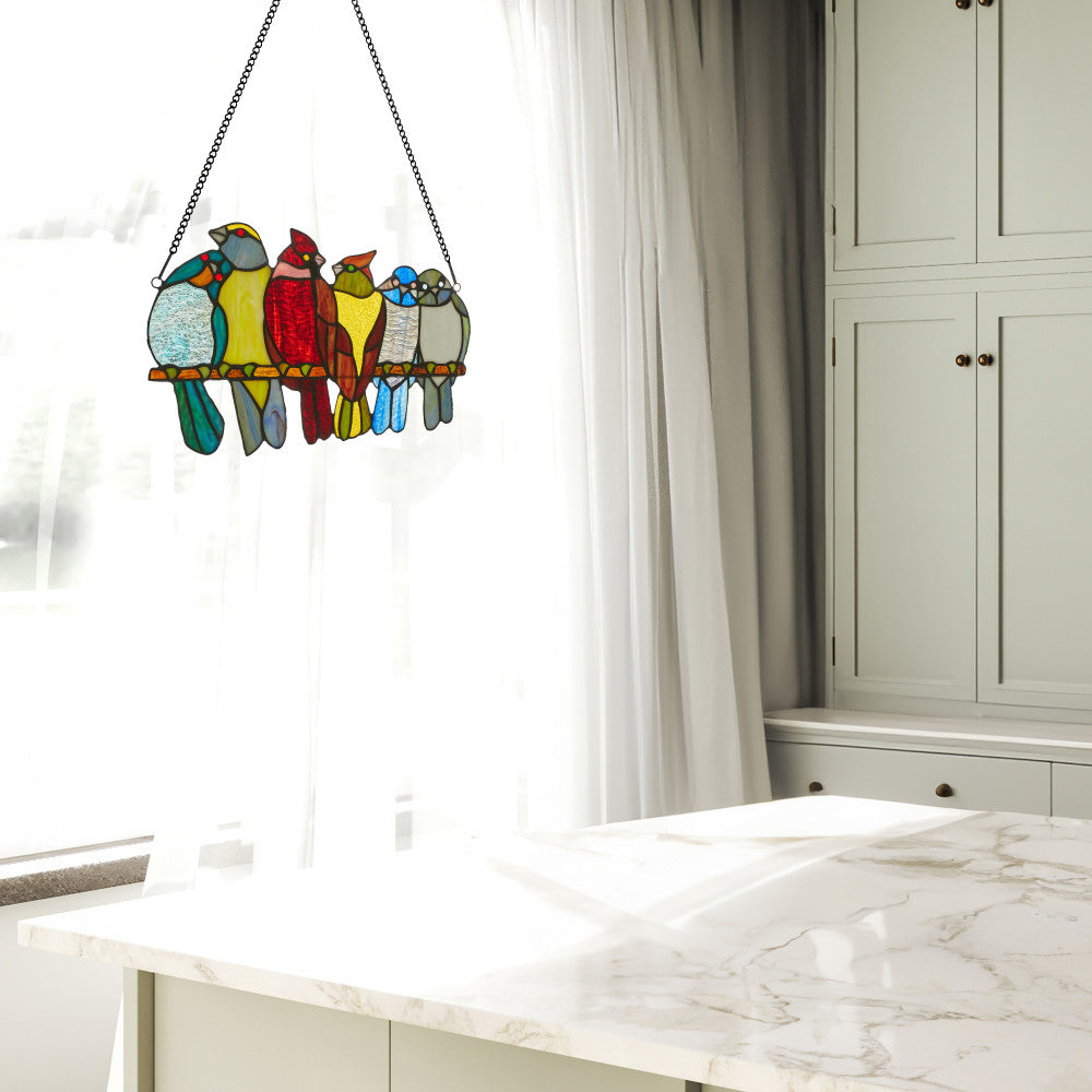 Our little lovebirds. These birds on a wire, add a perfect feeling of romance into your home. Designed with real rippled and mottled stained glass in red, yellow, green, blues and greys. Includes a hanging chain, perfect for displaying in your kitchen, living room or dining room.