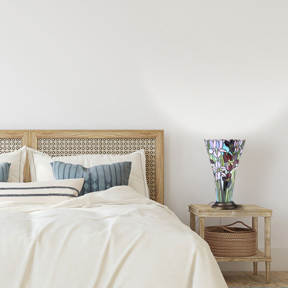 Infuse your space with vibrant colors and bohemian flair with this exquisite hurricane table lamp. The lamp features a unique stacked bronze base and a stunning stained glass cone shade in hues of purple, green, and cream, creating a vibrant vase like look adorned with beautiful flowers. Ideal for bedside placement, the handcrafted design casts a warm, inviting glow. Enjoy the artistic craftsmanship, with each piece showcasing intricate detailing of 354 glass cuts and a distinct flower pattern, perfect for adding character and charm to any room.