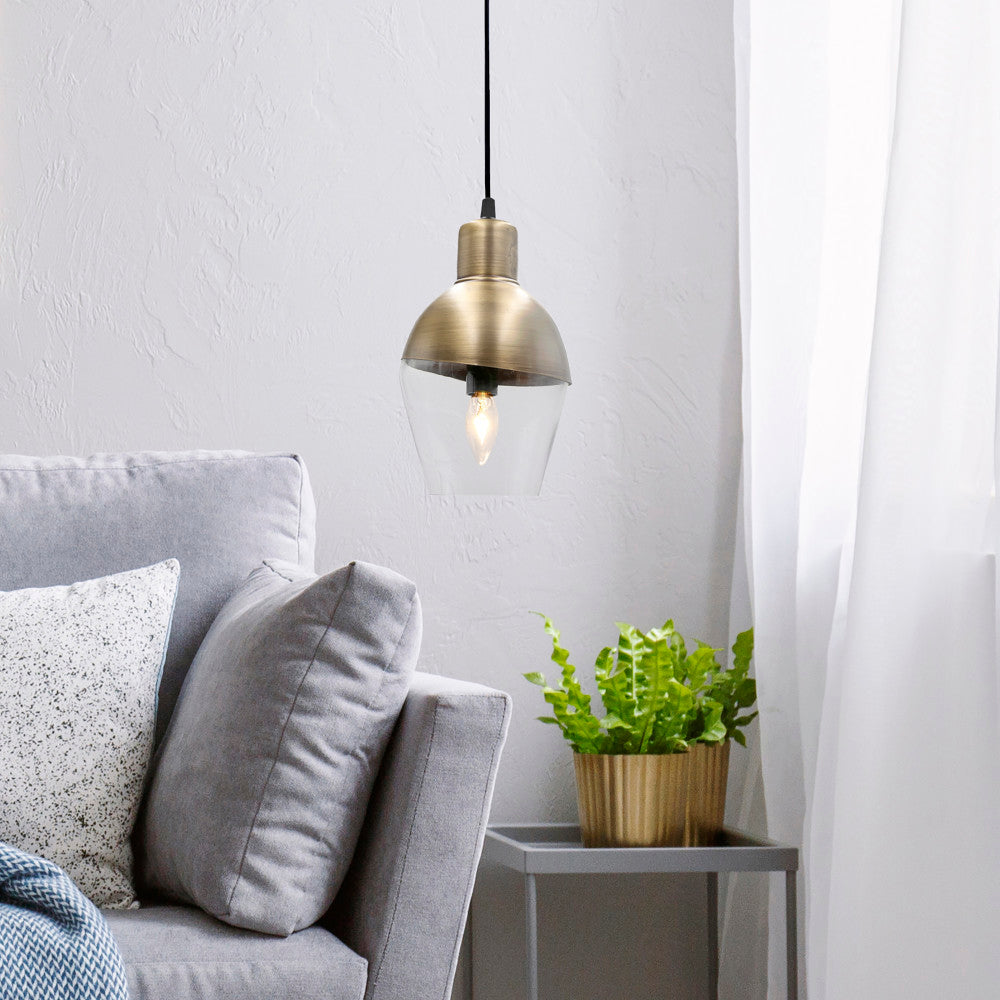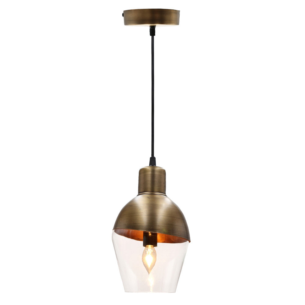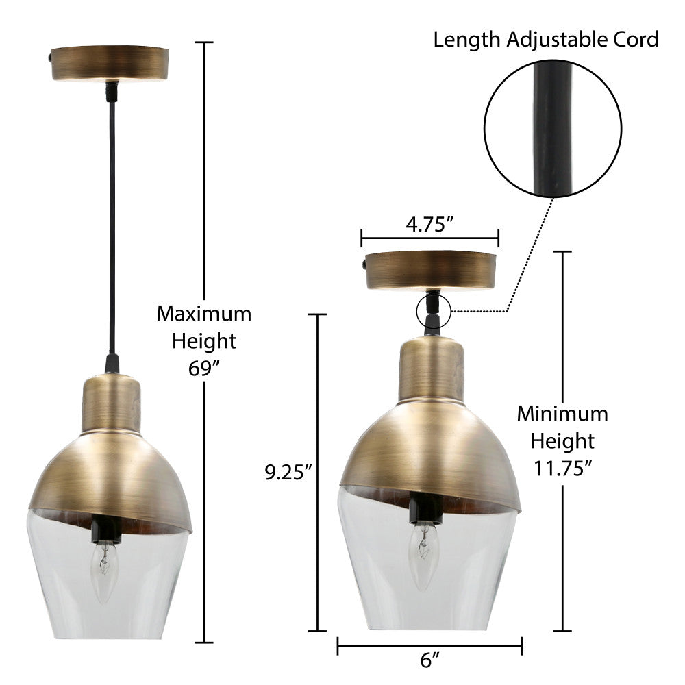 Add ambient lighting with this 1-light asymmetrical glass and metal pendant. Perfect in multiples over a kitchen island, dining table or simply alone. The adjustable hanging cord allows versatility for any space. The shade features an antiqued brass finish on the top and clear glass bottom shade. Includes a circular metal canopy for hardwiring and requires one (1) 25W bulb (not included). This 9.25"H pendant is ideal for modern or transitional decor styles.