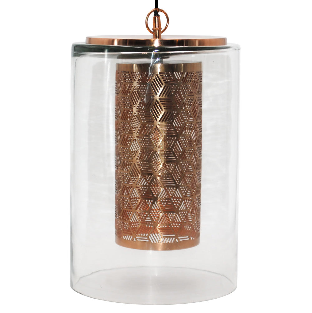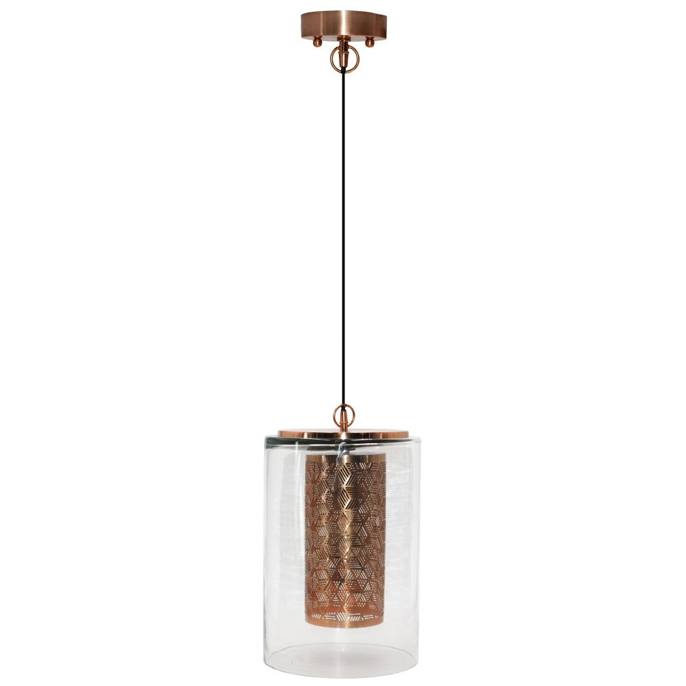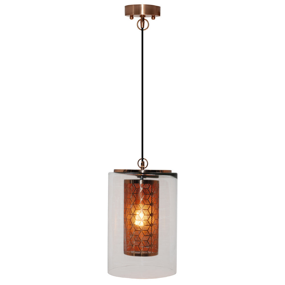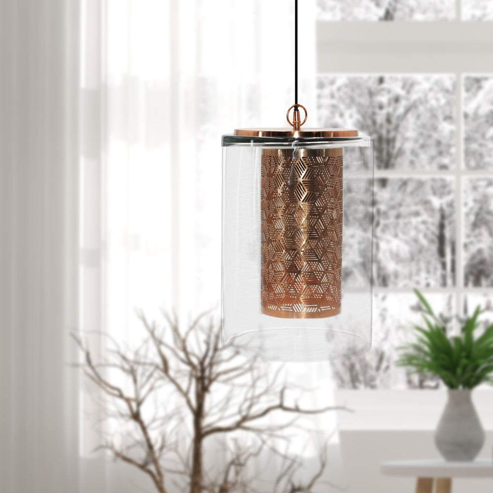 Add ambient lighting with this 1-light glass and metal pendant. The adjustable hanging cord allows for versatility to any space. The pendant is designed with an inner punched metal shade that is encased in an outer glass cylinder shade. Includes a circular metal canopy for hardwiring and requires one (1) 25W bulb (not included). This 17"H pendant is ideal for transitional or glam decor styles.