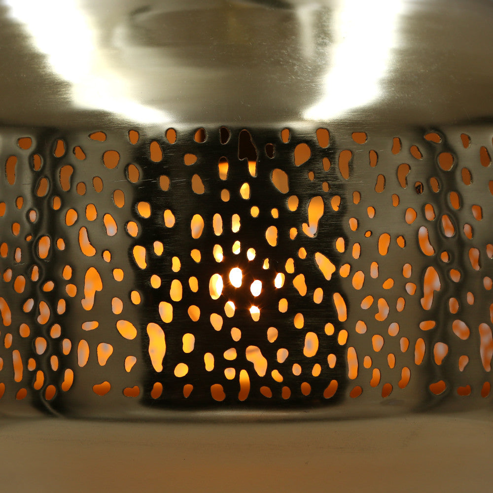 Add ambient lighting with this 1-light organic dot golden metal pendant. The adjustable hanging cord allows for versatility to any space. The metal shade is designed with small punched metal dots which allows for light to illuminate through. Includes a circular metal canopy for hardwiring and requires one (1) 40W bulb (not included). This 16"H pendant is ideal for transitional or glam decor styles.