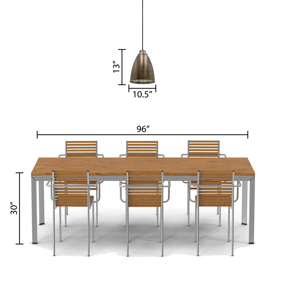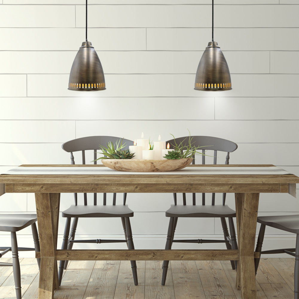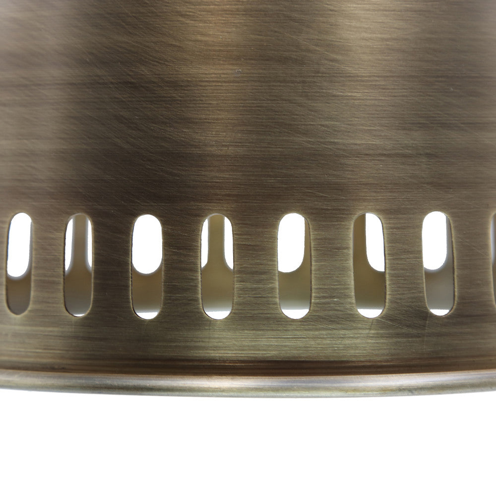 Add ambient lighting with this 1-light punched metal pendant. Perfect in multiples over a kitchen island, dining table or simply alone. The adjustable hanging cord allows versatility for any space. The shade features a brushed brass finish, detailed with a pierced metal rim. Includes a circular metal canopy for hardwiring and requires one (1) 40W bulb (not included). This 13"H pendant is ideal for farmhouse or industrial decor styles.