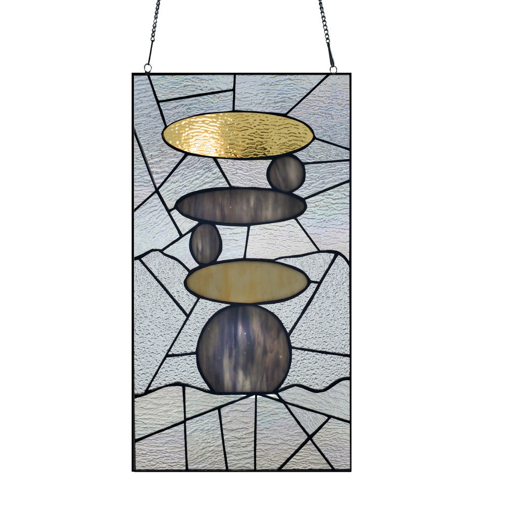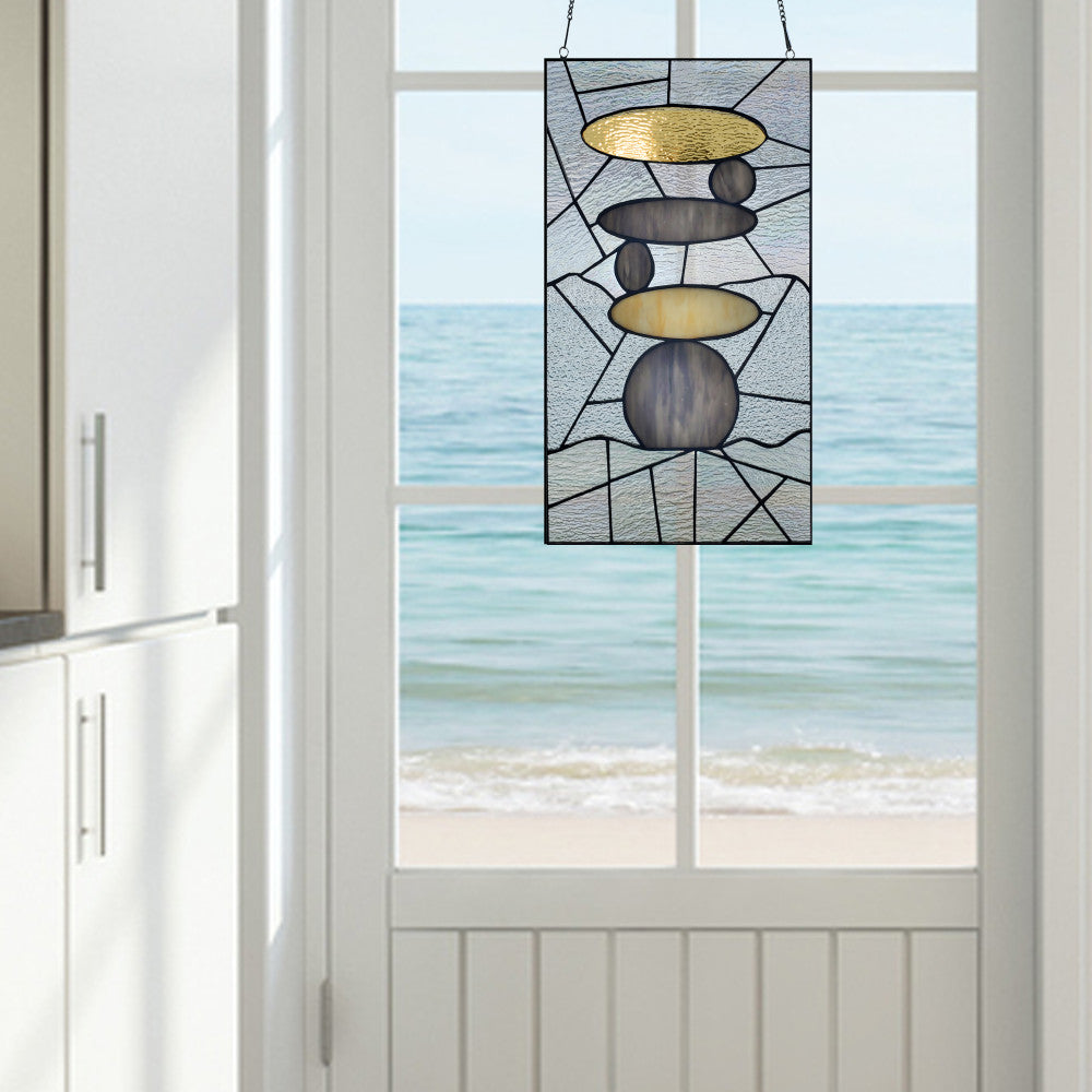 Take a breather, Namaste. This Zen stone art piece is designed with soft greys, textured and iridescent clears and warm yellows. Each panel comes with a decorative hanging chain for support and strength so that you can easily install it and enjoy. This 18"H vertical shaped stained glass panel is perfect for your Yoga or meditation space, home office or kitchen window areas.