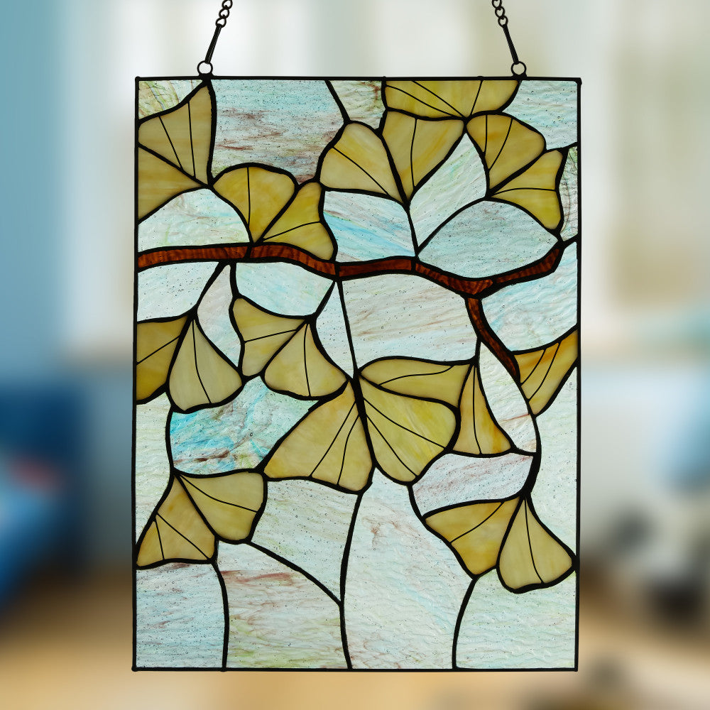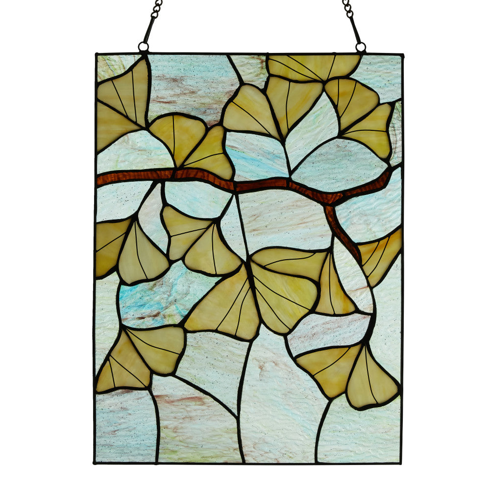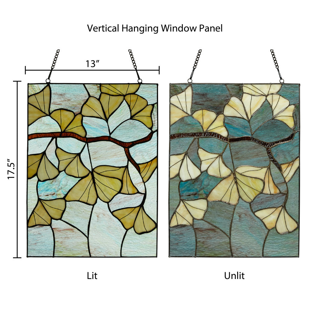 This unique fan-shaped leaf of a ginkgo symbolizes resiliency and longevity. This panel is designed with more than 50 individual stained glass cuts in striated blue and purples, textured browns and buttery yellows. Each panel comes with a decorative hanging chain for support and strength so that you can easily install it and enjoy. This 17.5"H vertical stained glass panel is perfect for your home office, kitchen window or dining room space.