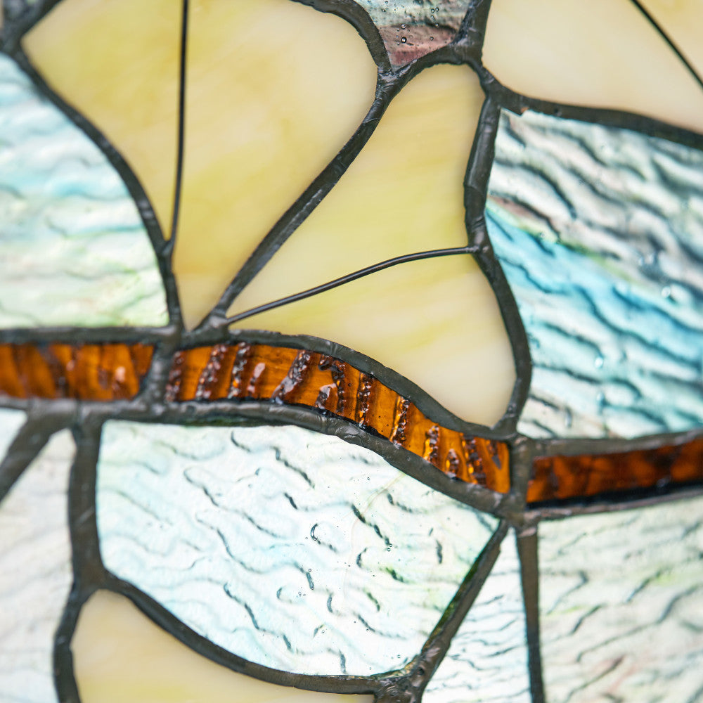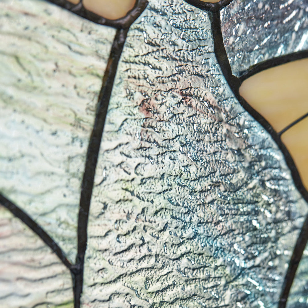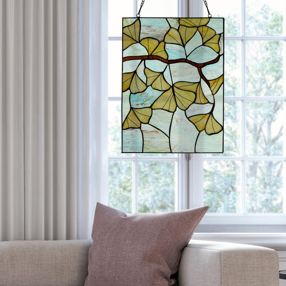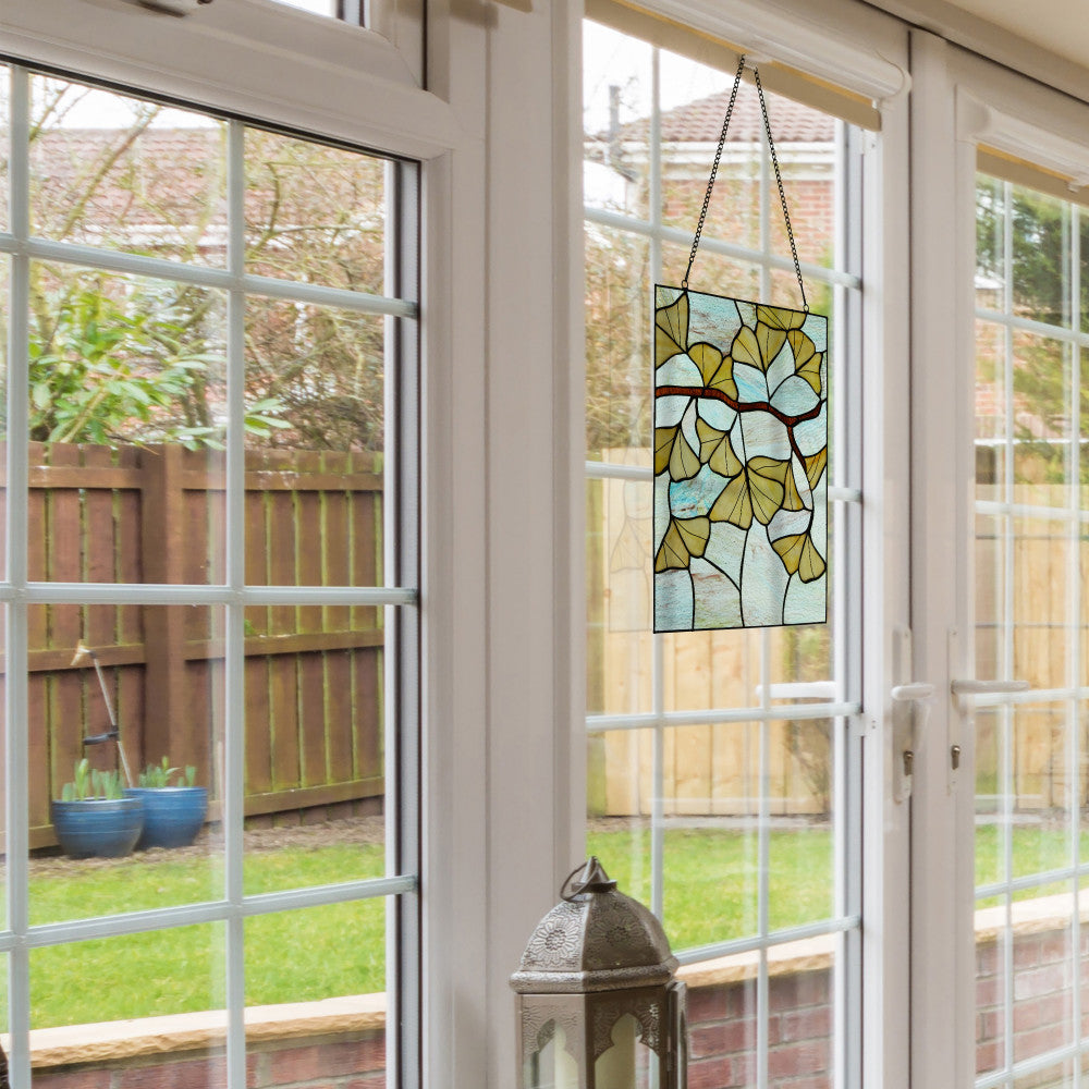 This unique fan-shaped leaf of a ginkgo symbolizes resiliency and longevity. This panel is designed with more than 50 individual stained glass cuts in striated blue and purples, textured browns and buttery yellows. Each panel comes with a decorative hanging chain for support and strength so that you can easily install it and enjoy. This 17.5"H vertical stained glass panel is perfect for your home office, kitchen window or dining room space.