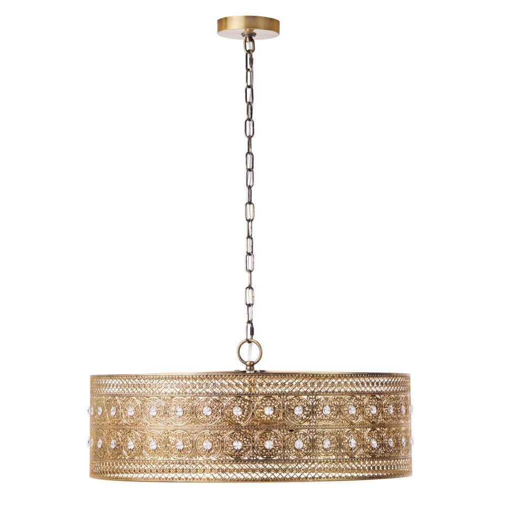 Make a statement with this oversized brushed brass finish and K-9 crystal jeweled 3-light hanging chandelier. This 23.5"W chandelier is perfect for glam or traditional décor styles. The shade features a double-layered medallion pattern, with 70 faceted clear K-9 crystal jewels within the shade. A luxurious piece for your dining room, living room or foyer.