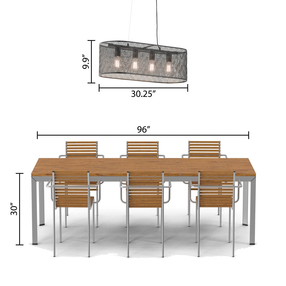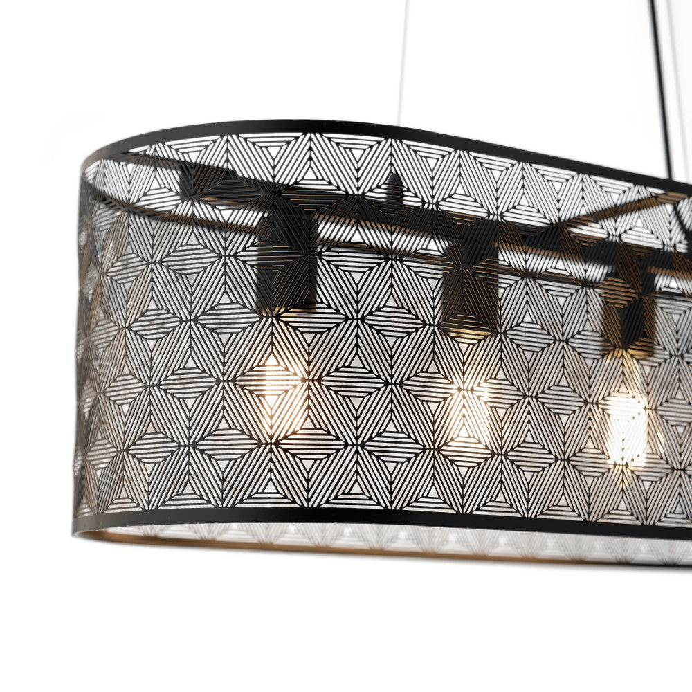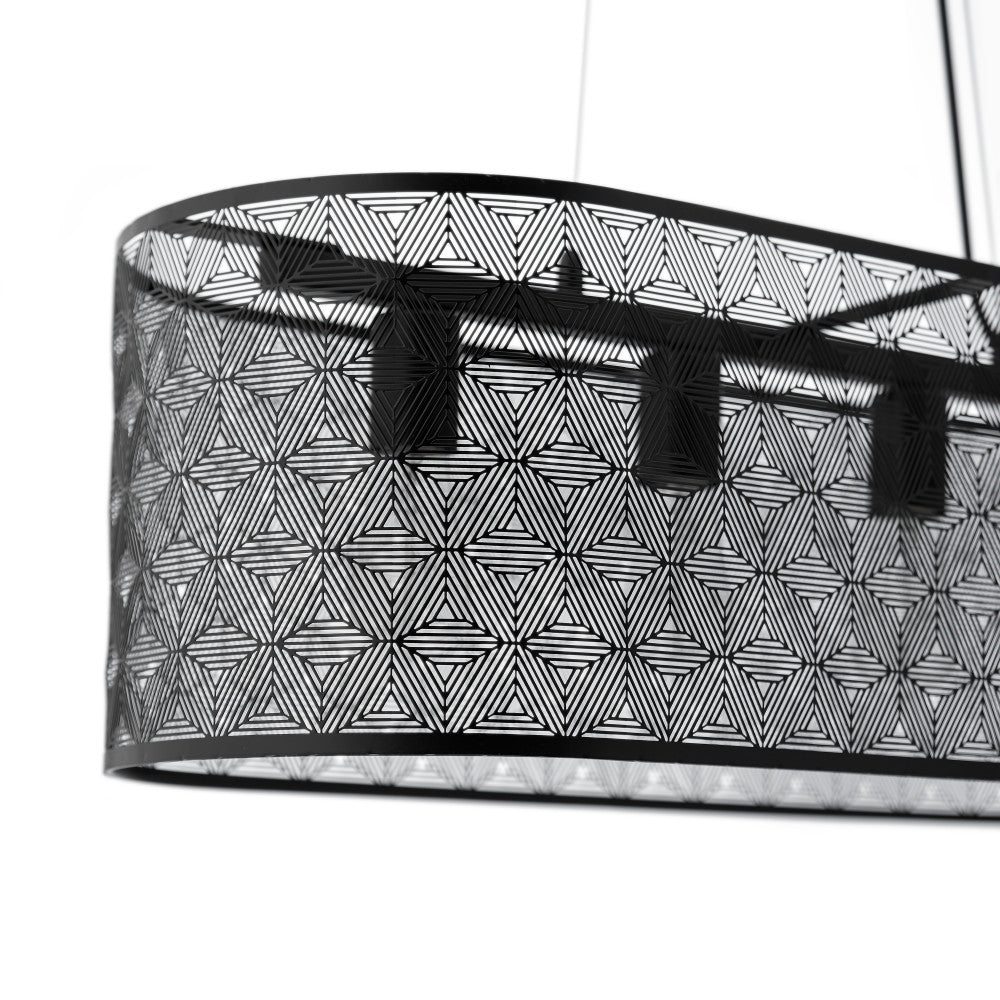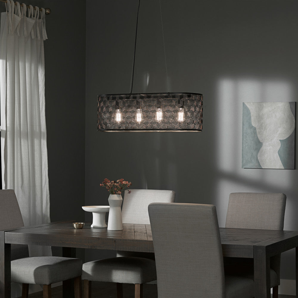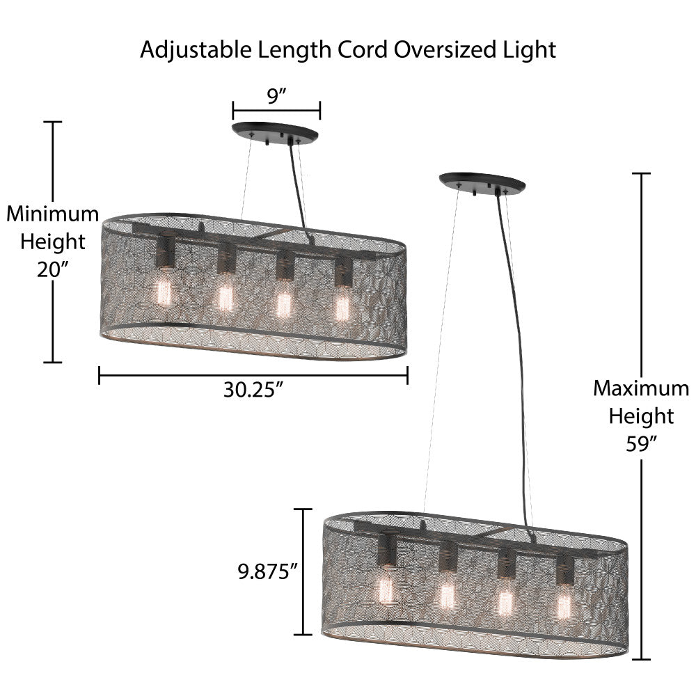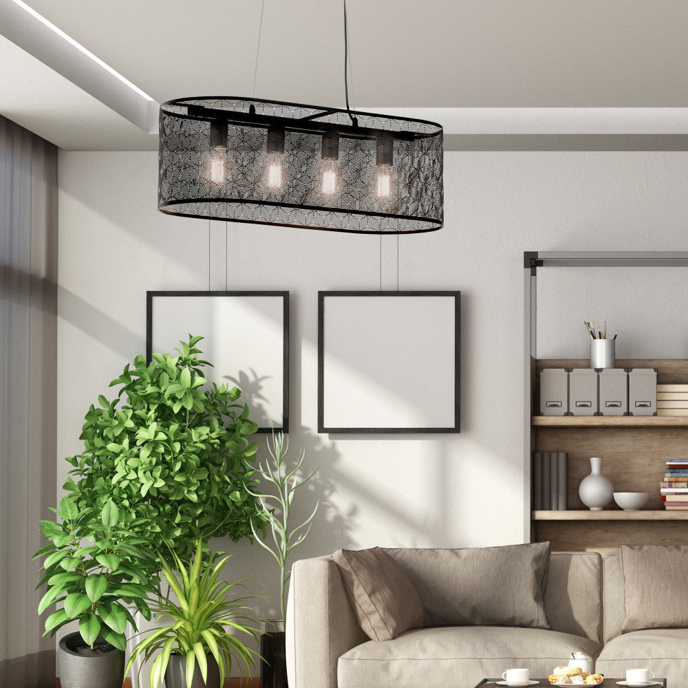 The modern charm and convenient overhead lighting of this four-light black metal cage shade hanging chandelier is a perfect addition to your industrial or modern home decor. Designed with a black-painted metal shade full of allover punched details to form a subtle geometric pattern, this chandelier light is great for adding stylish overhead lighting above your dining table or kitchen island. It's compatible with incandescent, LED or CFL bulbs, and features an adjustable-height design to easily find the perfect drop for your room layout and ceiling height.