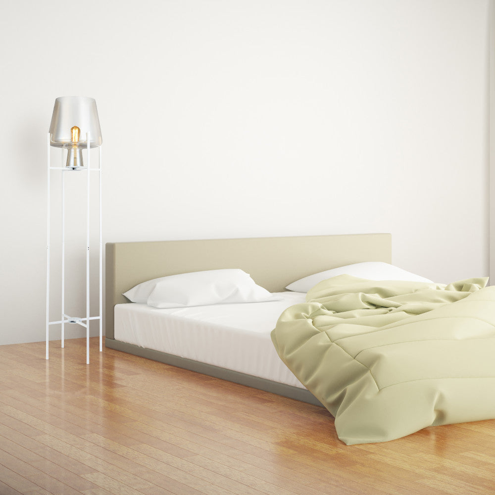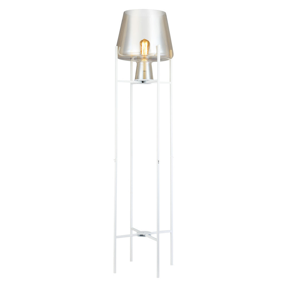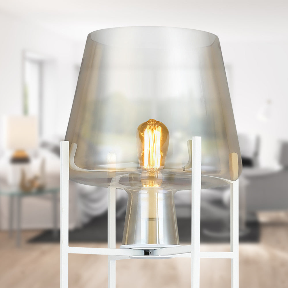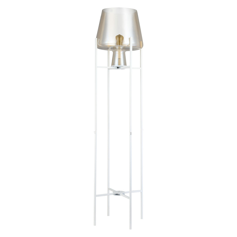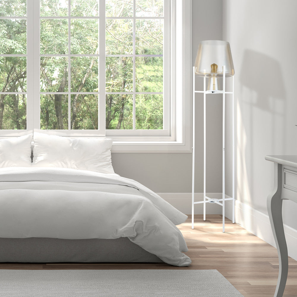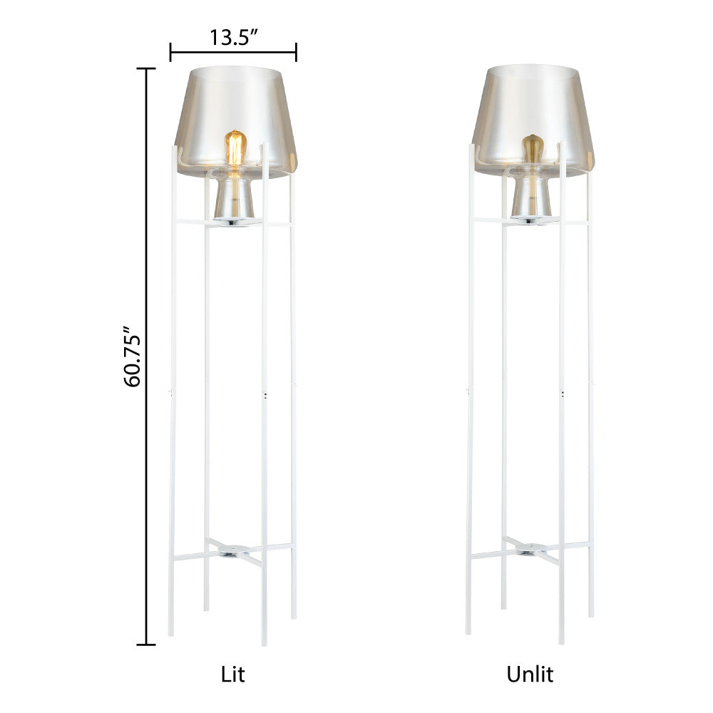 Light up your living room, home office or entryway with modern style and easy elegance when you add this stunning metal and glass bowl floor lamp. Designed with a crisp, clean white base standing on four sleek legs, this mixed materials accent lamp also boasts a delicately curved bowl shade in a beautiful champagne gold finish for a translucent look that lets a single 60-watt max. light bulb (not included) shine through to create a warm, welcoming feel in your home. Plus, the 60-inch power cord provides ample reach to a nearby wall outlet.