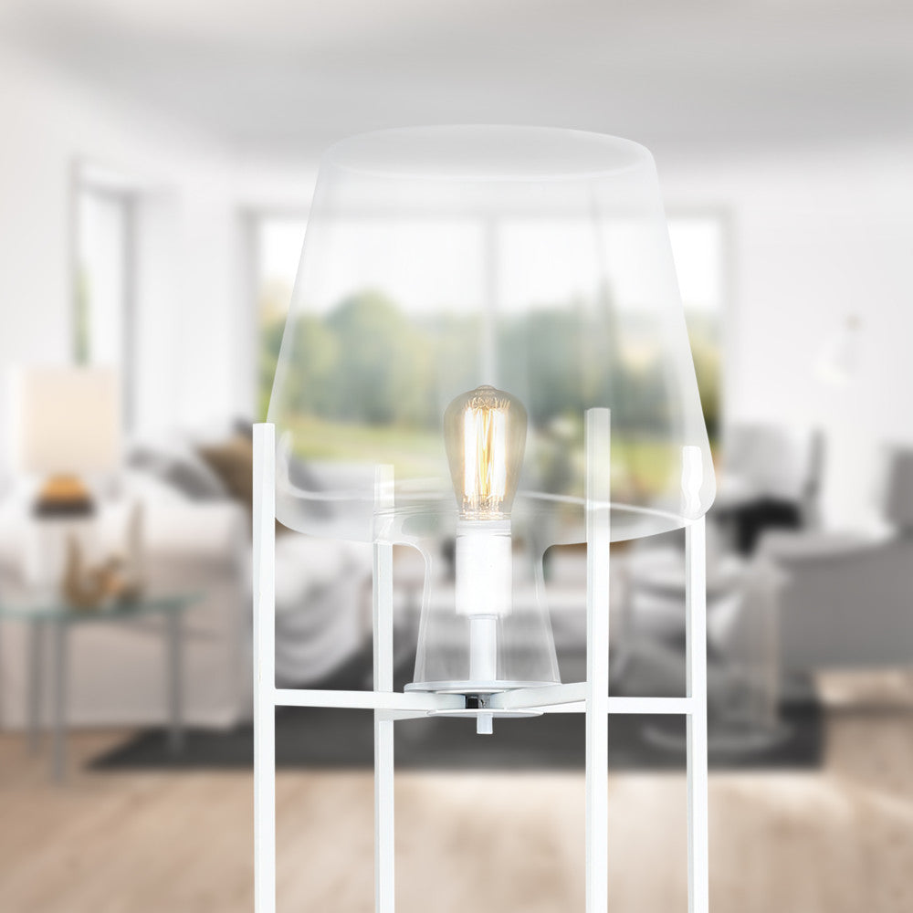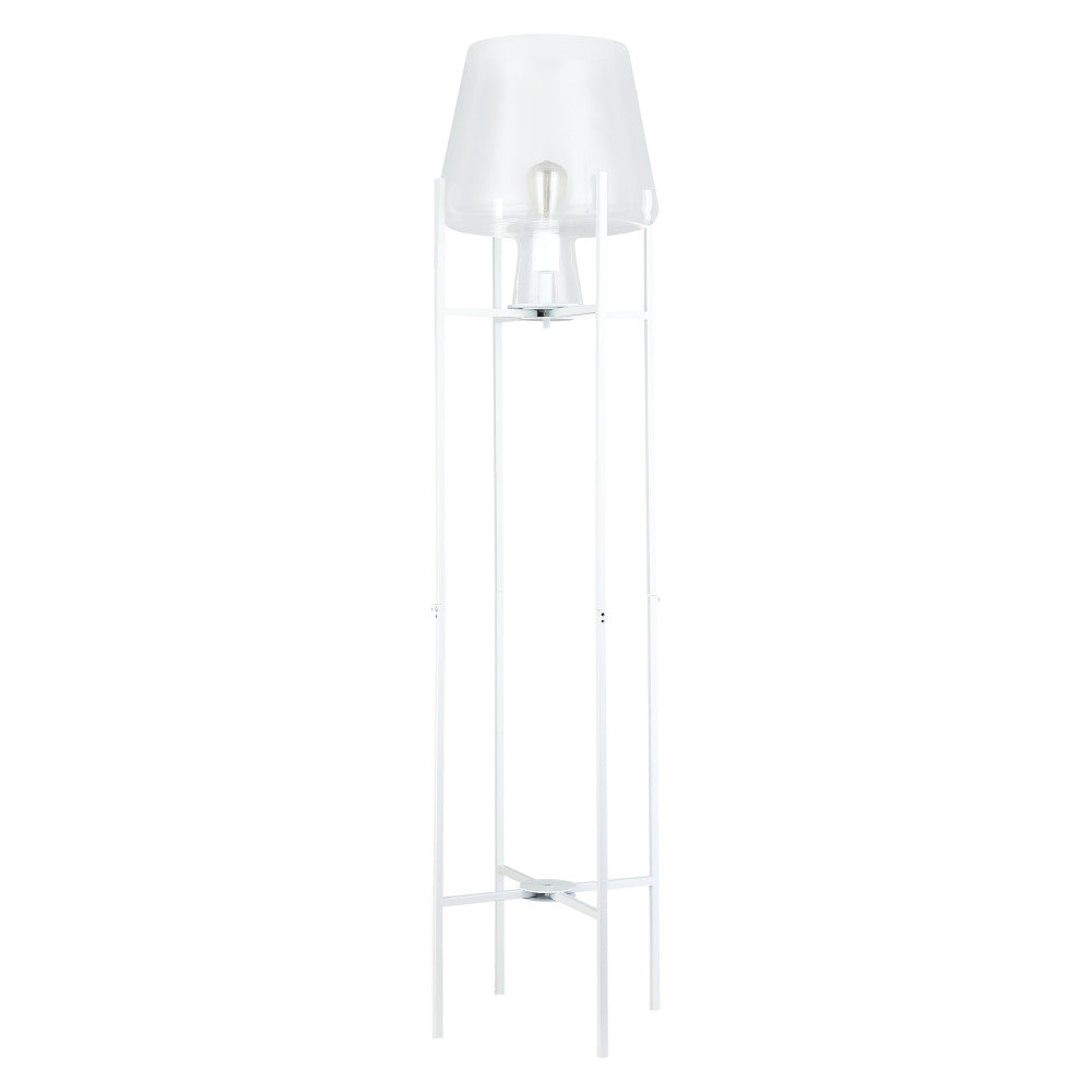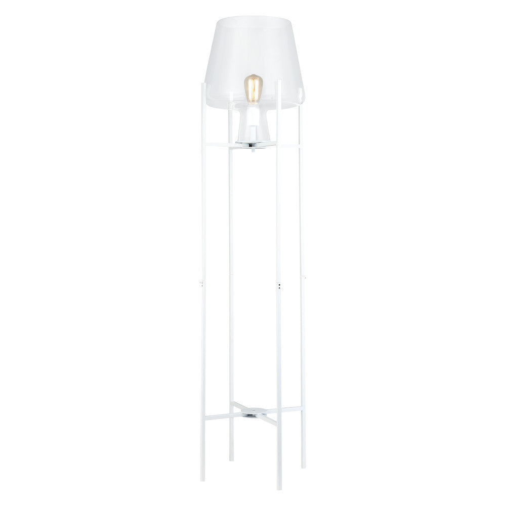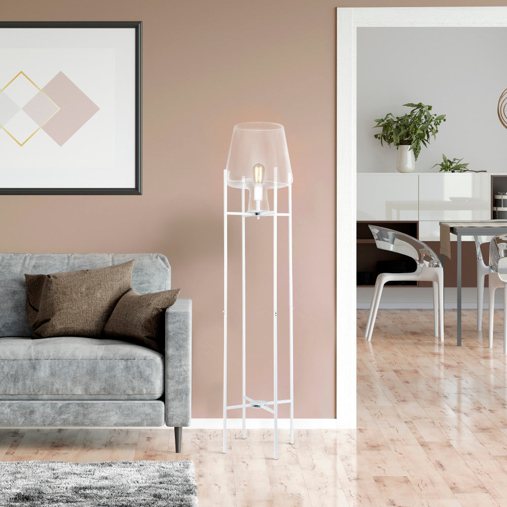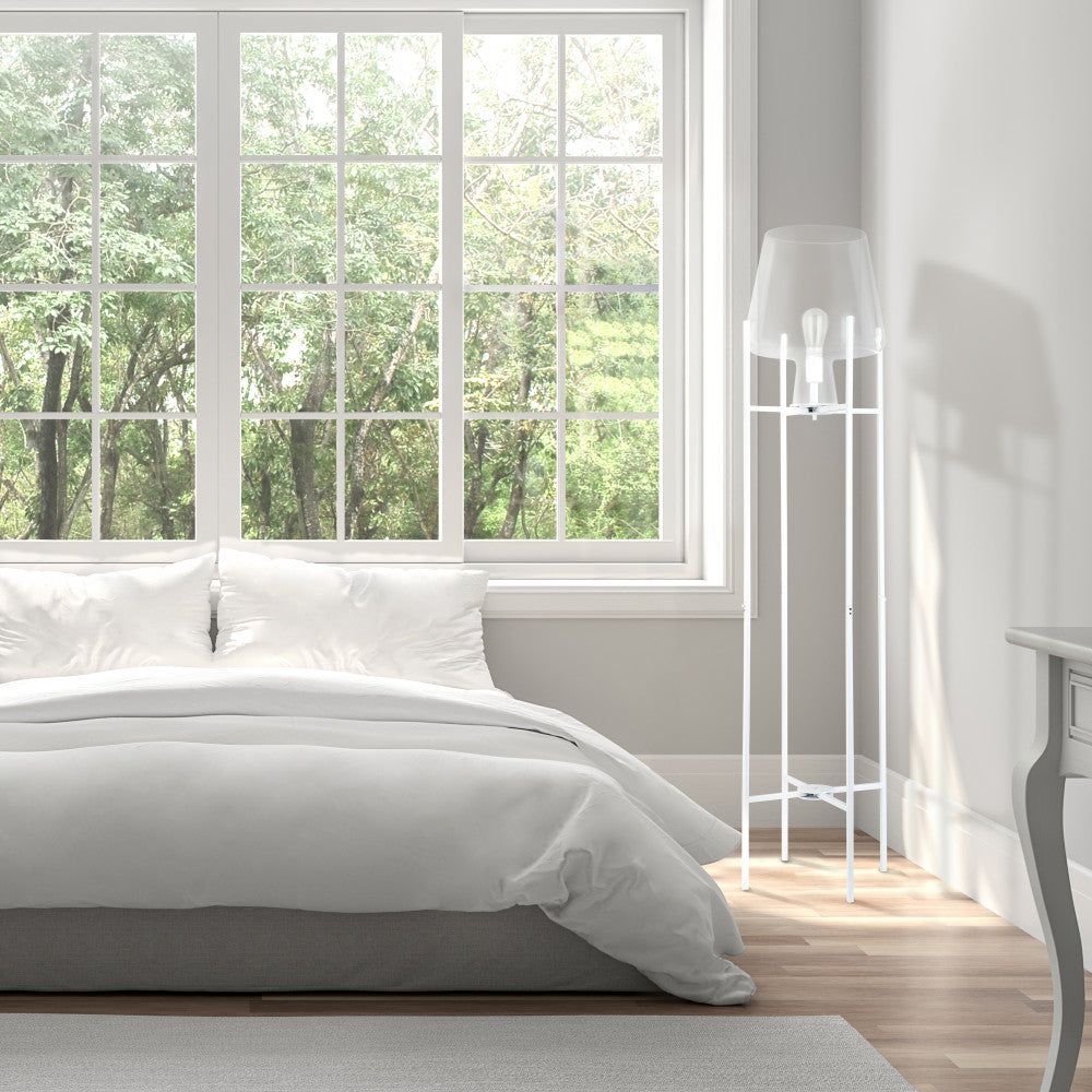 Whether you're adding accent lighting to your living room or looking for the perfect pick to place behind your reading chair, this sleek and stylish metal and glass bowl floor lamp makes a perfect pick. Combining a four-legged white metal frame with a beautiful glass bowl shade, it boasts a stunning mixed materials look that easily lets a 60-watt max. light bulb (not included) shine through for a warm, welcoming glow. Plus, a 60-inch power cord offers easy reach to a wall outlet.