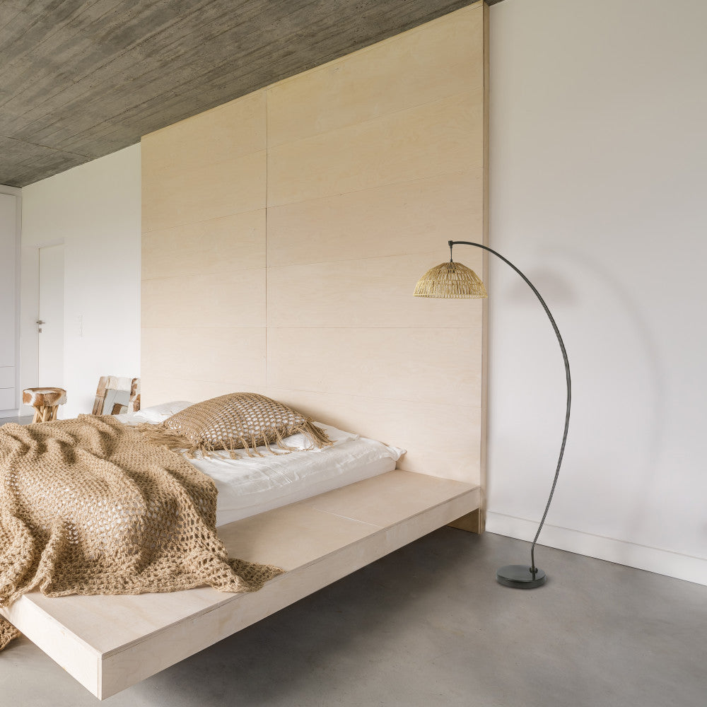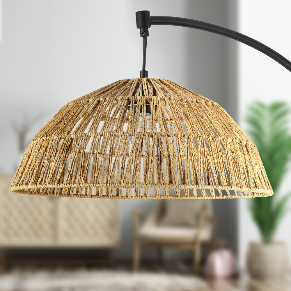 Illuminate your interiors while adding a touch of boho style with this metal and rattan bowl floor lamp. Designed with a curved metal stand in black for an eye-catching look, this decorative floor lamp also features an intricately woven rattan shade in a bowl shape for a stunning mixed-materials look that'll blend in wonderfully with a range of decor styles. Whether placed in a living room or office, warm lighting will shine beautifully through the shade with a 60-watt light bulb (not included), and a 90-inch power cord provides convenient reach to a wall outlet.