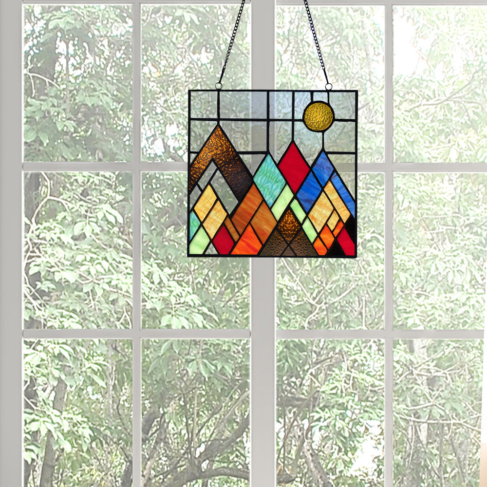 With its composition of different shades of amber, blue, brown and teal, Mondrian-inspired Modernism is interpreted in stained glass in this Beyond the Mountain Tops window panel. Handcrafted from 51 glass cuts soldered with iron, this 10-inch square stained glass mountain range will dazzle in the sunlight from a bedroom, guest room or home office window. Use the attached metal link chain for convenient hanging in a window or against an illuminated wall for added drama. Complete your Modernist, industrial, mid-century modern, or minimalist decor with a contemporary take on the ancient art of stained glass with this beautiful decorative window panel.