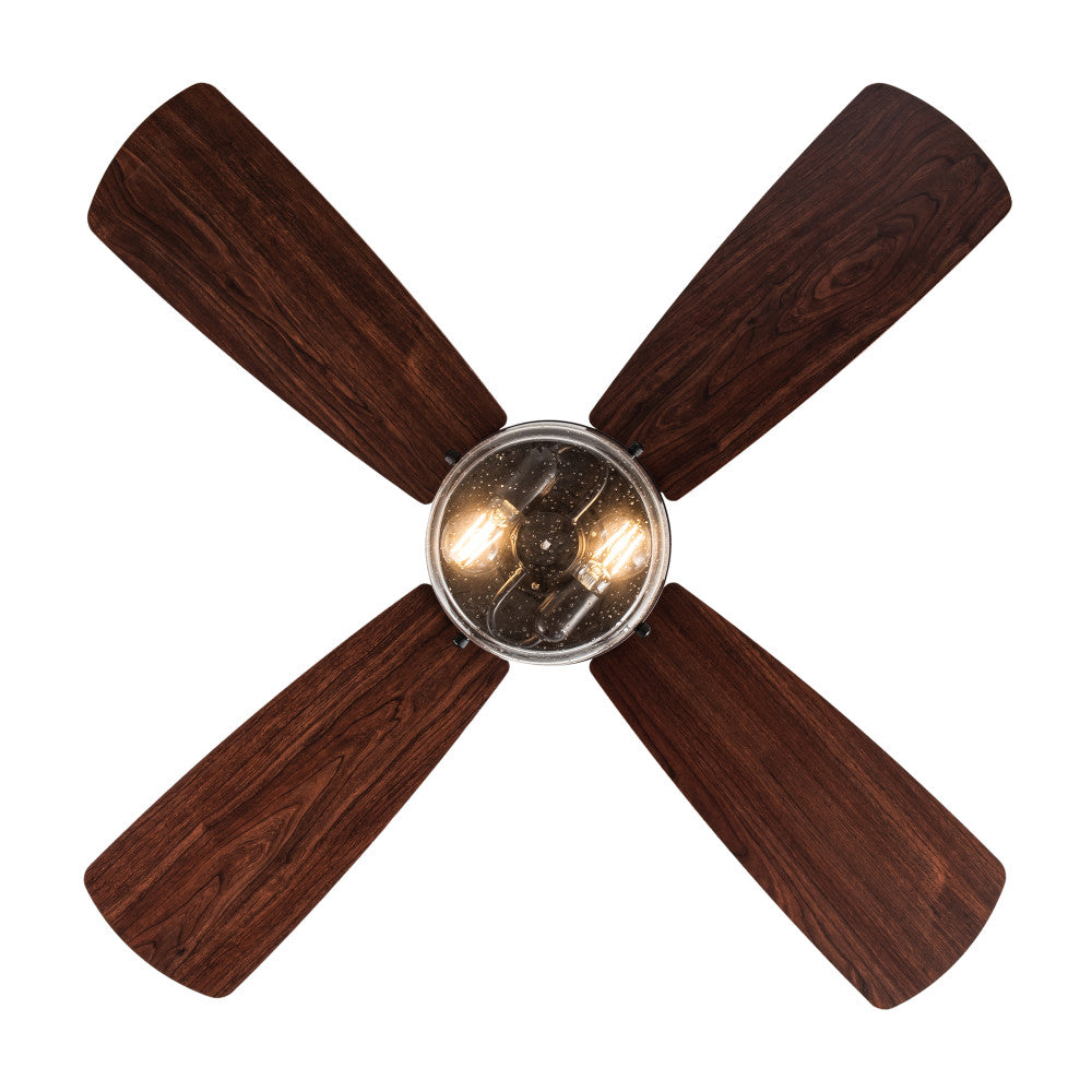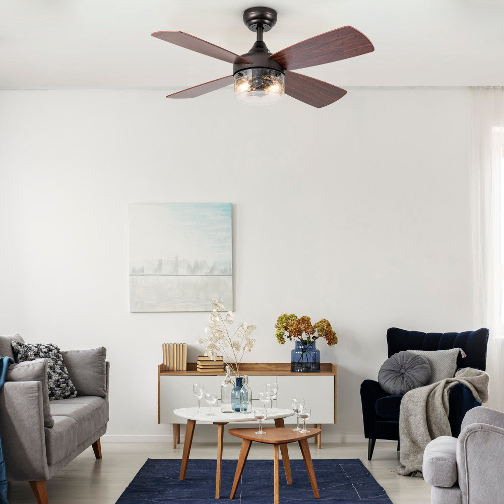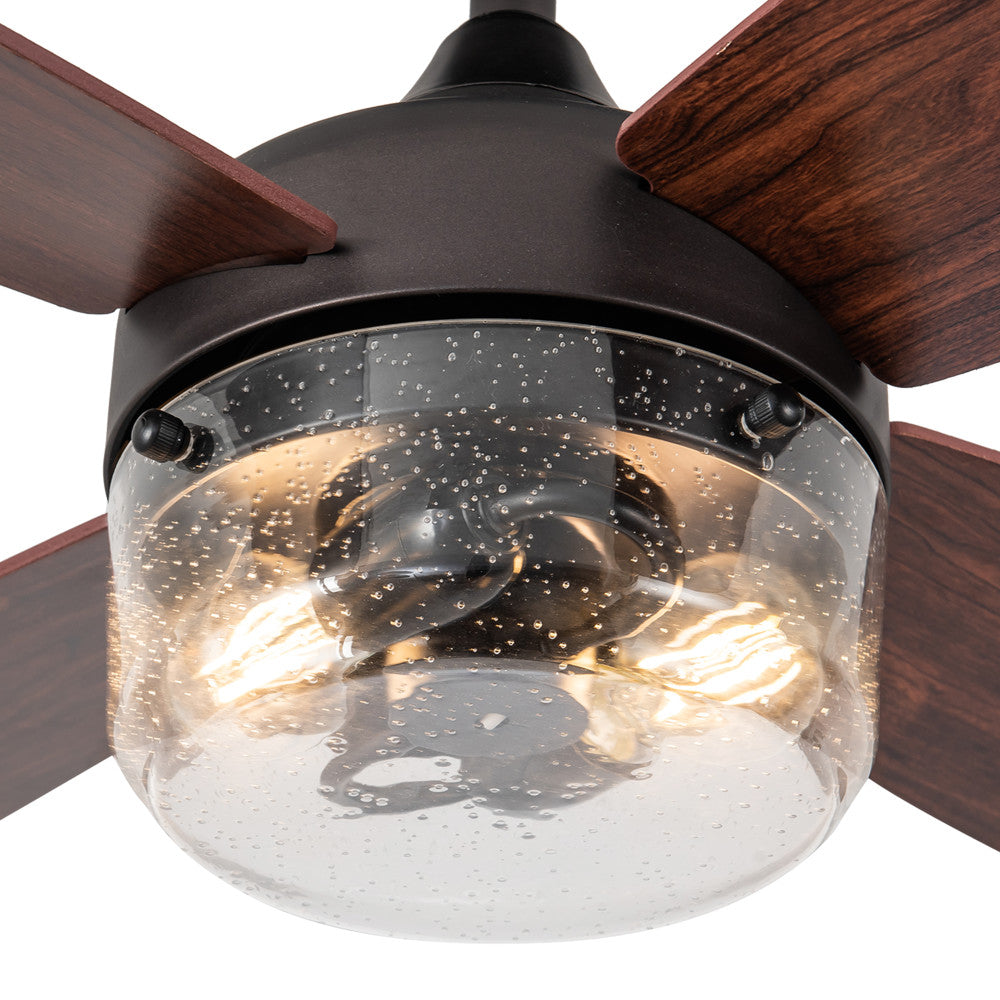 This remote-controlled, four-bladed ceiling fan lets you enjoy cool indoor air flow and is easy to incorporate into a range of interior decor schemes. Showcasing four mahogany-colored MDF blades, a bronze matte finish metal base and a clear glass seeded look dome shade, this fan exudes minimalist style that pairs well with modern or industrial decor. 2 7-watt E26 bulbs (included) cast a warm glow, and the remote control with 2 included AAA batteries lets you operate the fan right out of the box. Best of all, the fan's slope-ceiling compatibility allows you to install it in your kitchen, bedroom, living room, or any other space in your home.