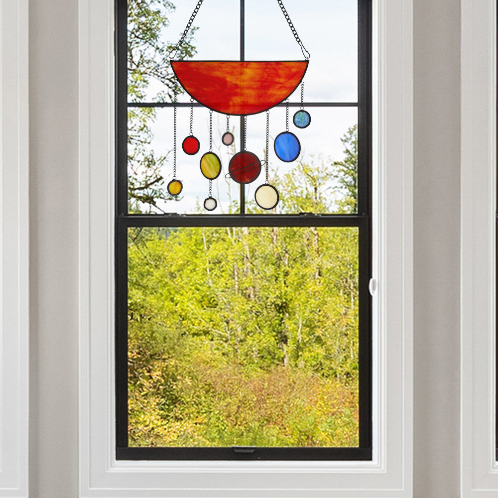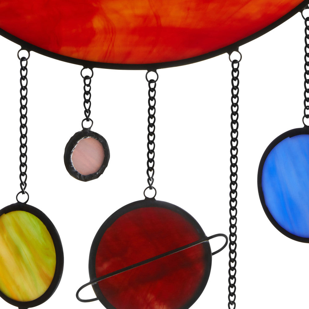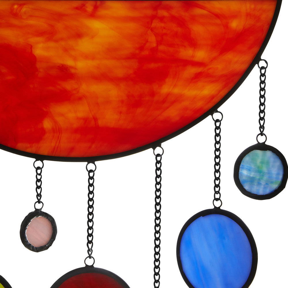 Whether you love astronomy, the art of stained glass or both, you'll agree that this solar system in stained glass is out of this world! Handcrafted from 10 Tiffany-style glass cuts of different hues, each planet on this 12-inch long suncatcher is suspended by metal link chains of different lengths, including the Earth and its attached moon. The piece's vertical orientation allows the planets to align and hang underneath the red, orange and yellow striated half-moon of stained glass representing the sun, which blazes with bold, warm color each time it catches the light. Hang it in the sunniest window in your home, classroom or office, and watch the solar system come alive with light in a whole new way.