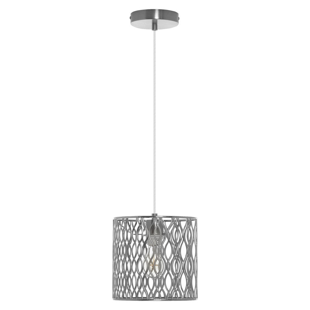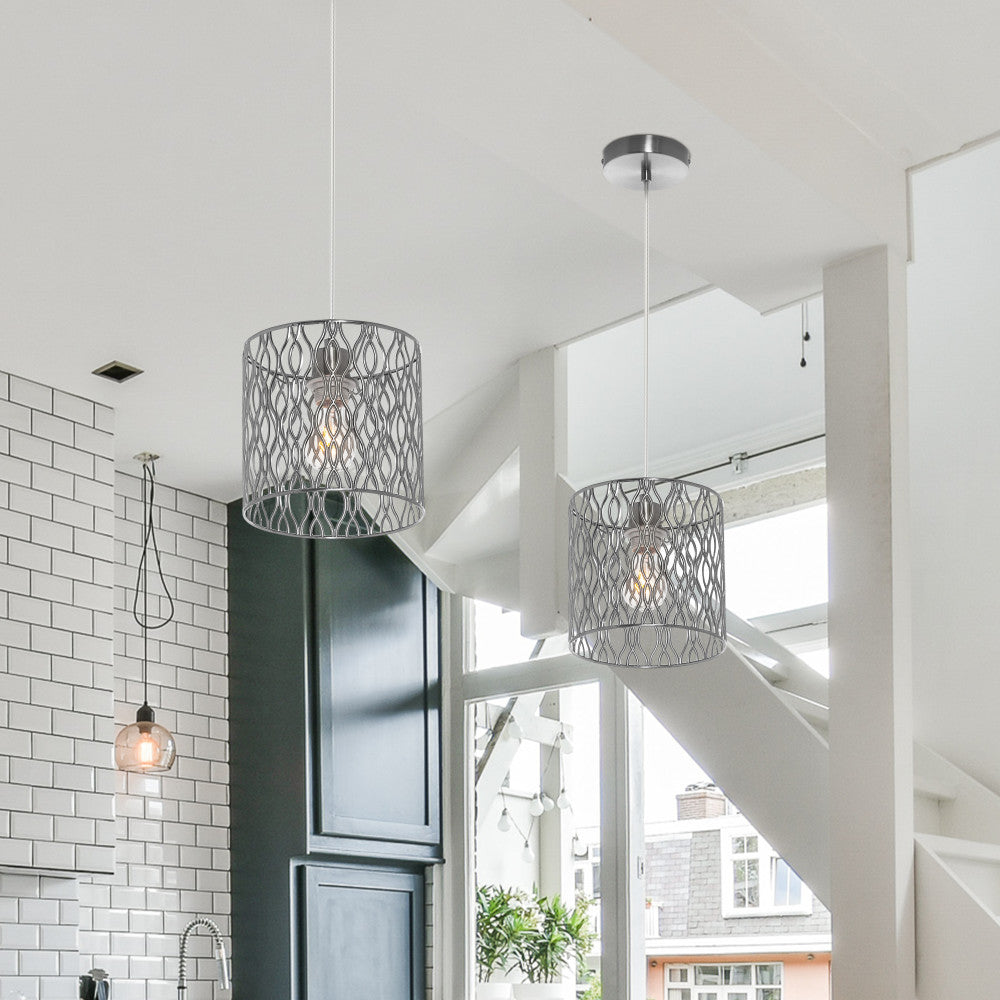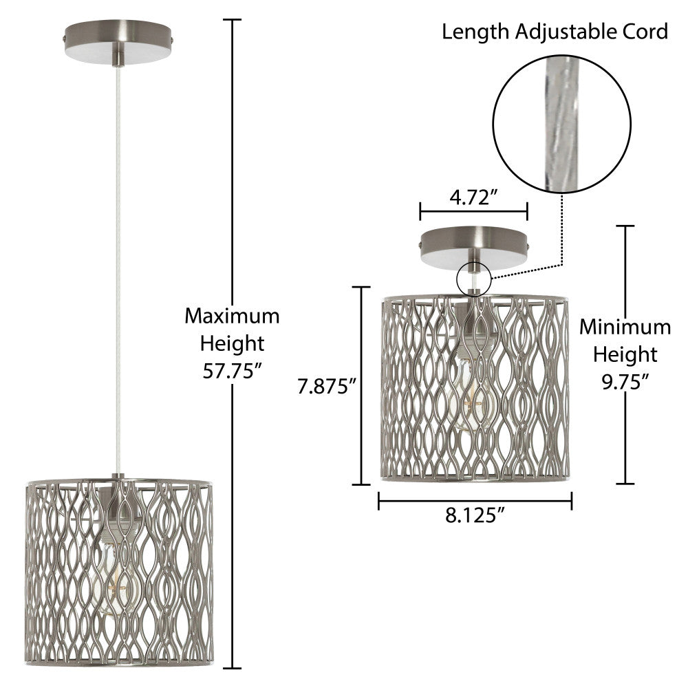 Add form and function to your home lighting with this stunning adjustable metal pendant light. Featuring an all-over silver finish and a punched-out drum shade, this hanging light hardwires into your ceiling and can be adjusted for a slight drop or a dramatic one depending on your needs. The sleek, modern look and Art Deco-inspired metal pattern are sure to make a stylish addition to your kitchen, dining room or entryway.