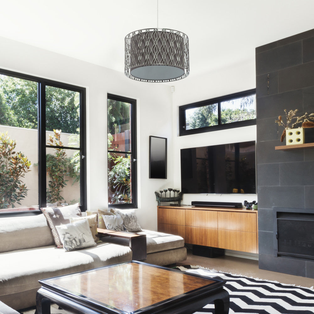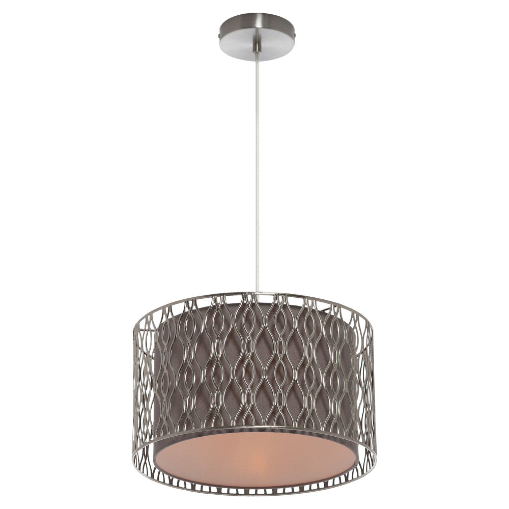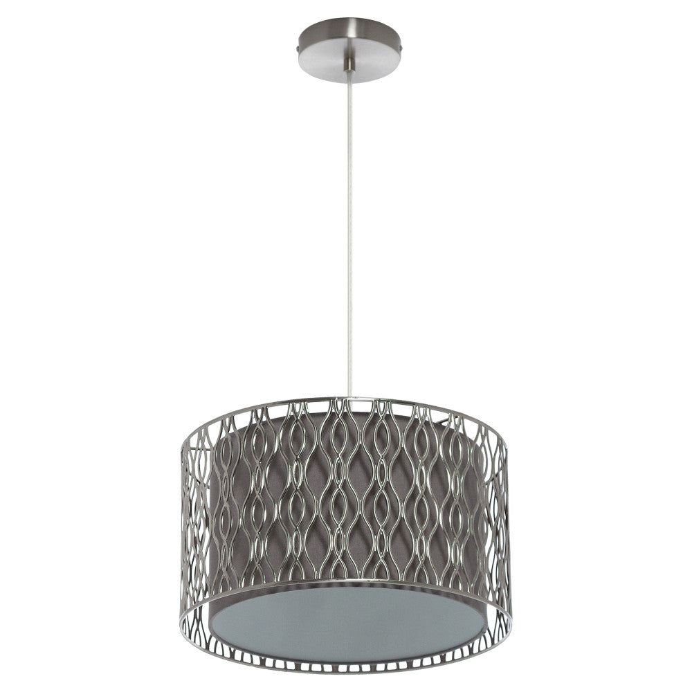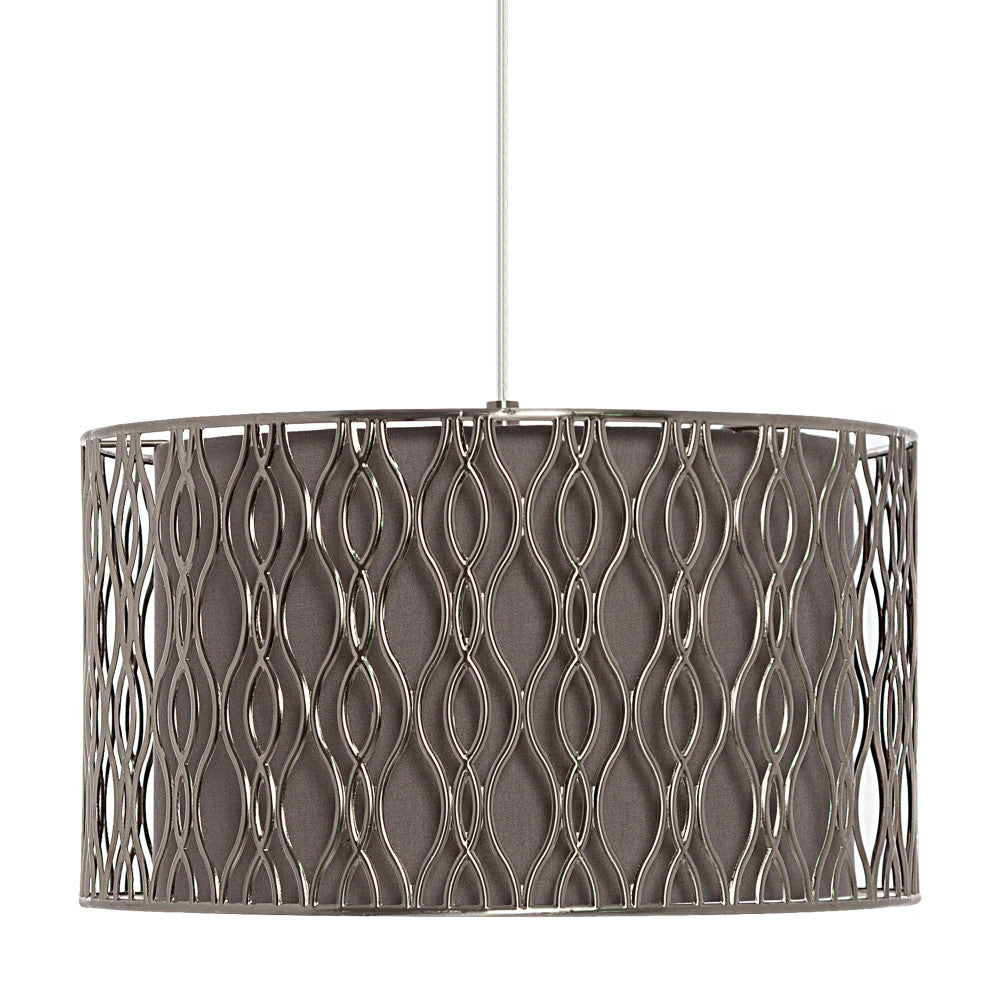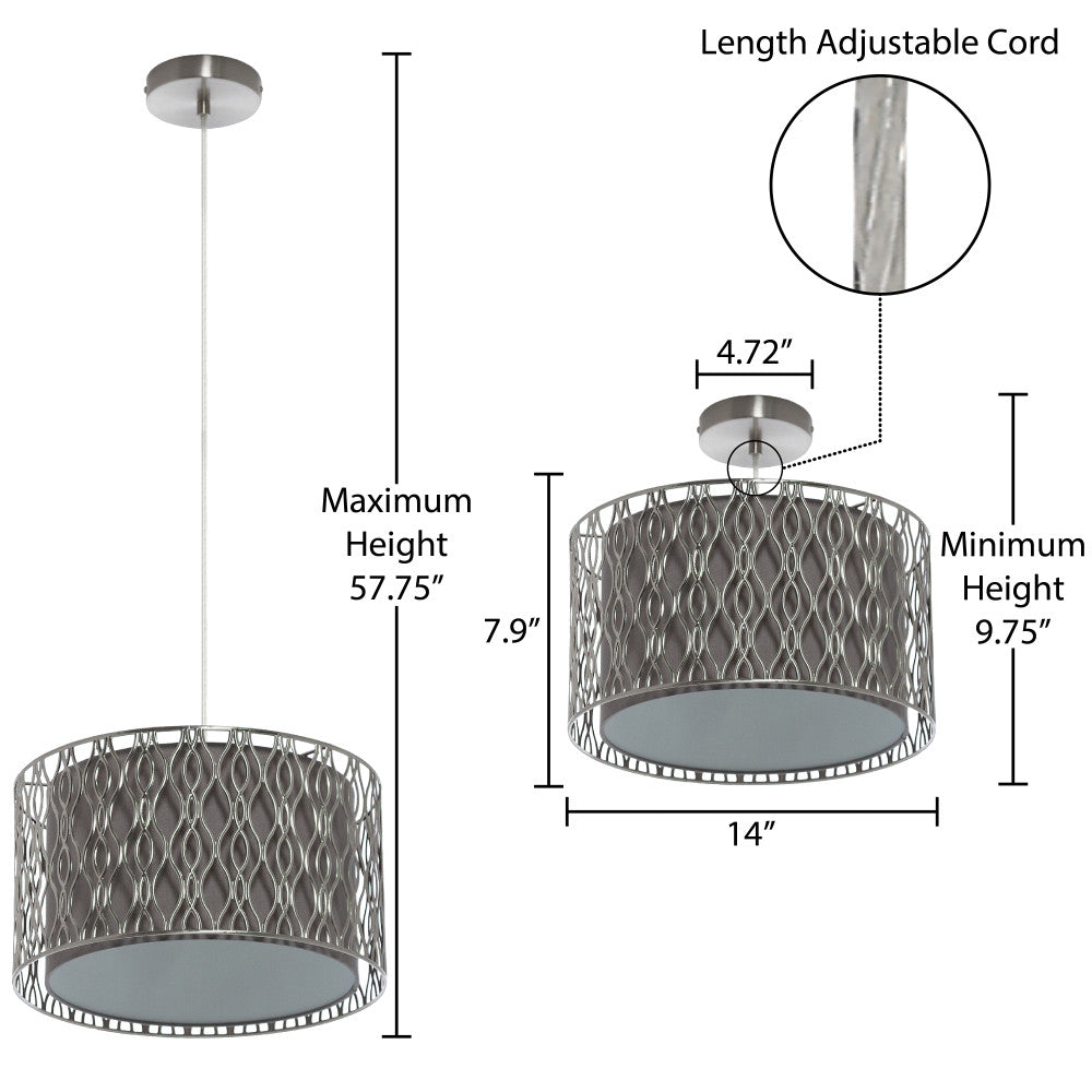 Celebrate your love of Art Deco style by adding this dramatic pendant light to your home. Featuring a silver-painted circular metal fixture paired with a stone-colored drum shade, this hanging pendant light adds a glam vibe to a range of interior decor styles. The shade is fabric with a metal overlay in an open sculptural design, and it will create a cool glow when the single 60-watt bulb (not included) shines through. Thanks to its adjustable height design, you can install this pendant light directly into your ceiling and adjust it to your ideal drop height between 9.75 and 57.75 inches.