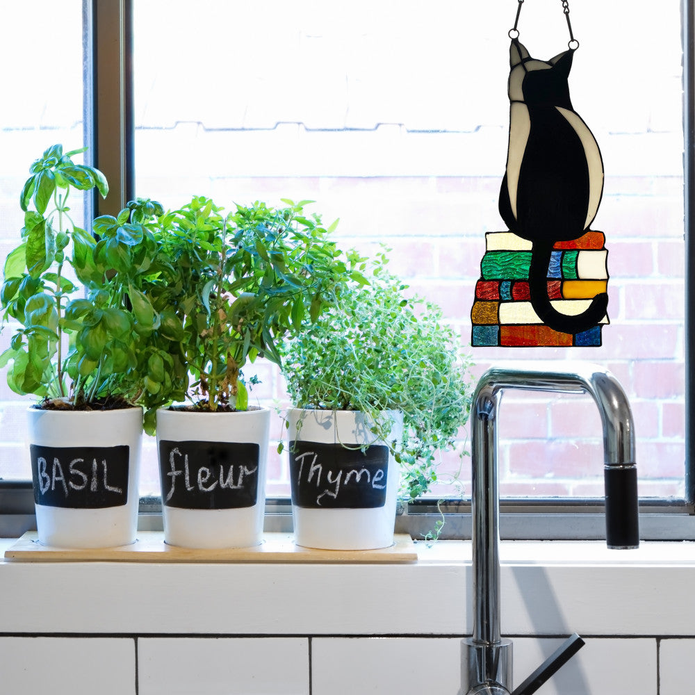 Your living room or den will look brighter and more vibrant when you hang this vertical stained glass window panel showcasing a black cat sitting on a stack of books. Handmade using traditional artisan methods, this window panel is constructed from 31 individual Tiffany-style glass cuts in black, red, green, orange and blue hues. Use the included 23.75-inch metal link chain to hang the panel in any sunny window and watch the space fill with a colorful array of light.
