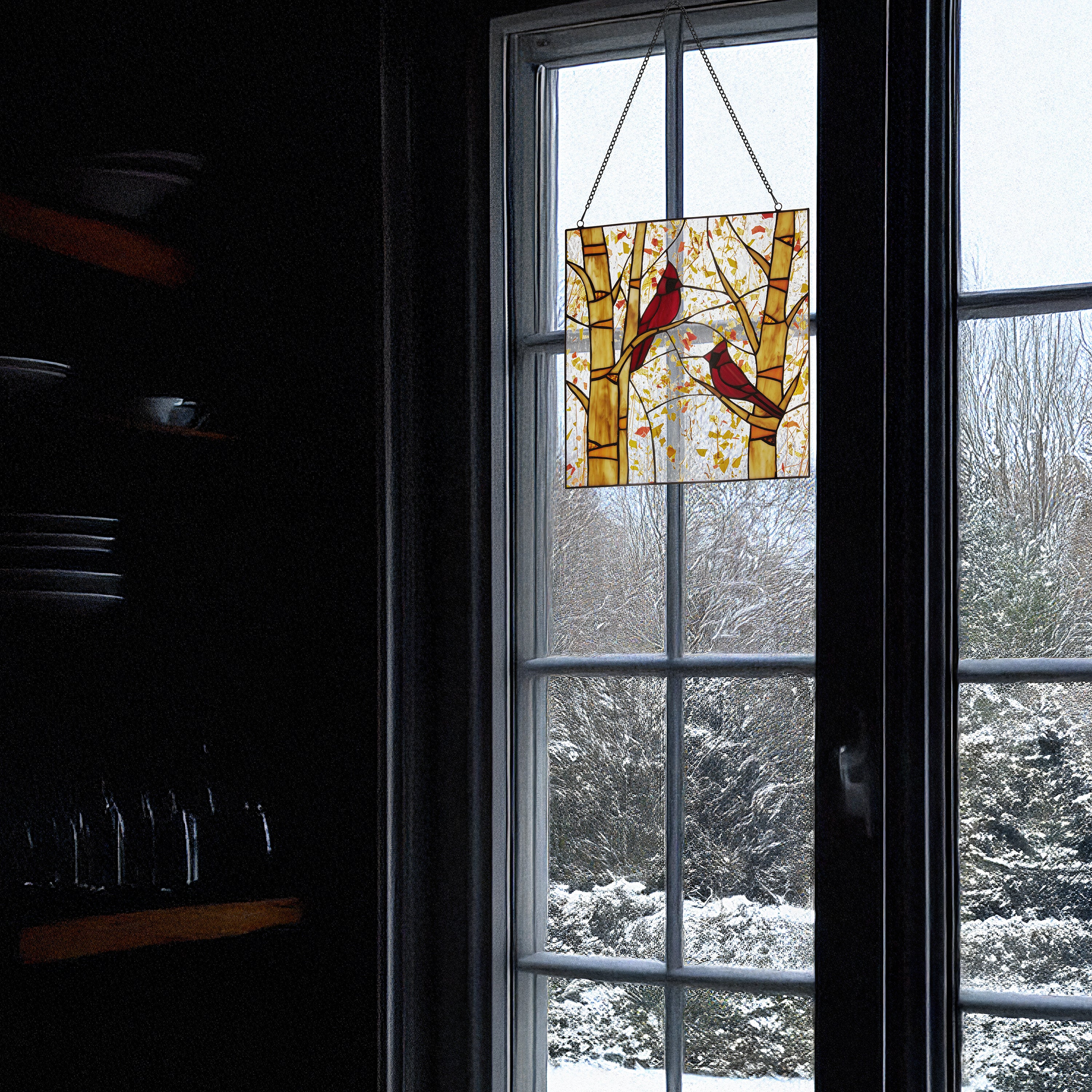 It's an autumn scene among the falling leaves for the two red cardinals in this unique, square-shaped stained glass window panel you'll treasure for years to come. Created with 92 individual textured stained glass cuts in red, white, and orange hues against a clear, yellow and orange confetti glass background that transforms when light shines through. This artisan decor piece can be hung in your favorite window with the included 26-inch metal link chain. Perfect for a sunroom, library or den.