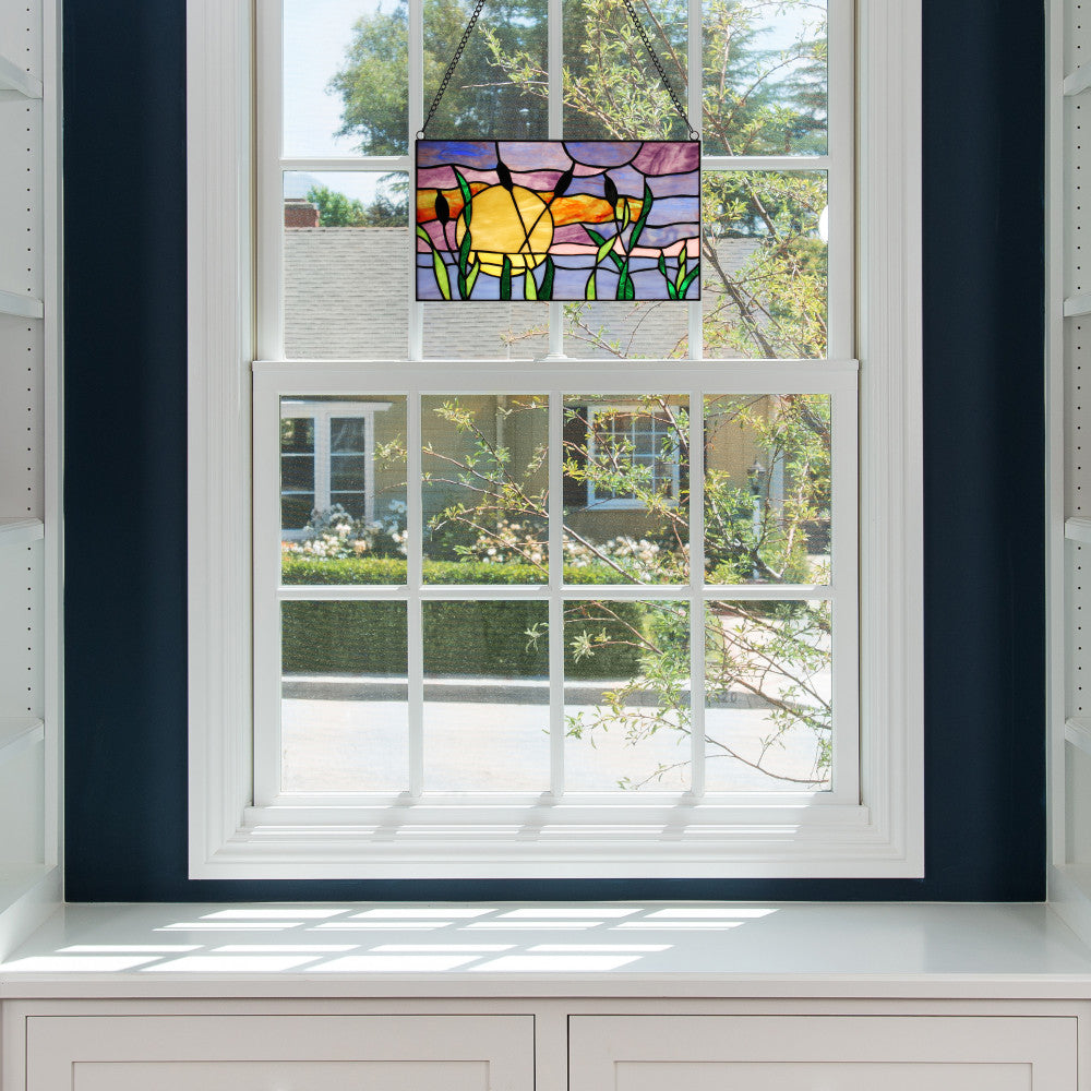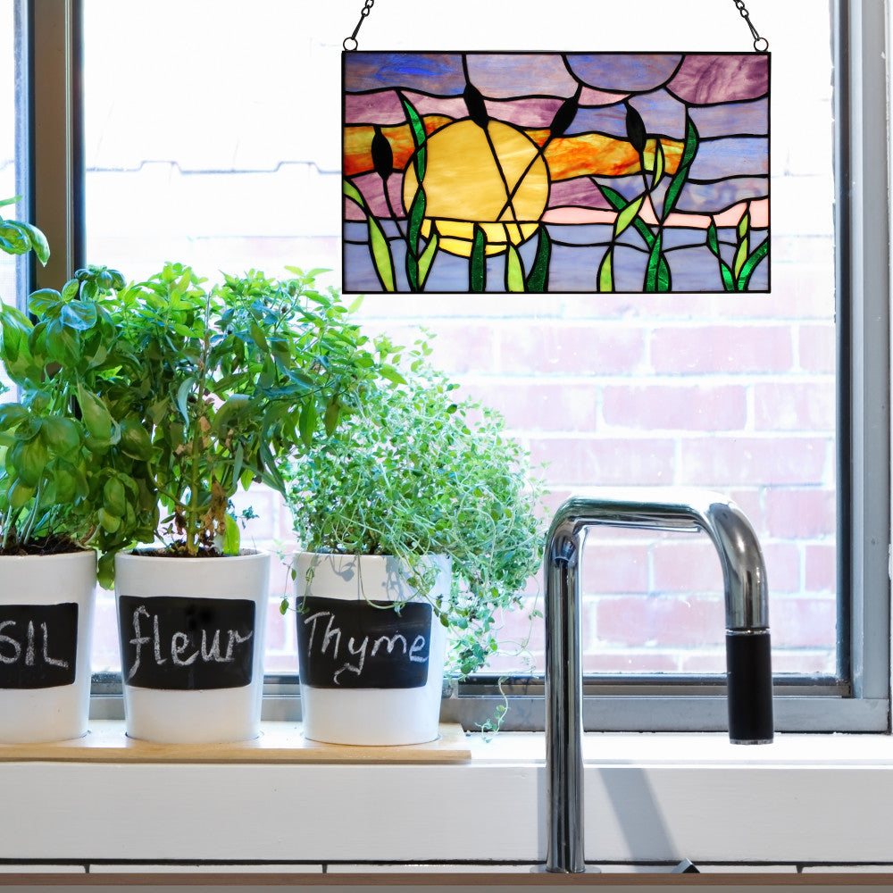 This lovely nature-inspired stained glass window panel showcases cattails in a pond at sunset. Crafted from metal and 92 textured Tiffany-style glass cuts, it makes the perfect addition to your kitchen, living room or bedroom — anywhere you've got a sunny window that will let natural light filter through. Simply hang it with the included 26-inch metal link chain and watch your space fill with a colorful kaleidoscope of light.