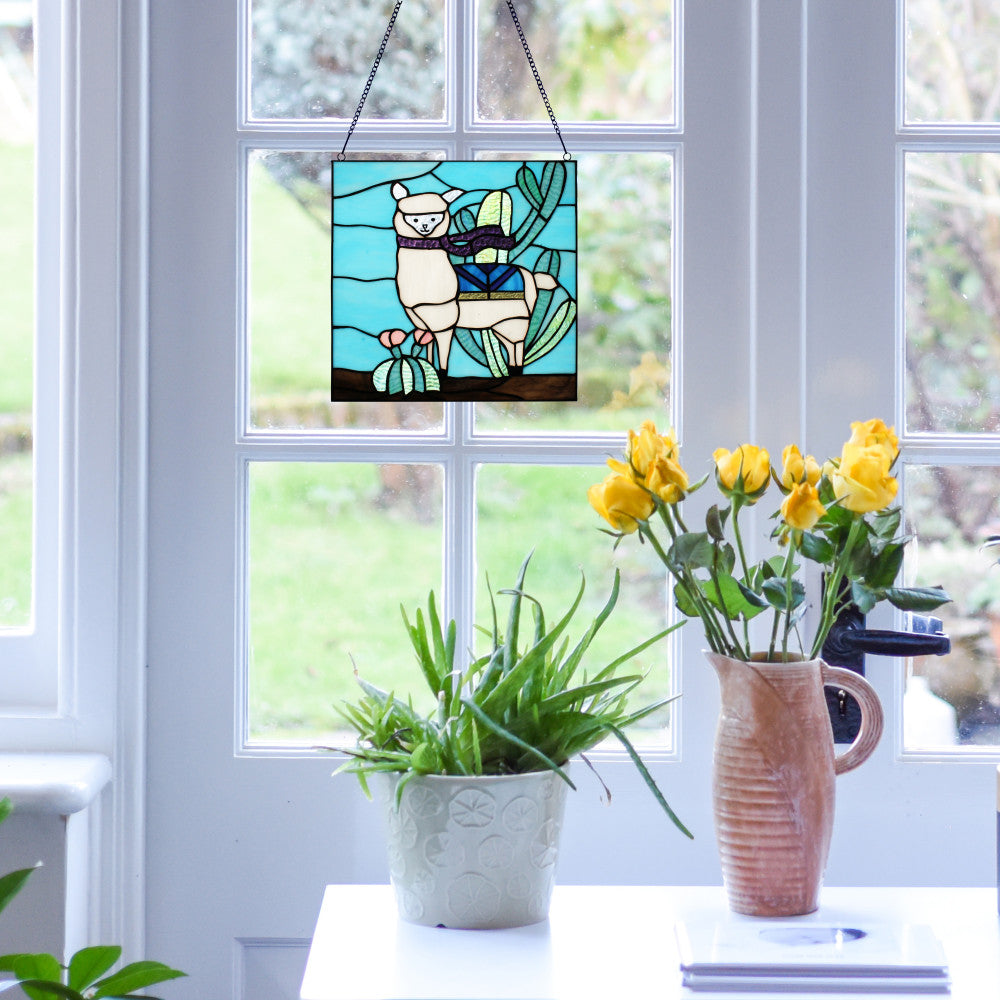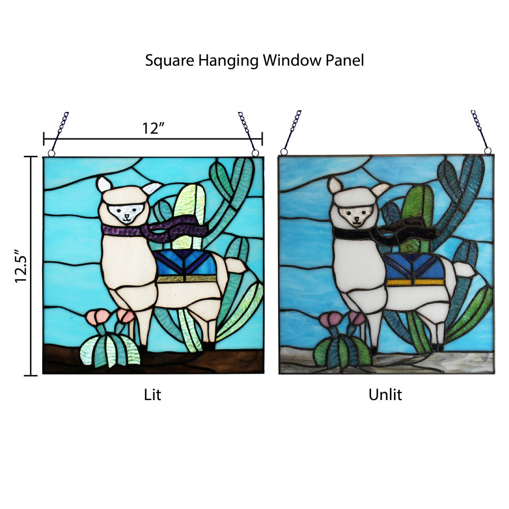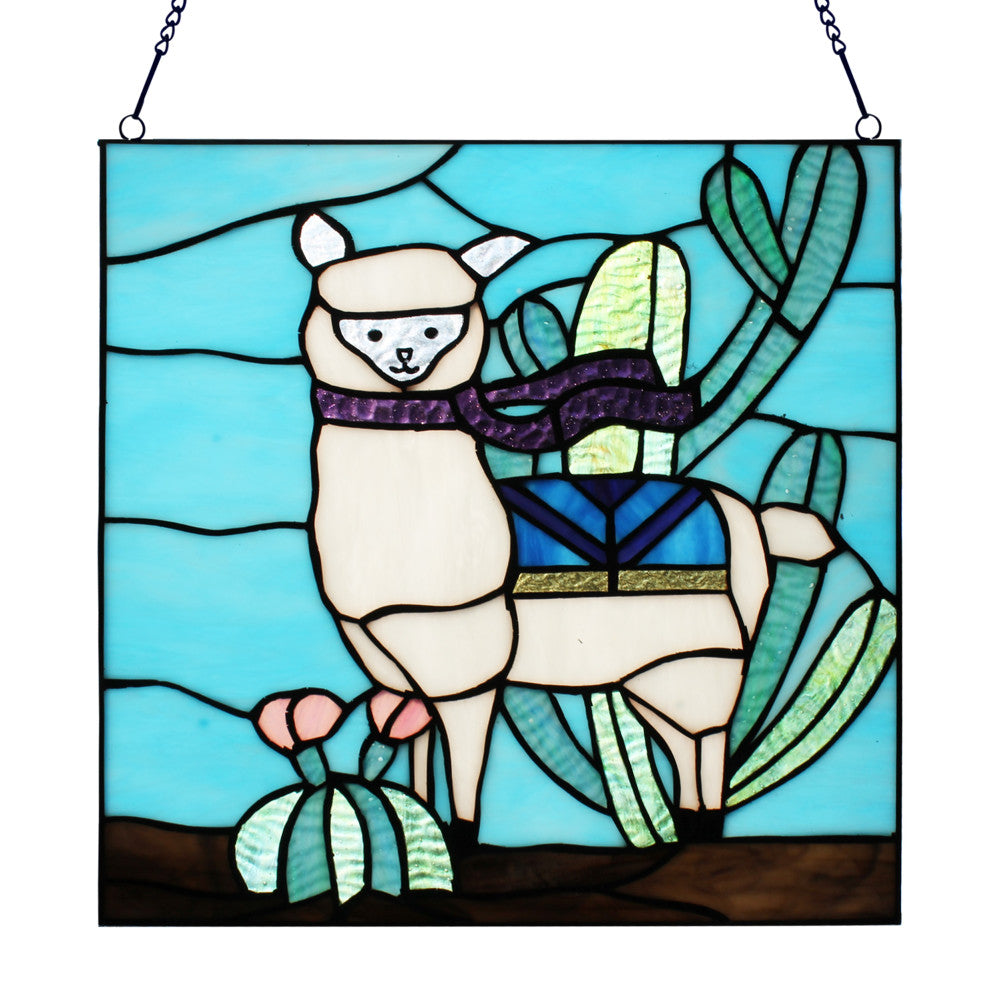 Show off your whimsical side in your home decor with this stained glass window panel featuring a llama in vibrant hues of Tiffany-style glass in white, blue, green and purple. The happy llama stands in a landscape with multiple green cacti, a blue saddle blanket and a fun flowing scarf. Handcrafted from 98 individual glass cuts, this 12.5-inch-high stained glass panel is created using artisanal soldering methods. A metal link chain is included for immediate hanging, whether in a sunny kitchen window, a bedroom or against an illuminated wall in a sunroom for fun and colorful appeal.