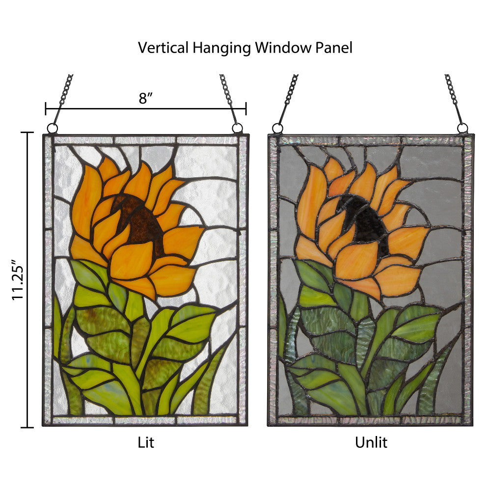 Bring the timeless elegance of a sunflower to your home by hanging this stunning vertical Tiffany style stained glass window panel in a sunny window. Handcrafted using traditional artisan methods, this piece features 79 individual textured stained glass cuts in shades of yellow, green and brown against a clear glass background. Hang the panel in your sunniest window using the 23.5-inch metal link chain, and watch the vibrancy of this nature-inspired work of art come to life.