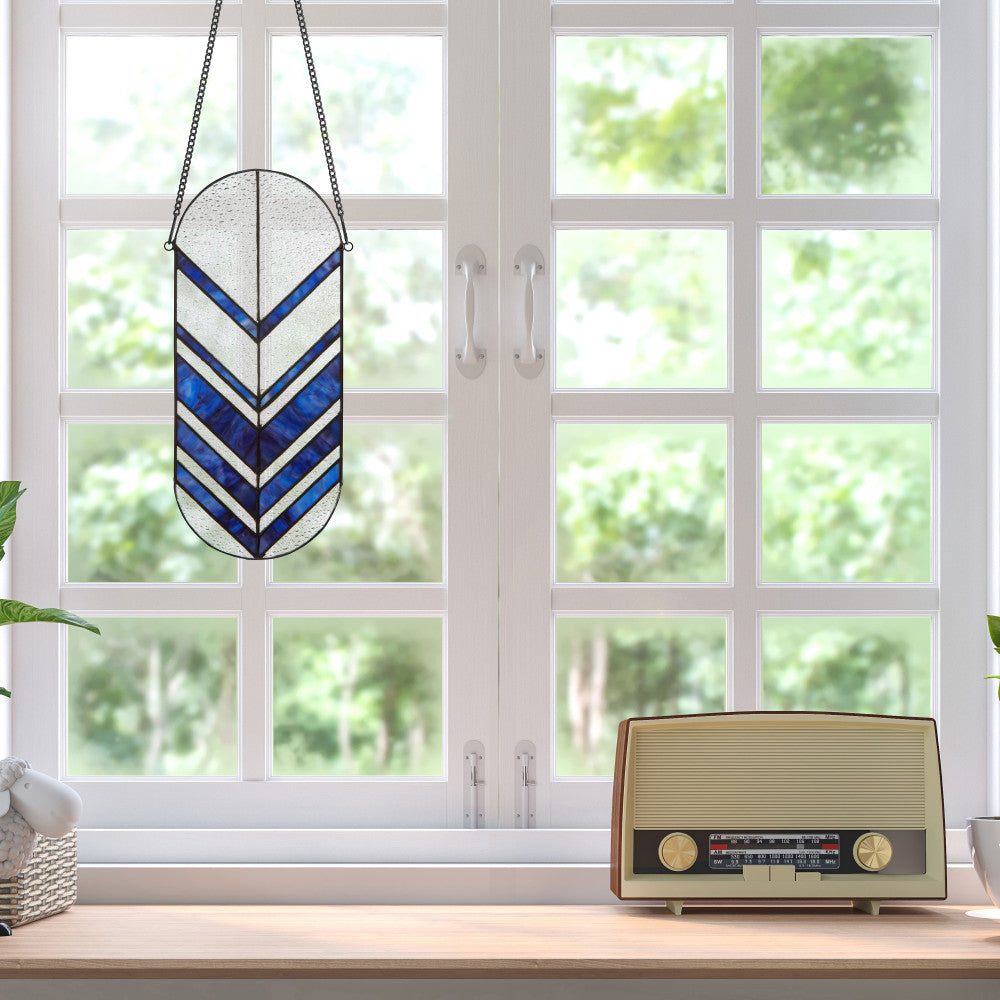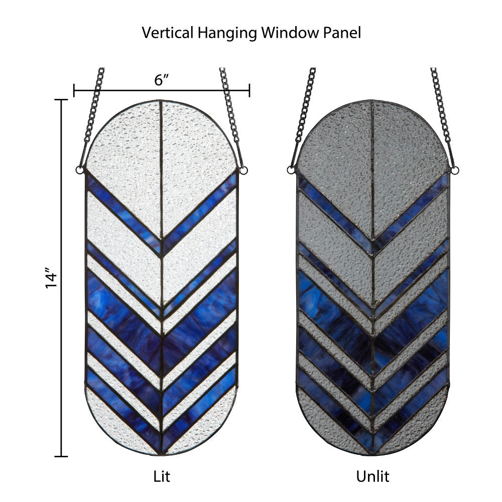 This vertical stained glass window panel showcasing a cool geometric design makes a great pairing with your existing modern or transitional decor. Made with 22 individual hand cut textured glass pieces, it's designed with contrasting blue and clear arrows of varying widths. Easy to hang from any sunny window with the included 30-inch metal link chain, it will fill your space with bright bluish light.