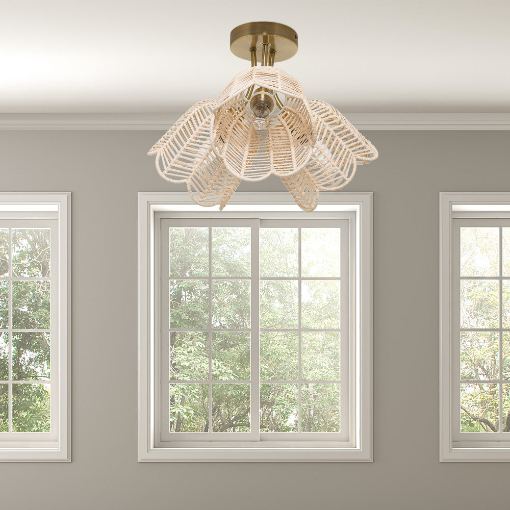 11.5"H Gold-Colored Metal Ceiling Light with Rattan Shades