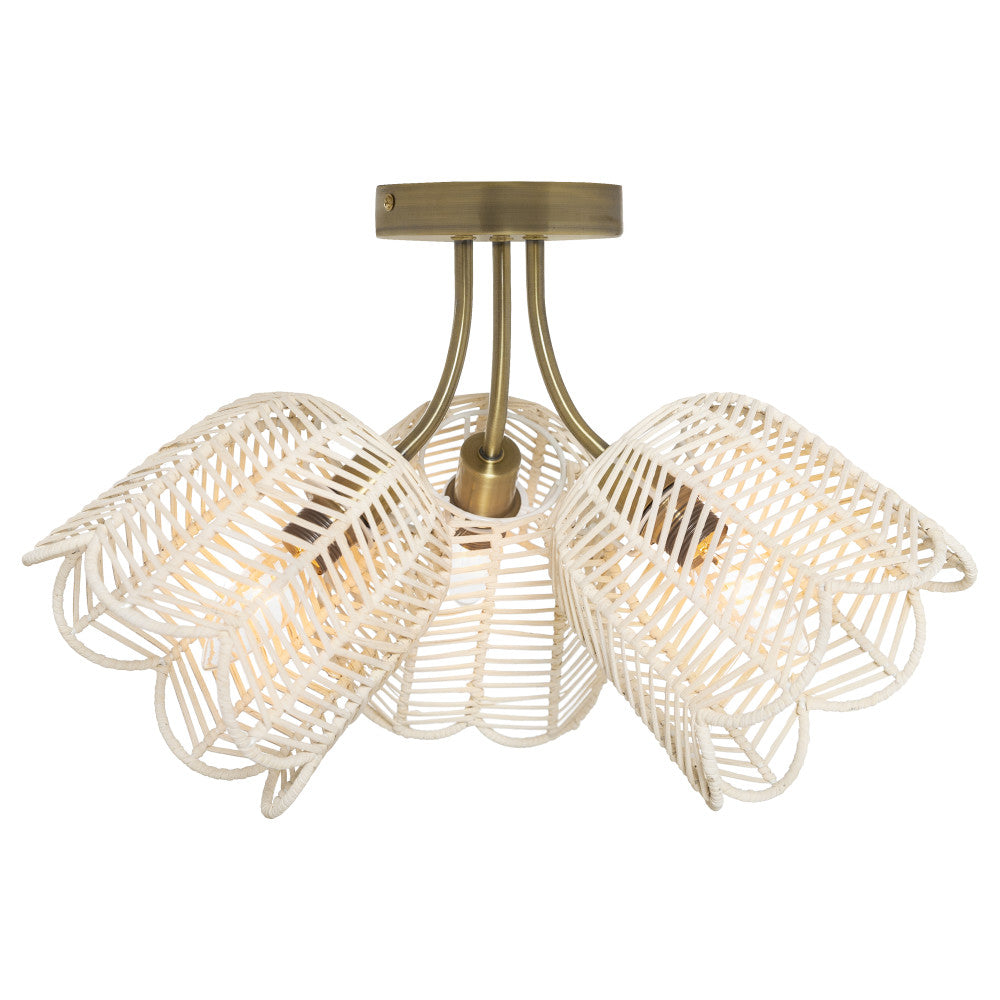 If you prefer a cottage style that's a little less "shabby" and a little more "chic," you'll love the look of this ceiling light. Featuring a brushed gold-tone circular metal fixture that extends three arms to hold three white, bell-shaped rattan shades, this hardwired ceiling light adds a little romance to a range of interior decor styles. The rattan shades’ open-weave design will create a soft glow when the light from each of the three 40-watt bulbs (not included) shines through. Hardwire this light directly into the ceiling above your bed, in your powder room or en suite, or in a kitchen or breakfast nook and enjoy the play of light and shadow that it provides.