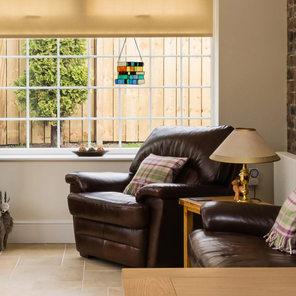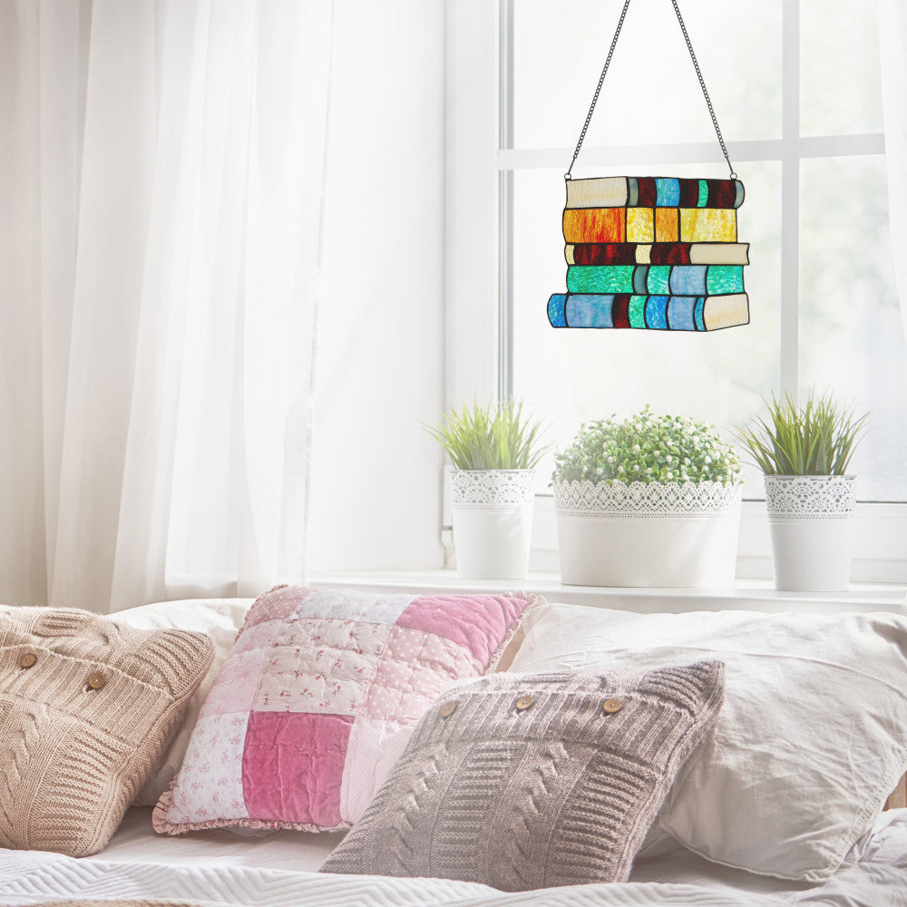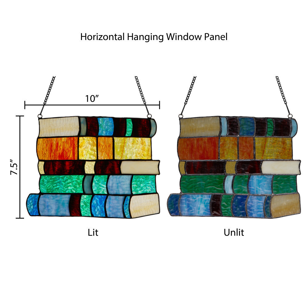 Create a cozy reading nook by hanging this lovely stained-glass panel fashioned in the shape of a stack of colorful hardcover books. This Tiffany style stained glass window panel is made with 30 individual glass cuts of textured and striated stained glass in rich orange, red, blue and green hues that come to life when they catch the light. Crafted using traditional artisan stained glass and soldering methods, it's easy to hang in your home office, bedroom or library window from the included 23.5-inch metal link chain.