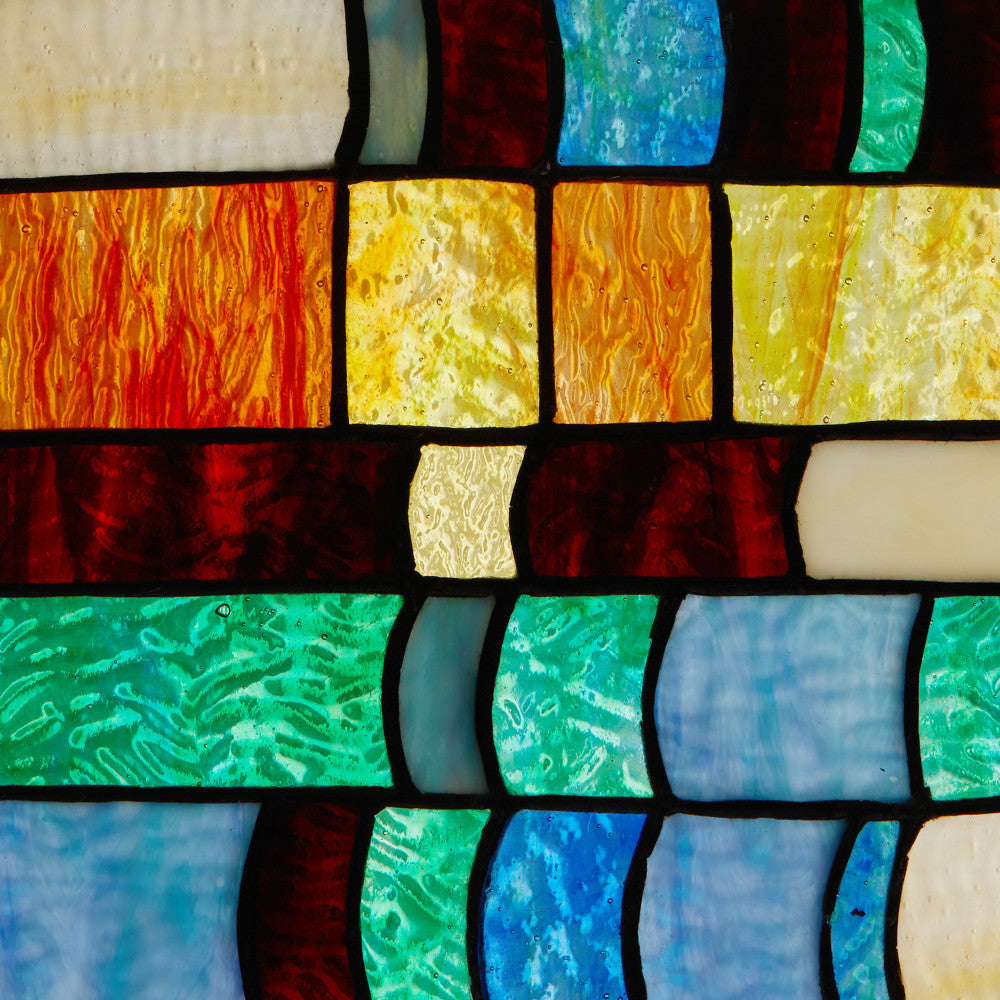 Shades of orange, blue, green, white and red textured and striated stained glass
