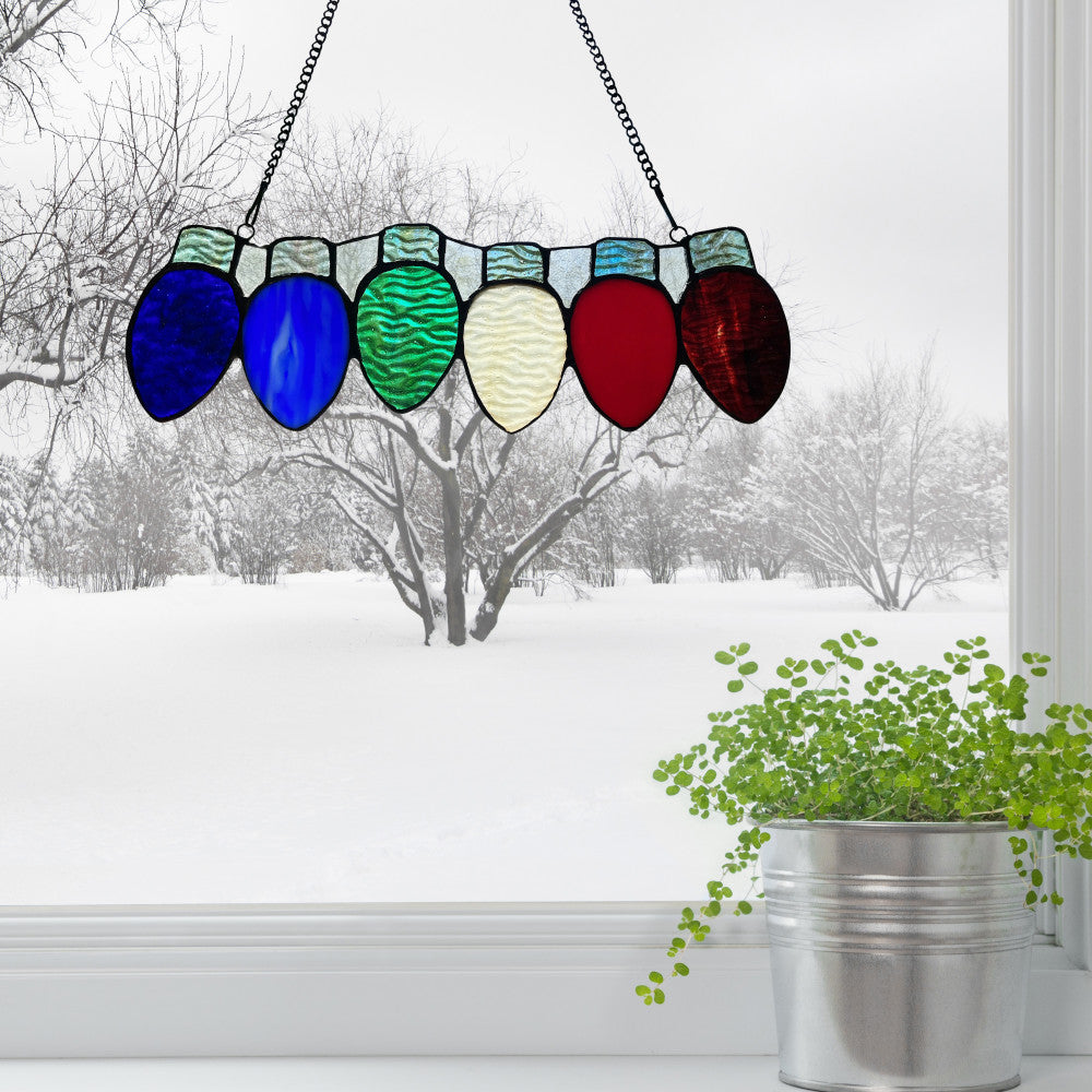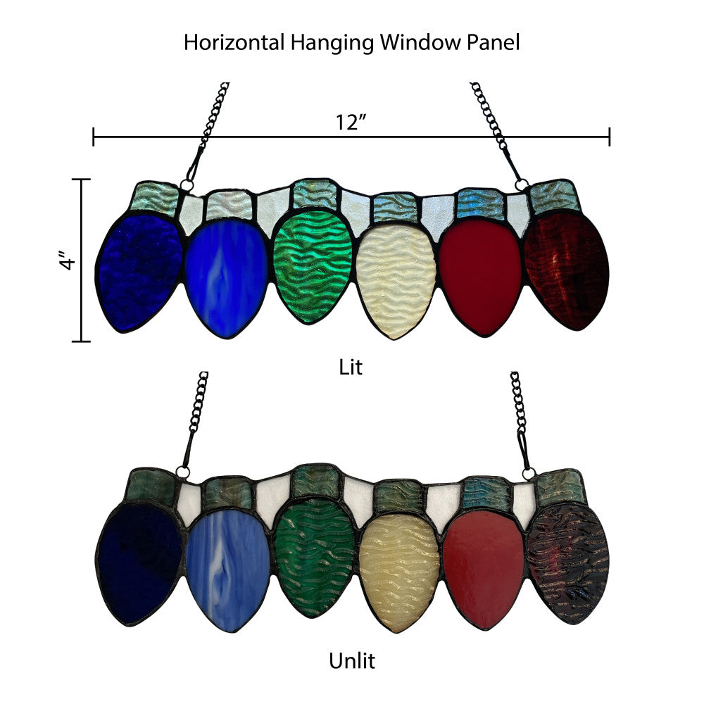 Nostalgia for the holiday decorations of years gone by has been captured in a handcrafted stained glass panel with this design depicting a string of six old-fashioned, bulb-shaped holiday lights. Fashioned from 17 individual cuts of textured Tiffany-style stained glass in red, orange, blue and green hues, this 12-inch long horizontal window ornament is artisanally set in black iron to accentuate each glass color. Hang it in a bright window as your latest addition to your holiday decor, one that can be passed on through your family for years to come.