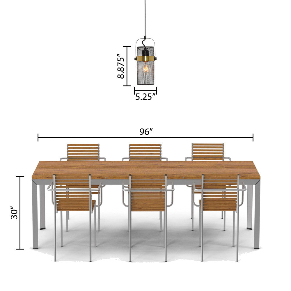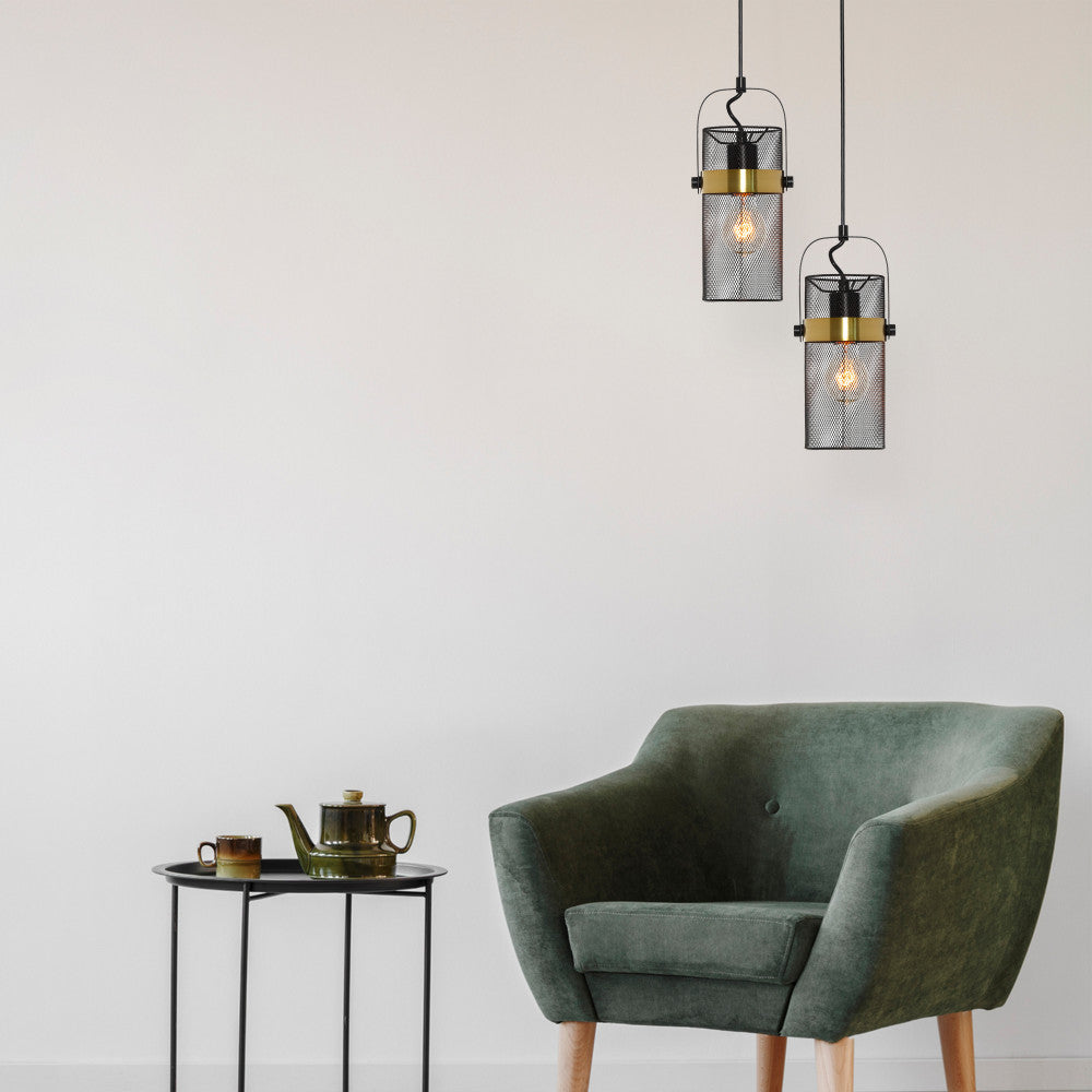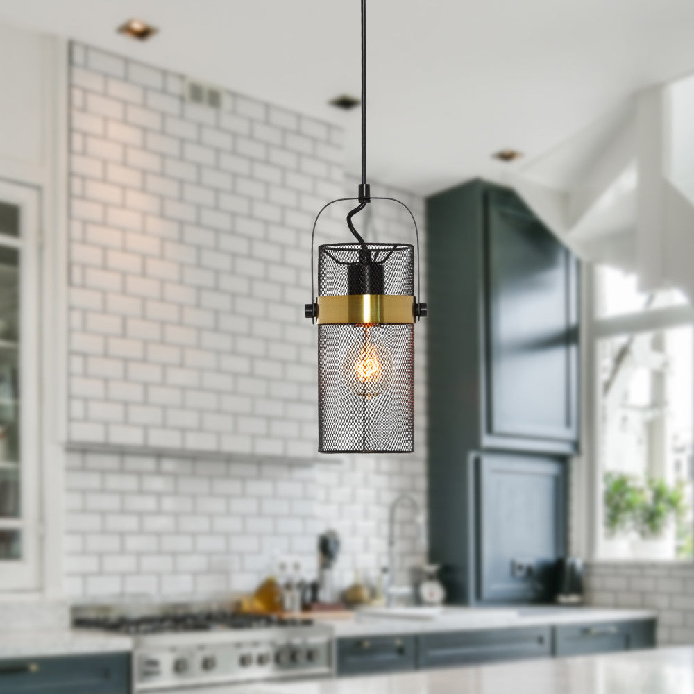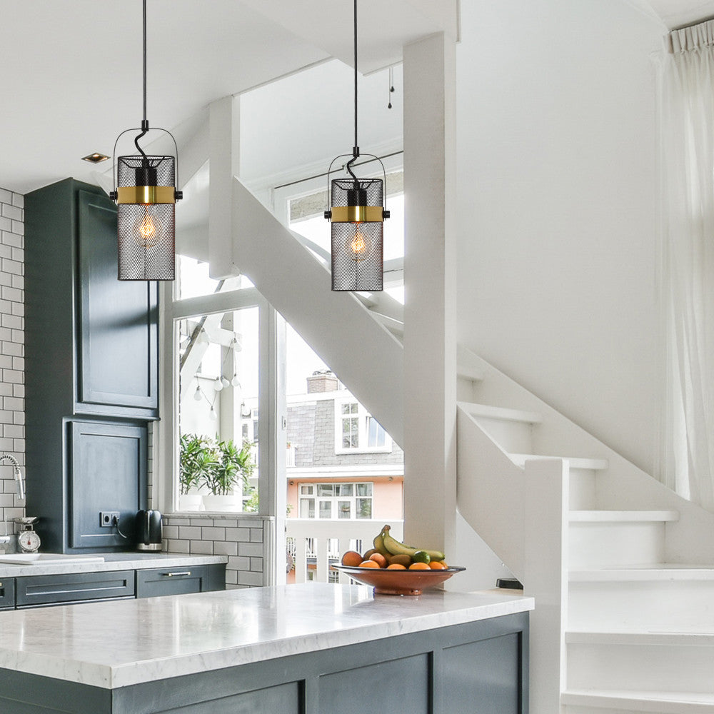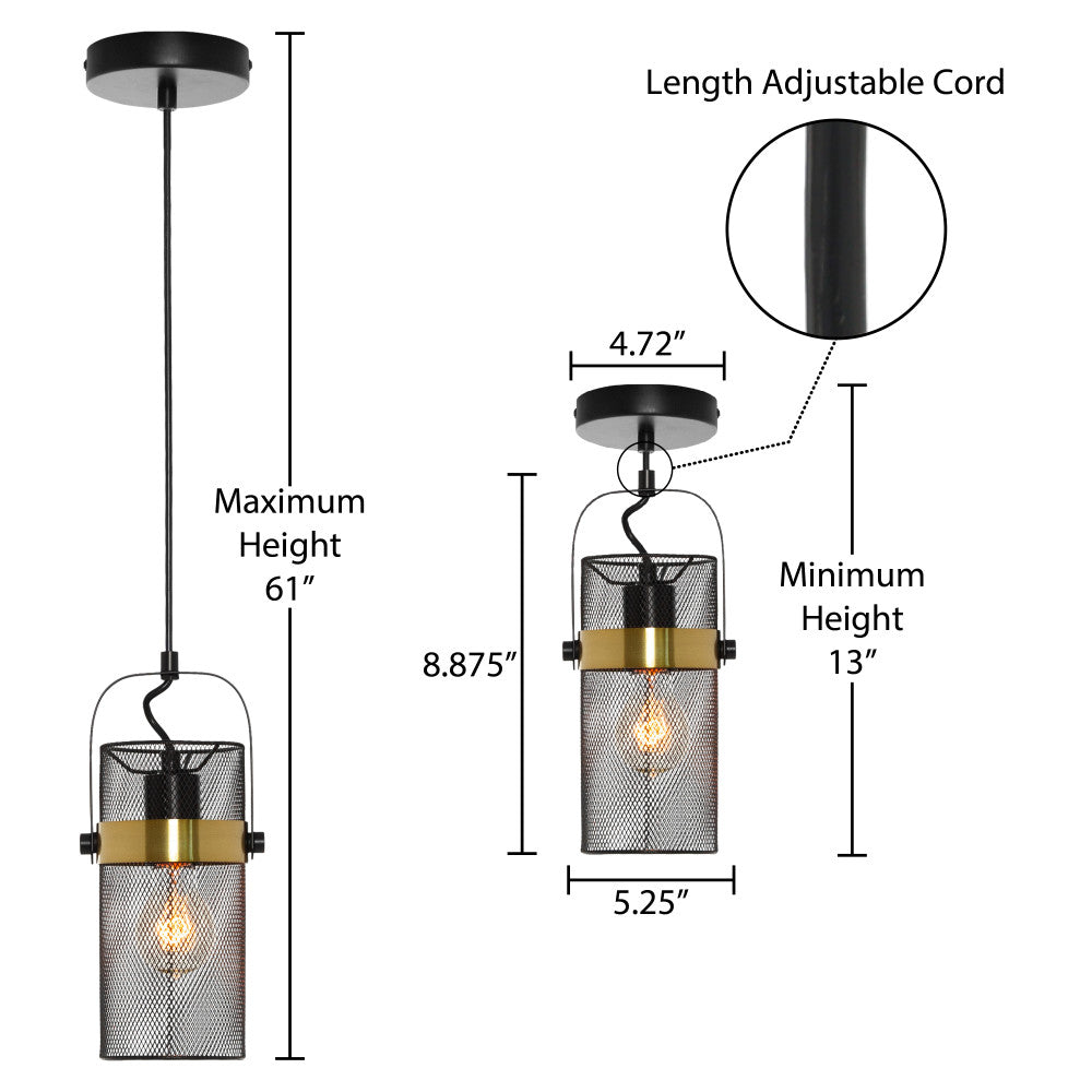 If you love industrial decor, this hanging pendant light makes an ideal choice. The black-painted metal base connected to the glass-free, drum-shaped black mesh shade with a gold-painted metal band offers a standout look with a touch of contrast. This impactful pendant light is a perfect choice for hanging above your dining table, or for welcoming guests in an elegant entryway. The allover mesh design of the drum-shaped metal shade forms a modern pattern while letting the light from one 60-watt bulb (not included), shine through, and the adjustable hanging wire allows you to alter the drop height to best fit your space.