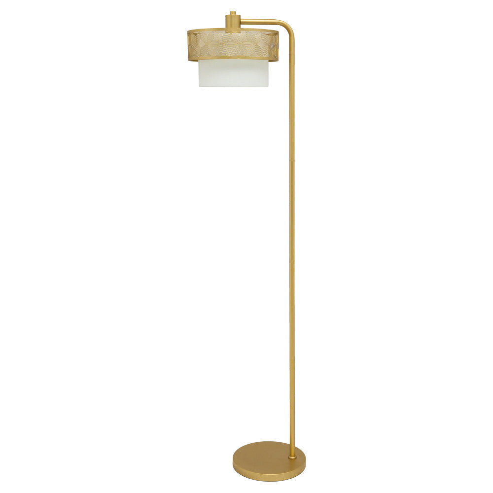 Add an elegant and functional lighting option to your living room or your bedroom with this glam floor lamp. The lamp showcases a candlestick base made from gold-painted metal, and a mixed-material drum shade with a gold-painted cutout band surrounding the top of the white fabric peeking underneath. A 90-inch cord with an easy foot switch allows for versatile placement.