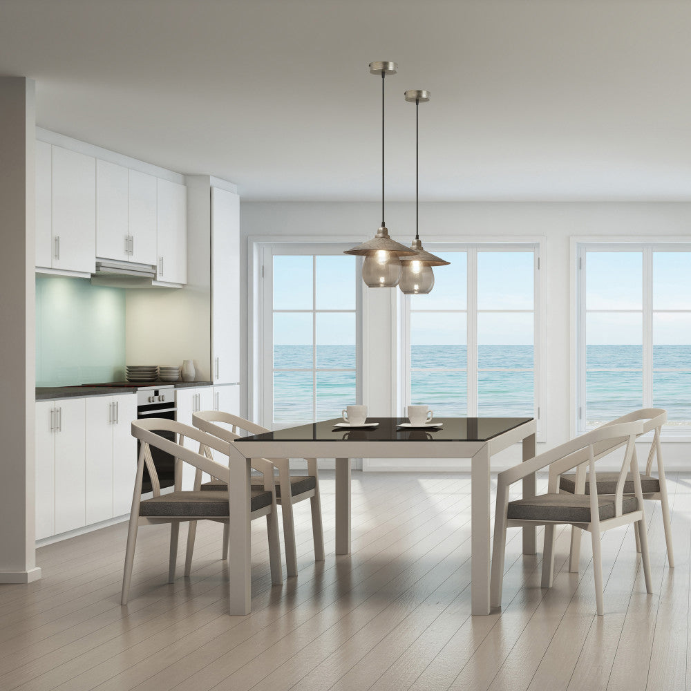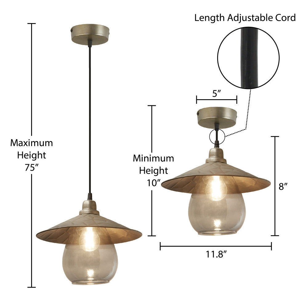 Bring a bohemian-inspired touch to your interior lighting with this hardwired hanging pendant light. Designed with a silver-finish metal canopy and a two-part shade with a weathered silver-finish metal piece overhanging a colored glass globe, it casts a warm glow with the help of one 40-watt Type A bulb (not included). A great pairing with industrial as well as bohemian decor, it also features an adjustable hanging cord that lets you set the drop height anywhere from 10 inches to 75 inches to best fit different spaces.