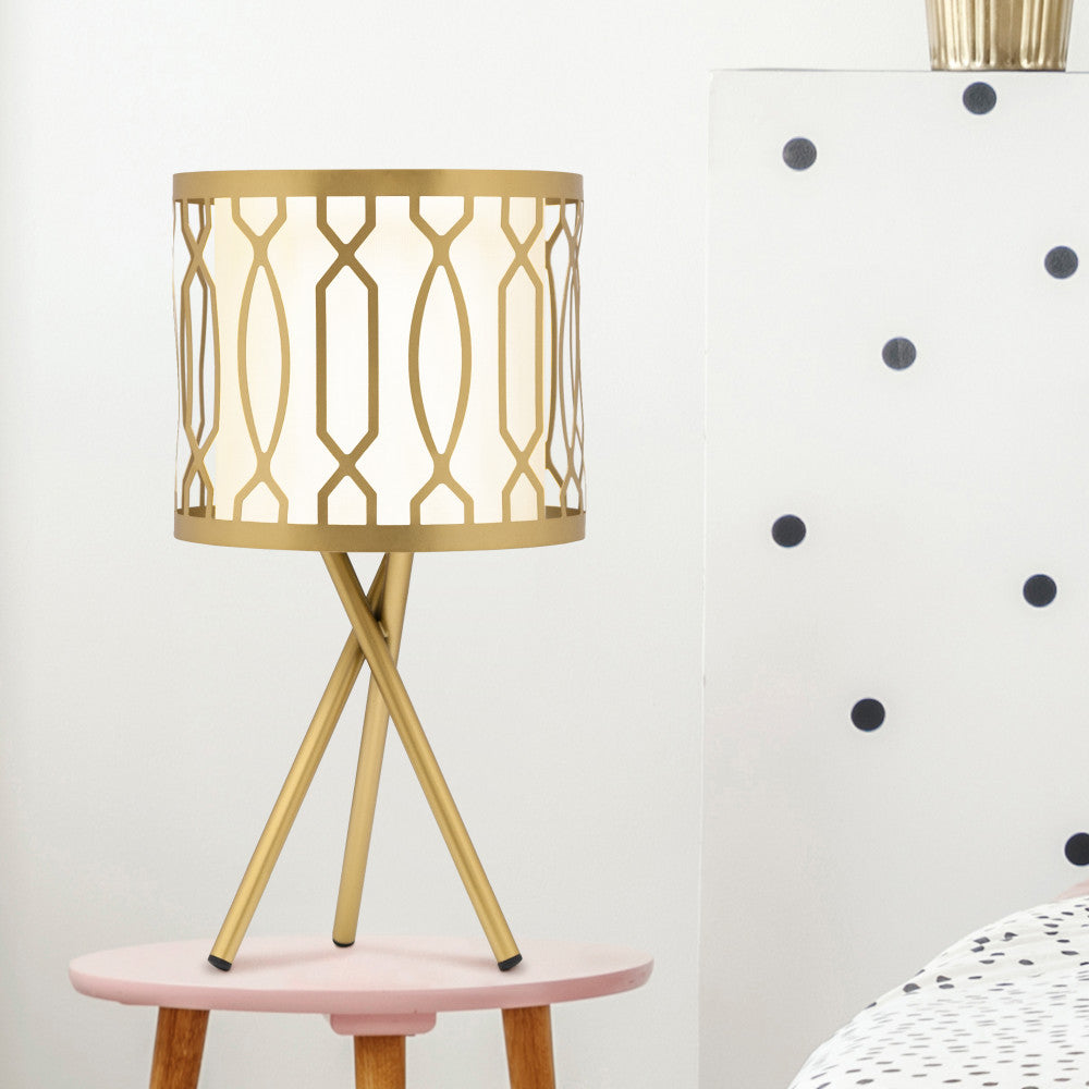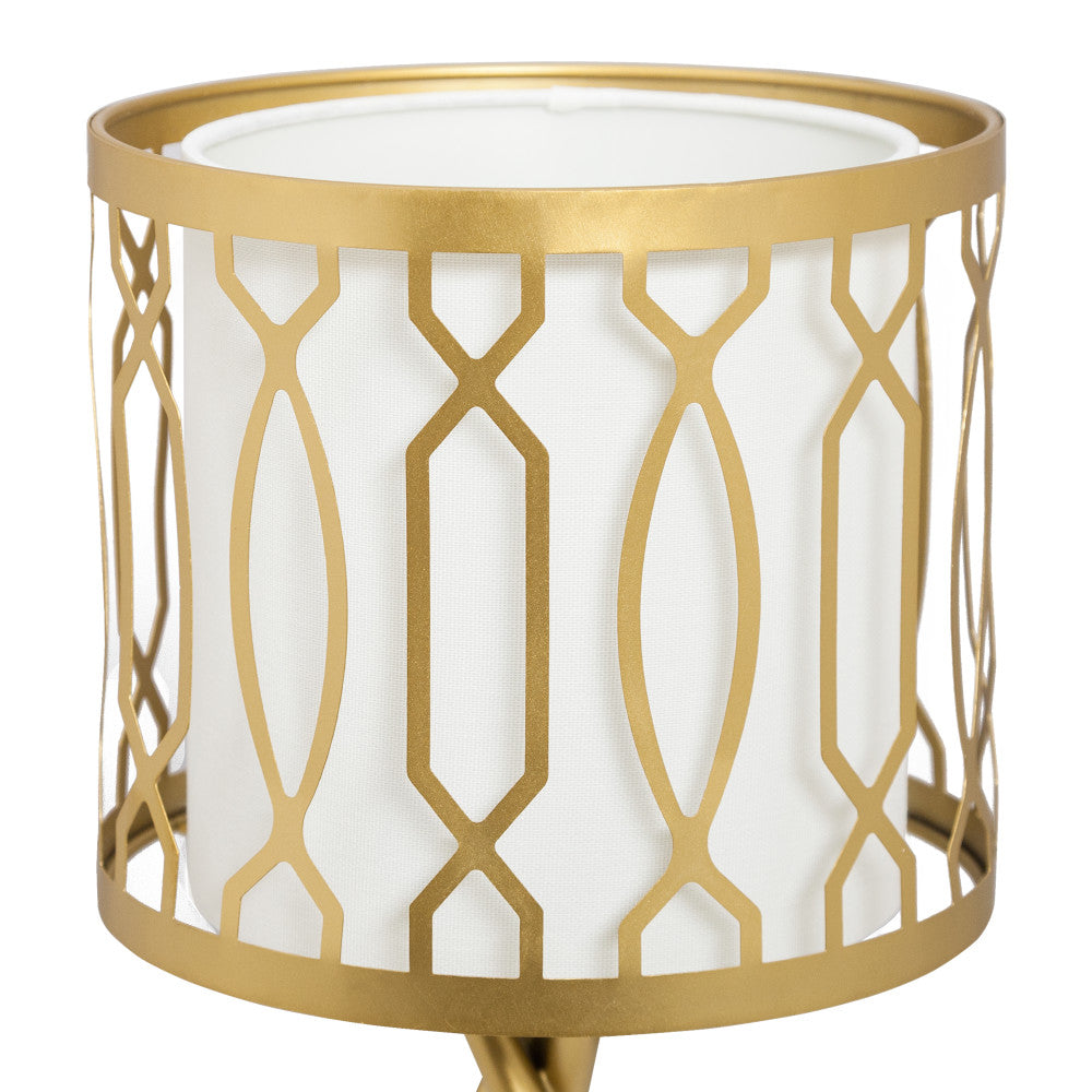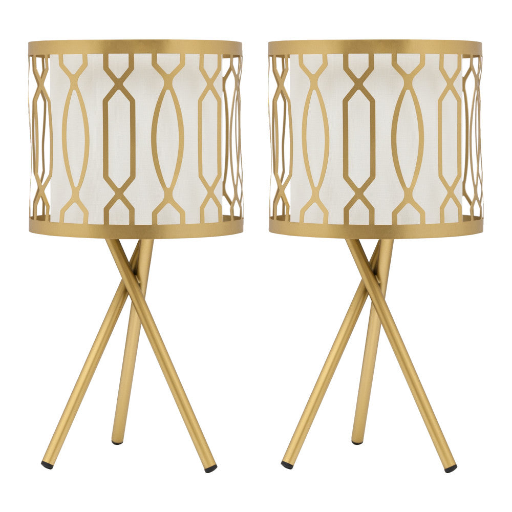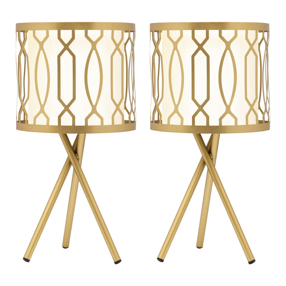 This set of 2 glam table lamps provides the perfect lighting solution for end or console tables in any room. Showcasing unique gold-painted metal tripod bases, as well as white fabric shades encased in gold metal cutout cages, each lamp emits a soft, warm glow with the help of a 60-watt Type A bulb (not included). A great pairing with modern or transitional decor, they're equipped with 60-inch power cords to allow for plenty of reach to the nearest wall outlet.