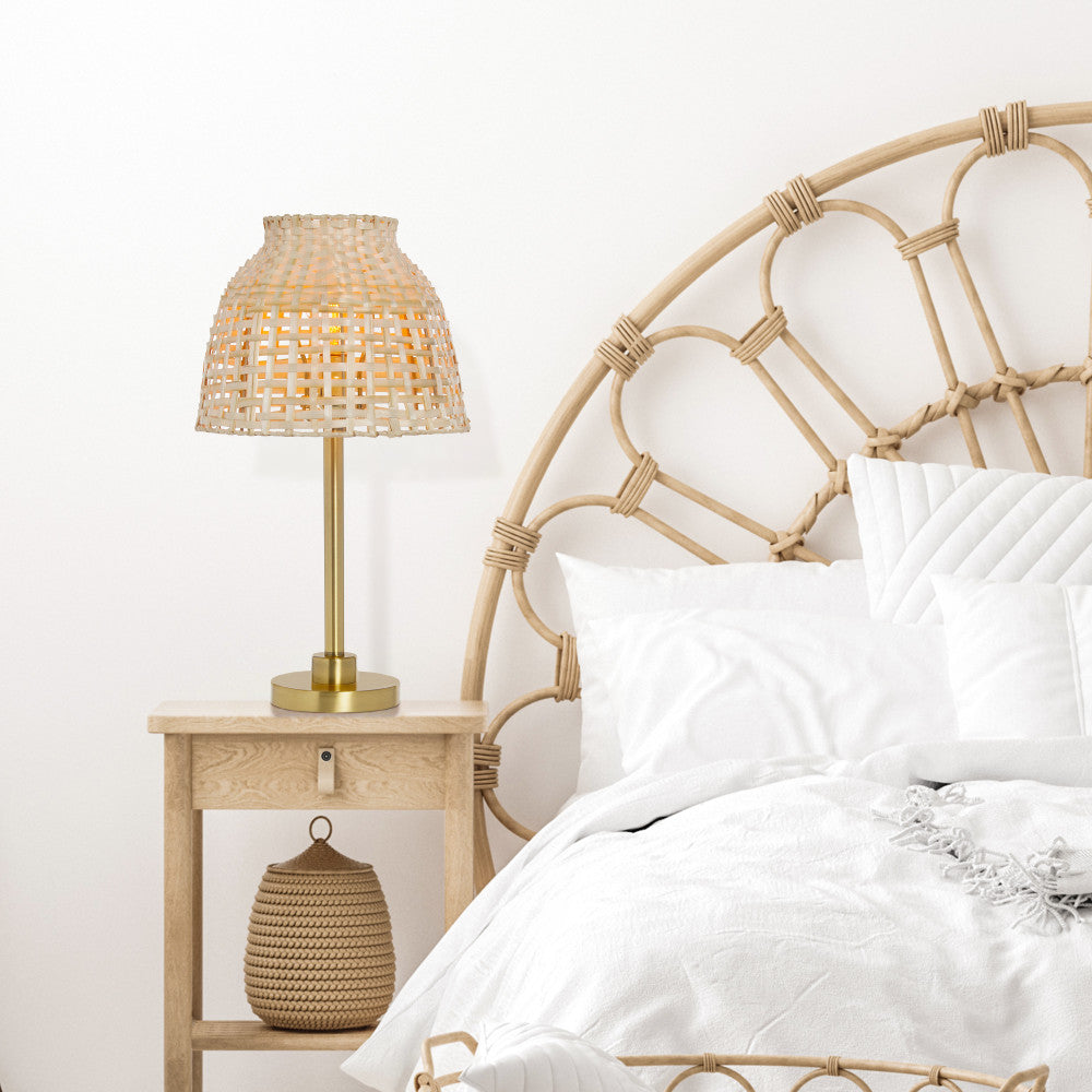 Give your Bohemian or beach-style decor a standout lighting update with this metal and bamboo table lamp. Showcasing a gold-finish metal base supporting a tan bamboo empire shade, the lamp will cast a soft, warm glow with one 60-watt Type A bulb (not included). The 60-inch power cord offers easy reach to the nearest wall outlet, and it's also equipped with an in-line switch for easy operation.