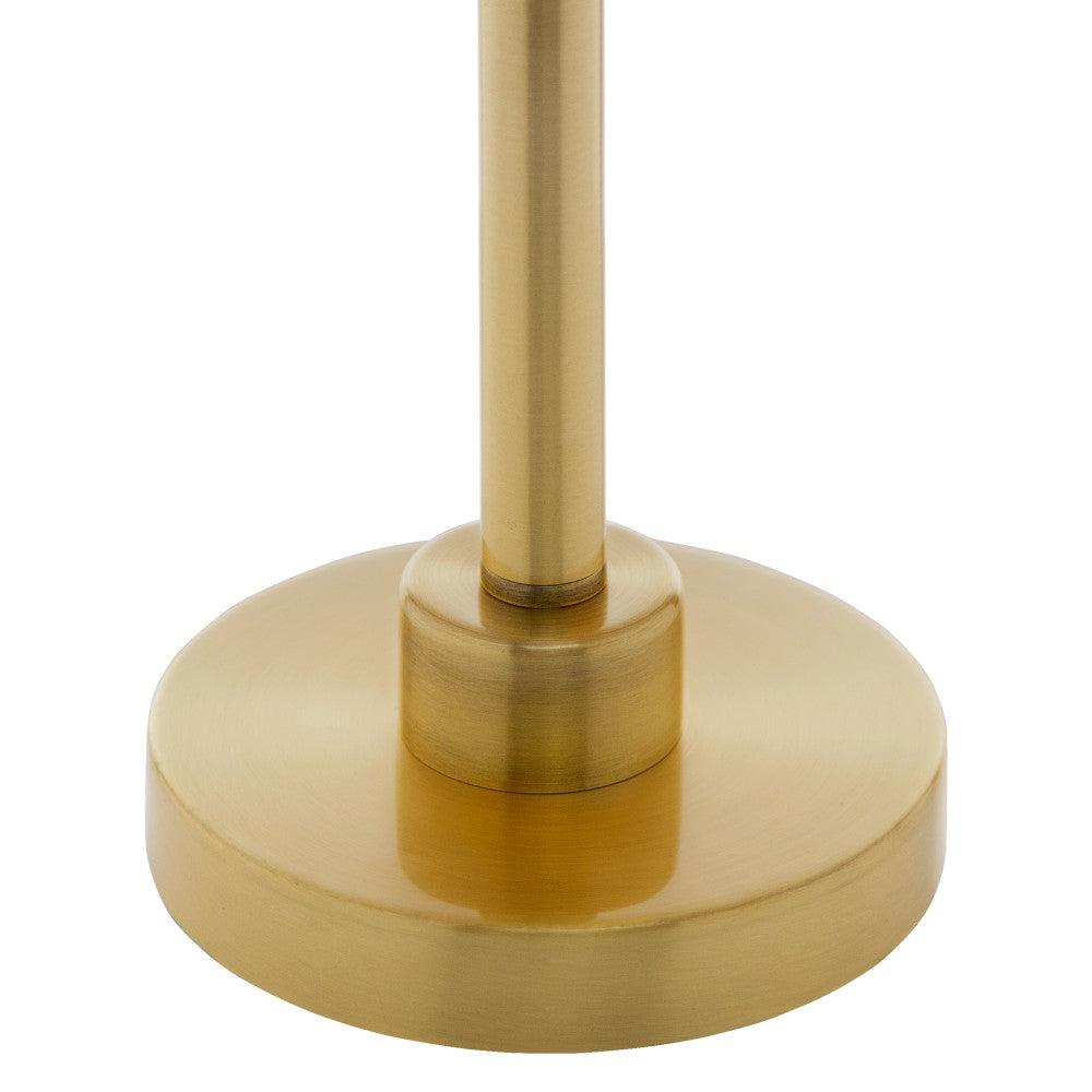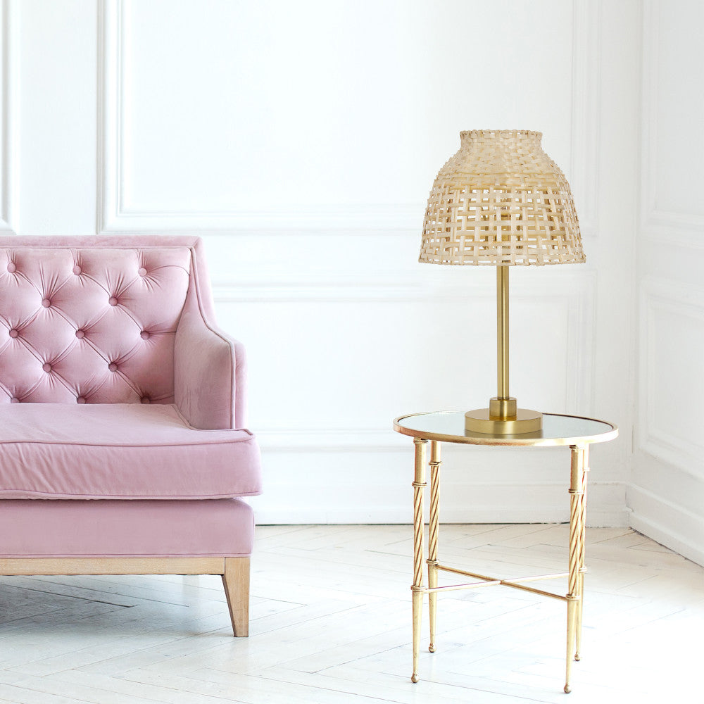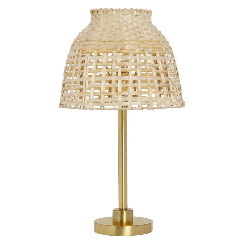 Brushed gold-finished metal candlestick base supports a natural bamboo empire shade