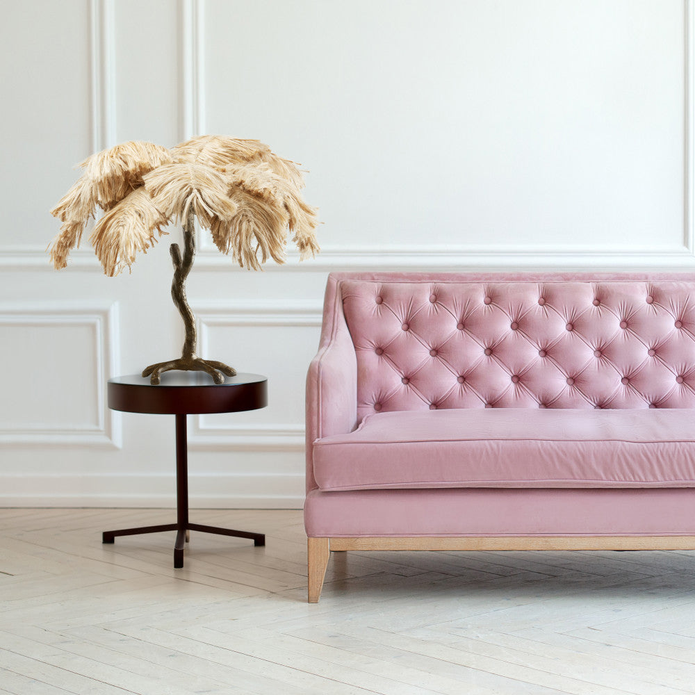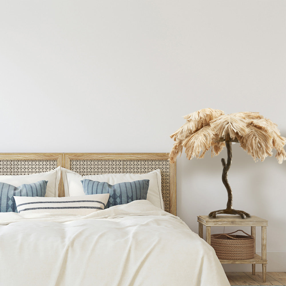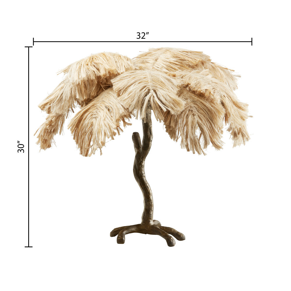 It's easy to bring some warm lighting and bohemian flair to your interior decor with this metal and jute table lamp. Made with an antique brass-tone metal base in a tree-shaped silhouette, this table lamp easily integrates into your existing decor. It features a palm tree-shaped shade made from light tan colored jute that lends interesting texture and glam style. Perfect for placing on an office desk, entryway console or a living room end table. Ambient lighting will shine nicely through the palm leaf shade and a 65-inch power cord provides convenient reach to a wall outlet.