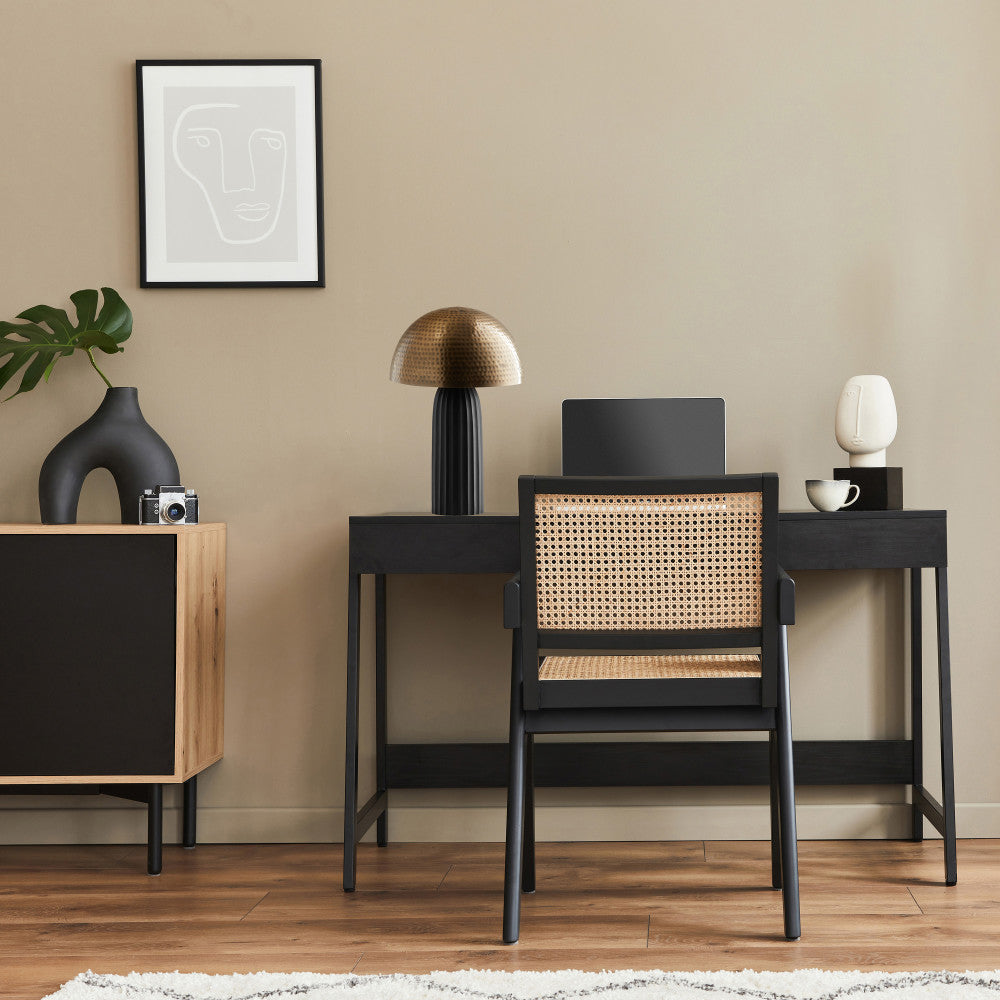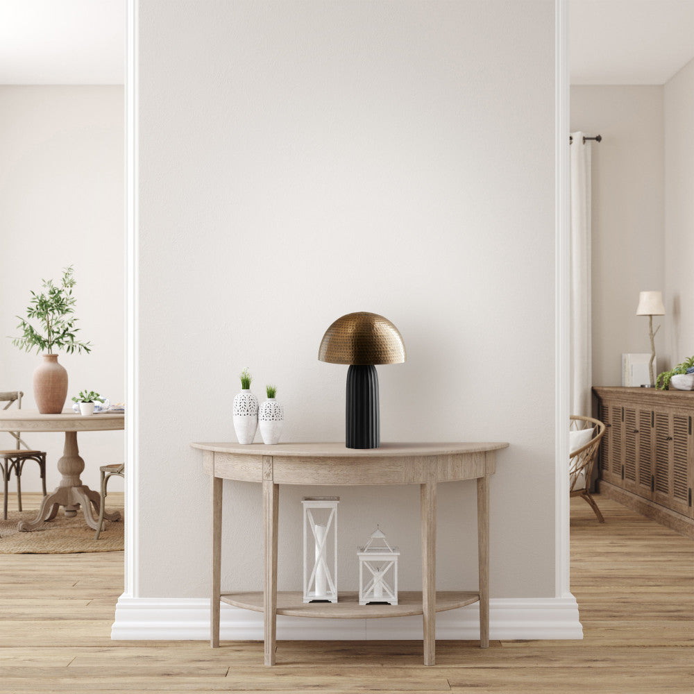 Update your lighting with the chic industrial style of this table lamp. Designed with a column-shaped base made from black metal and brass metal dome shade, the lamp offers a standout lighting option. It requires one 40-watt E26 bulb, and the shade is hand-crafted with a hammered look and texture. Best of all, the 65-inch power cord allows for easy and versatile placement in any room.