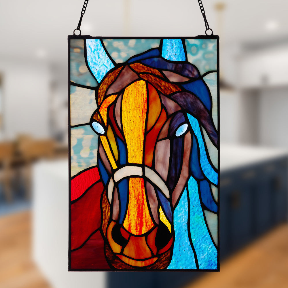 This stunning stained glass window panel showcases a majestic horse and is a great accent for cabin, lodge, farmhouse or bohemian decor. It features 68 individual glass cuts and two cabochons in orange, brown, purple, blue and teal hues that become more vibrant when light passes through the glass. Plus, this stained glass suncatcher is soldered together by hand to fill your space with color and unique textural appeal. It includes an attachable decorative hanging chain for easy display in any sunny window in your home.
