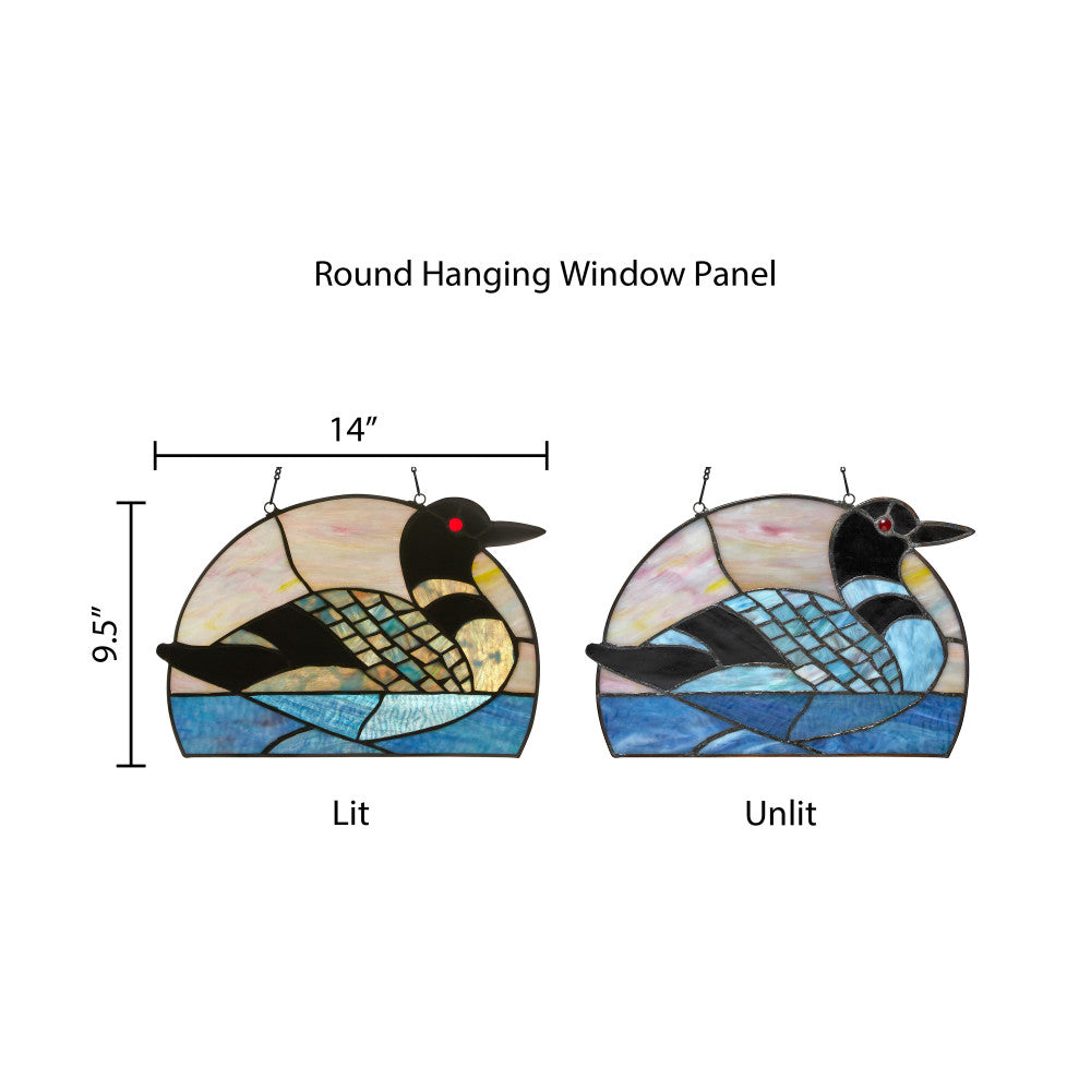 Hang this nature-inspired stained glass window panel in any sunny window to create a lovely focal point in your cabin, lodge, cottage or coastal style home decor. Handcrafted using a traditional artisan copper foil soldering method and 49 glass cuts in black, blue, yellow, and pink hues that become more vibrant when light passes through, this suncatcher showcases a loon in its natural water habitat. The stained glass panel comes with an attachable hanging chain for display so you can easily hang it on a wall or in a sunny window.