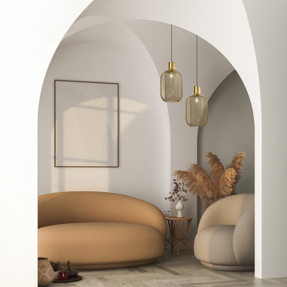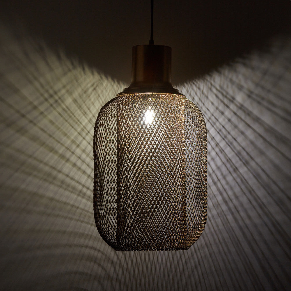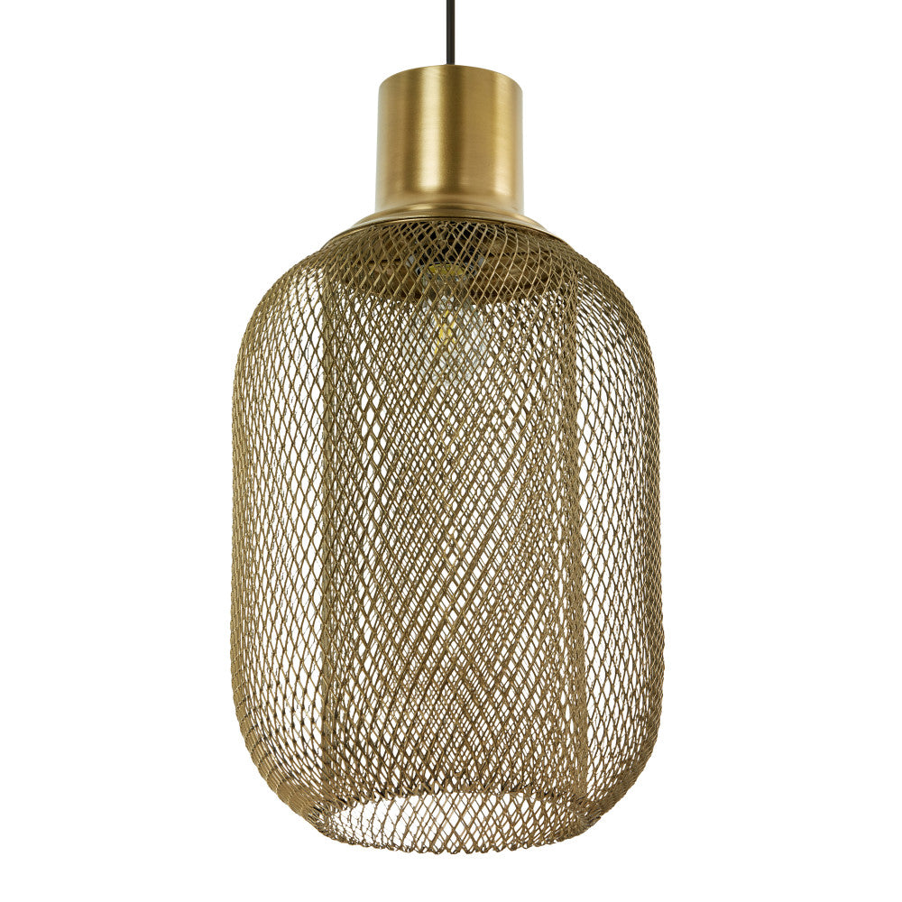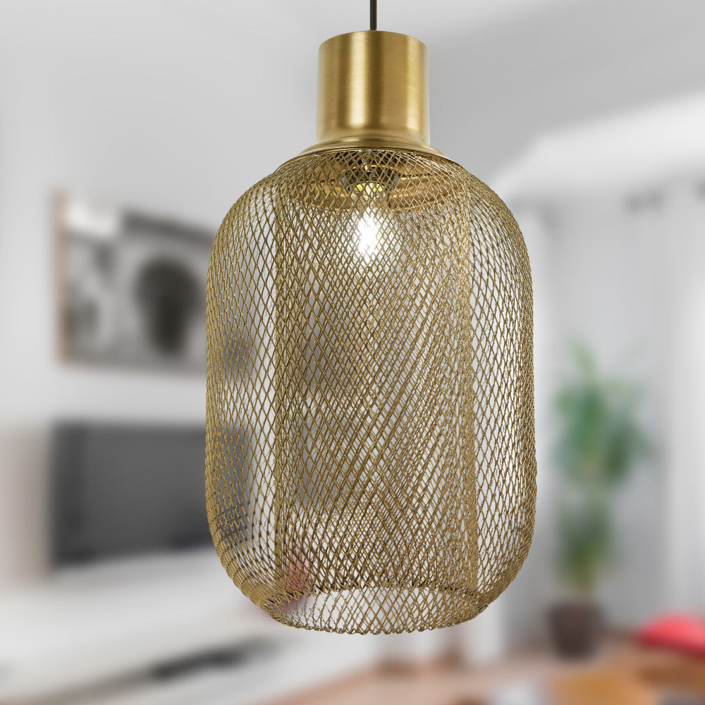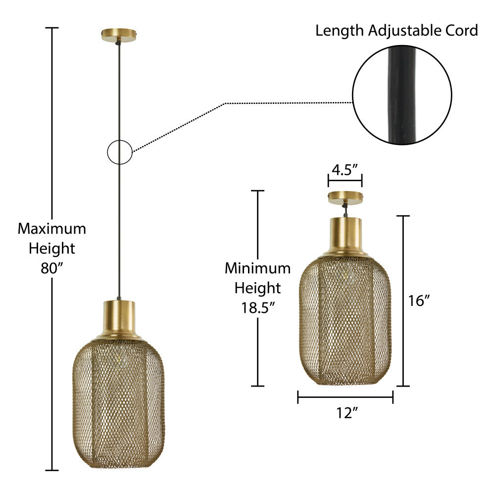 Add a touch of industrial style to your space with this unique pendant light. With an adjustable height that ranges from 18.5 to 80 inches, this versatile fixture can suit a variety of ceiling heights and room sizes. Its cylindrical shade is made of metal, featuring a unique mesh design that casts a multidirectional light. The light's gold finish enhances its sleek and modern aesthetic. It is designed to be hardwired into your ceiling and requires one single A type, 40-watt bulb (not included). It's perfect for creating a stylish atmosphere in any room.